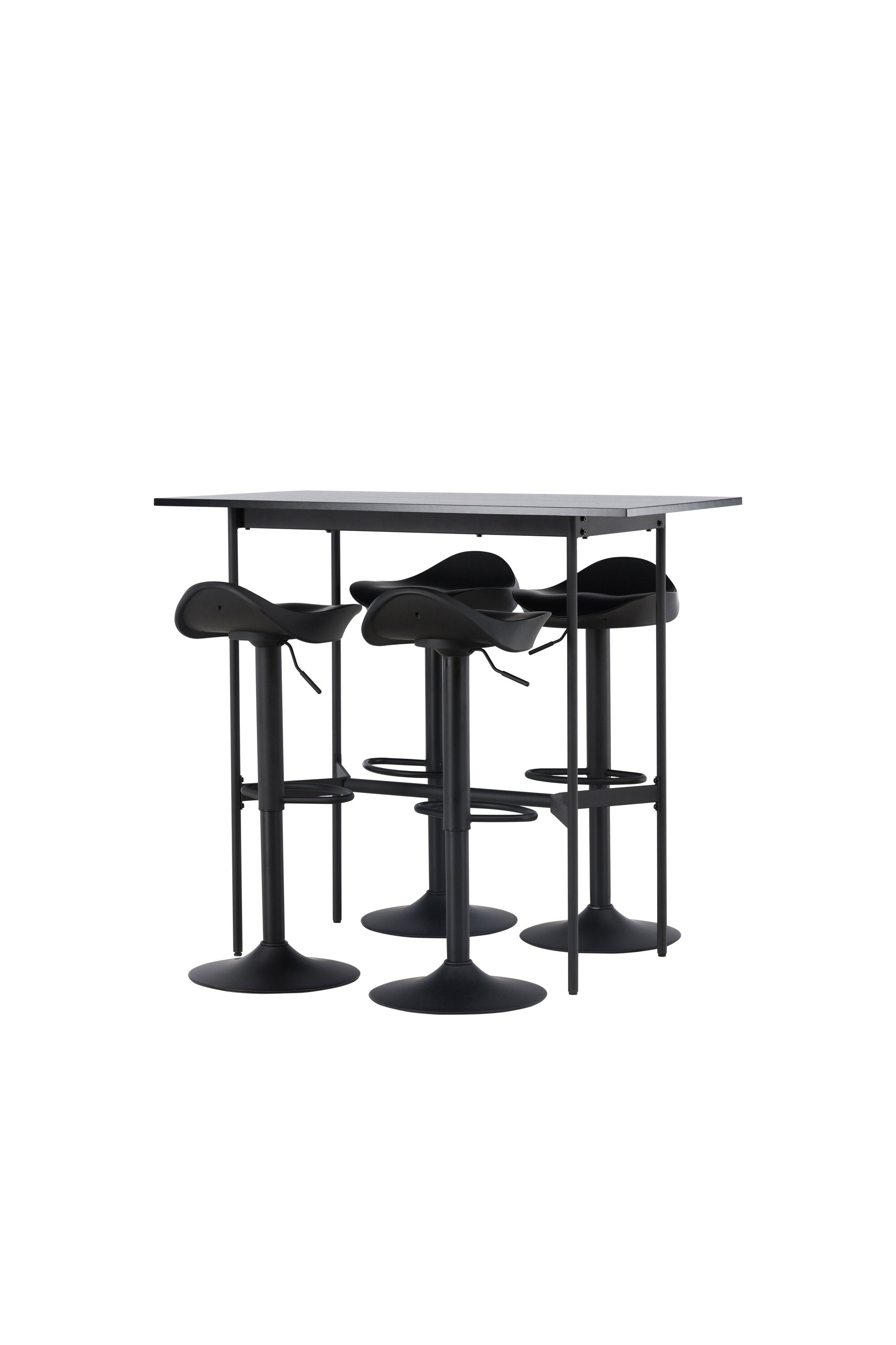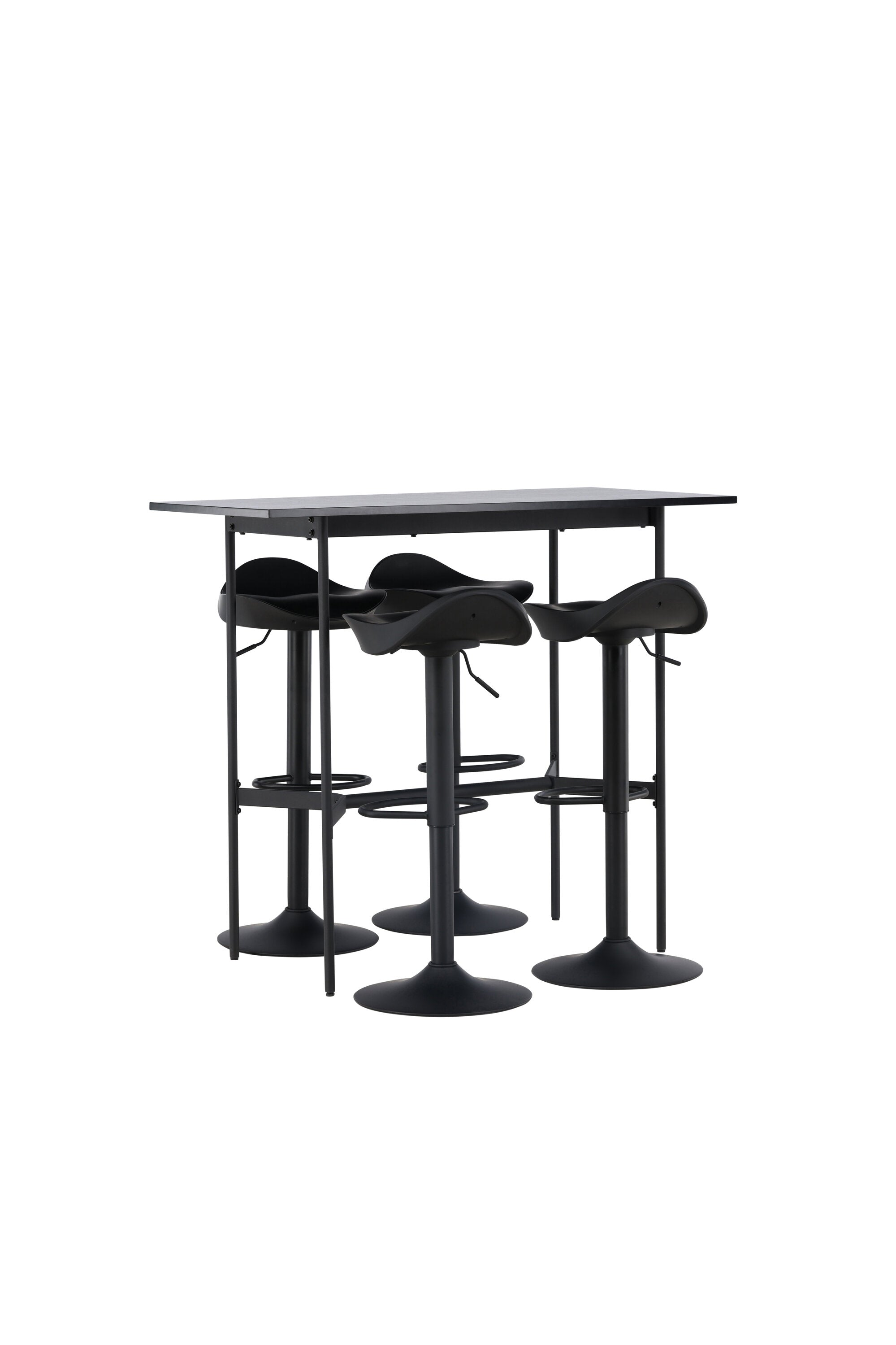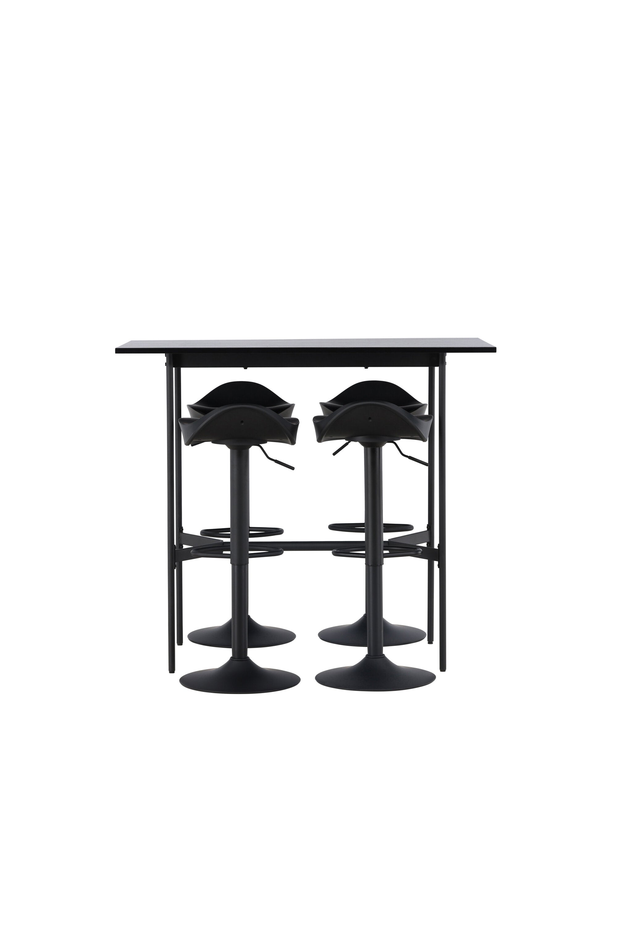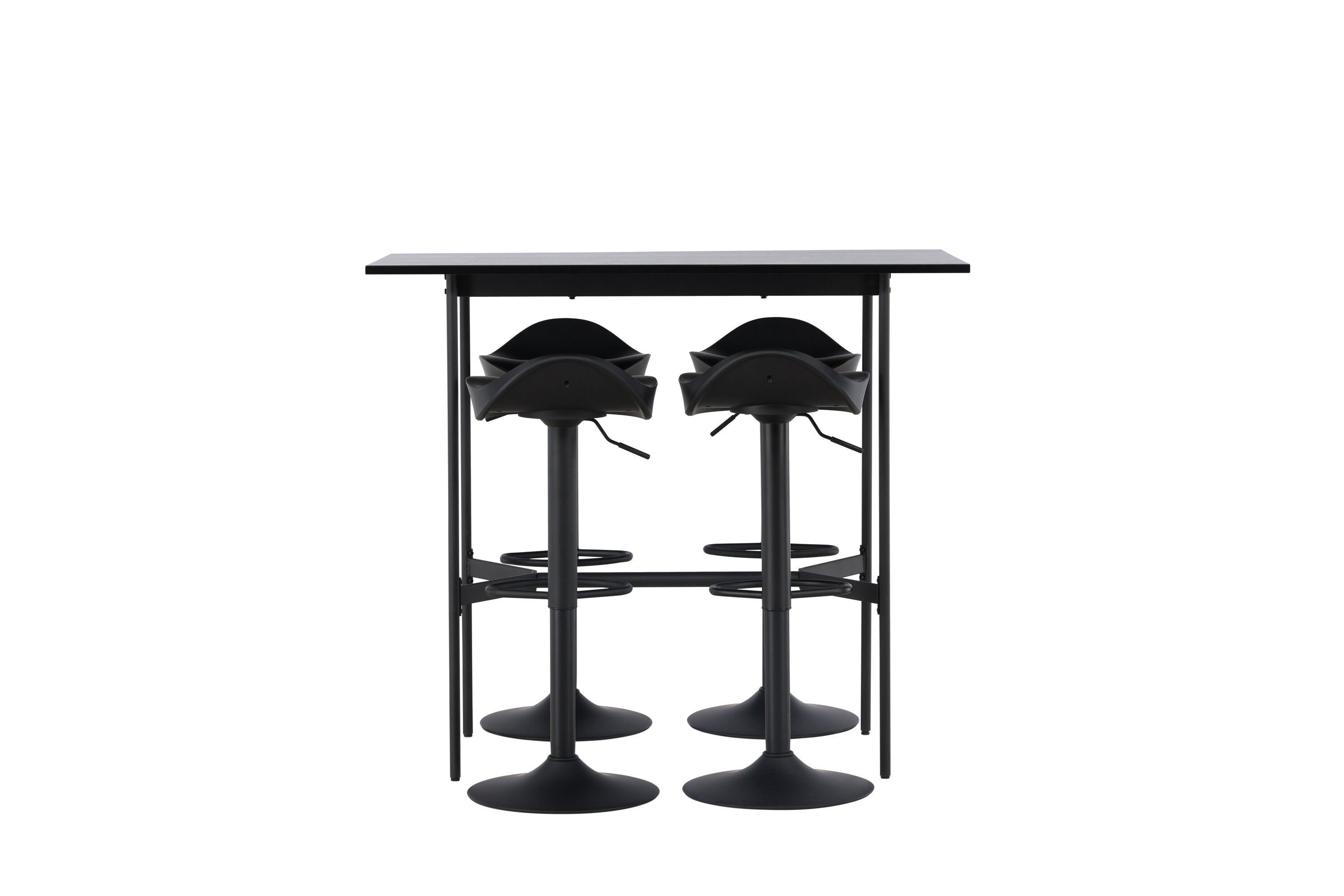 Vzdušné a stylové! Minimalistický barový stůl Rax má tenkou desku z černé MDF a úzké nohy stolu s integrovanou podnožkou v černém kovu. Zde společně s klasickými, černými barovými židlemi ze série Adesto. Židle má stylový design s trumpetovou nohou z černé oceli a jednoduchým sedákem z černého plastu. Spojte minimalismus s nadčasovým designem! Rozměry stolu: 120x60cm.