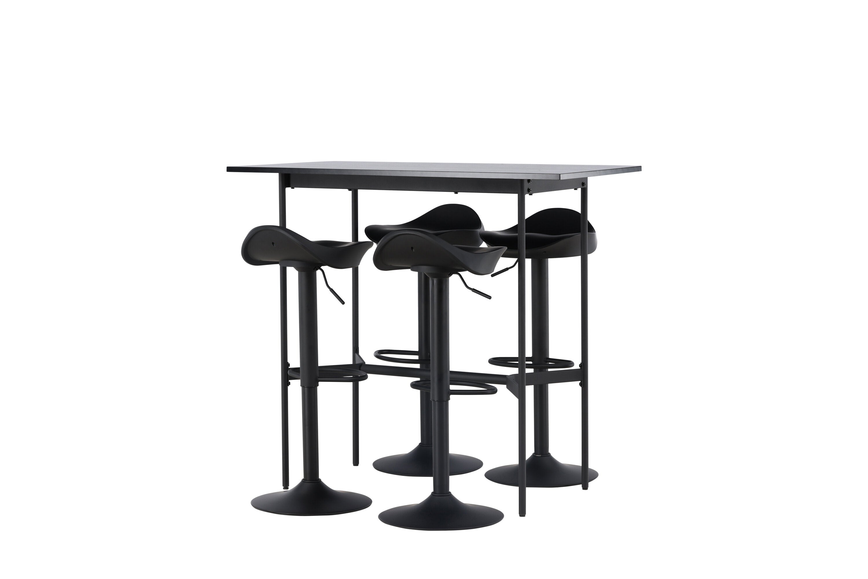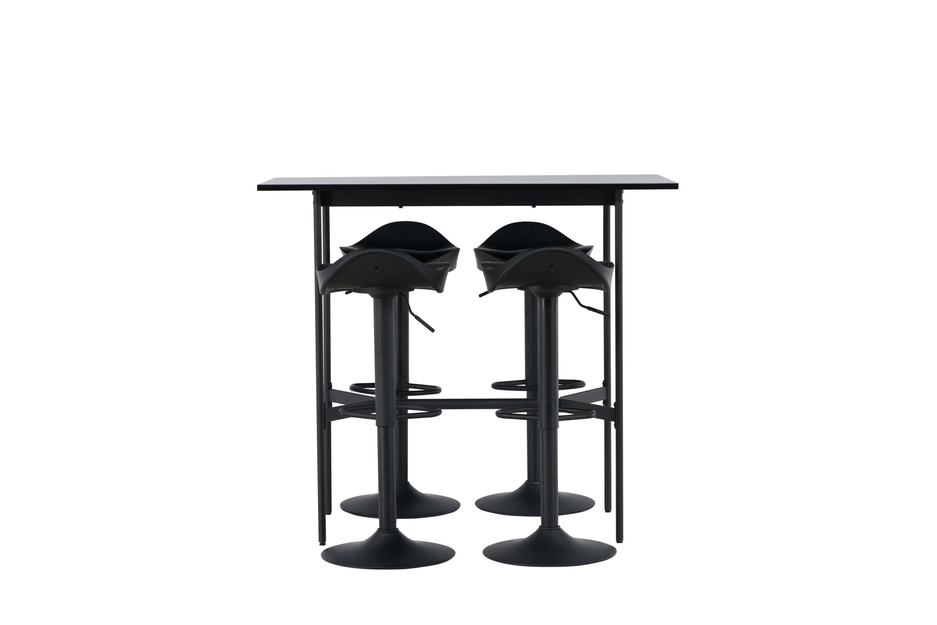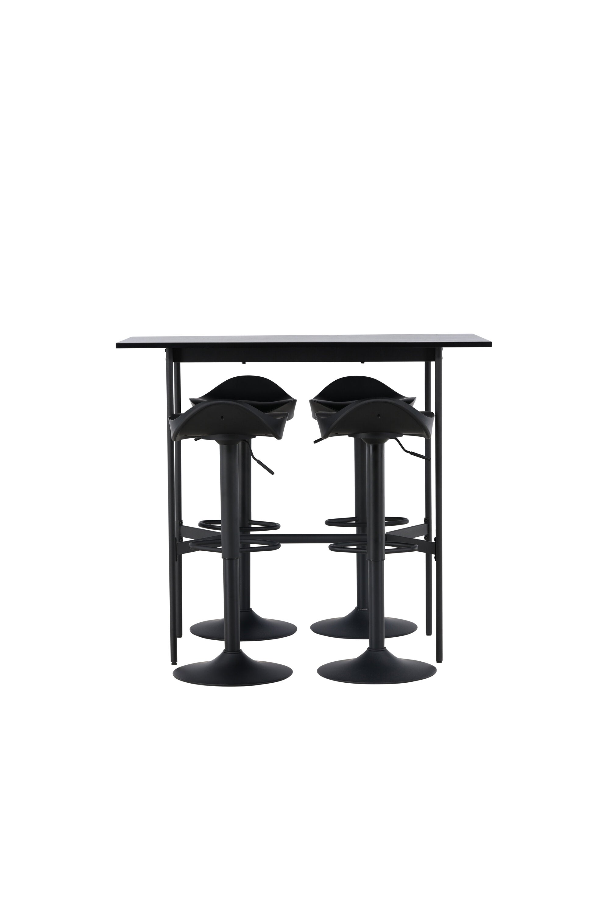 Vzdušné a stylové! Minimalistický barový stůl Rax má tenkou desku z černé MDF a úzké nohy stolu s integrovanou podnožkou v černém kovu. Zde společně s klasickými, černými barovými židlemi ze série Adesto. Židle má stylový design s trumpetovou nohou z černé oceli a jednoduchým sedákem z černého plastu. Spojte minimalismus s nadčasovým designem! Rozměry stolu: 120x60cm.