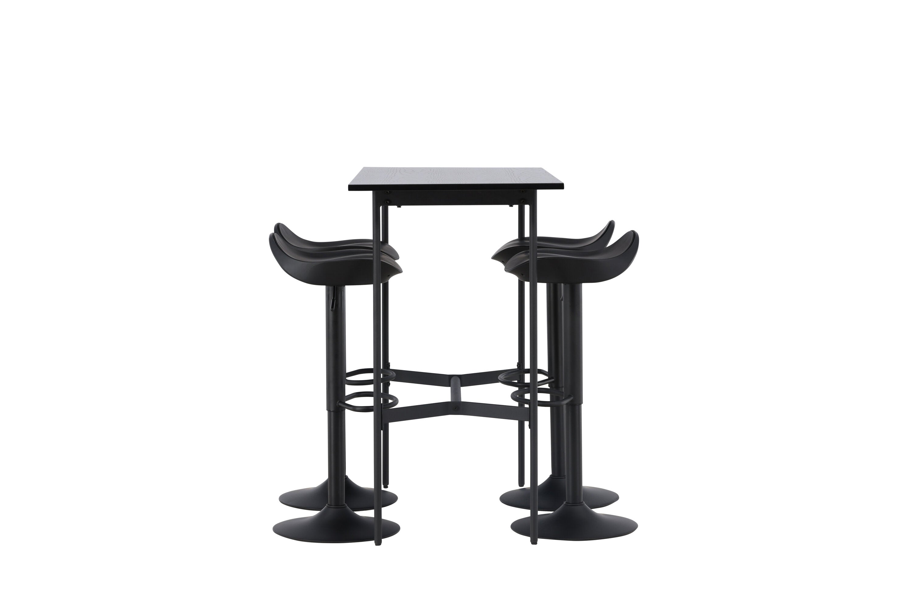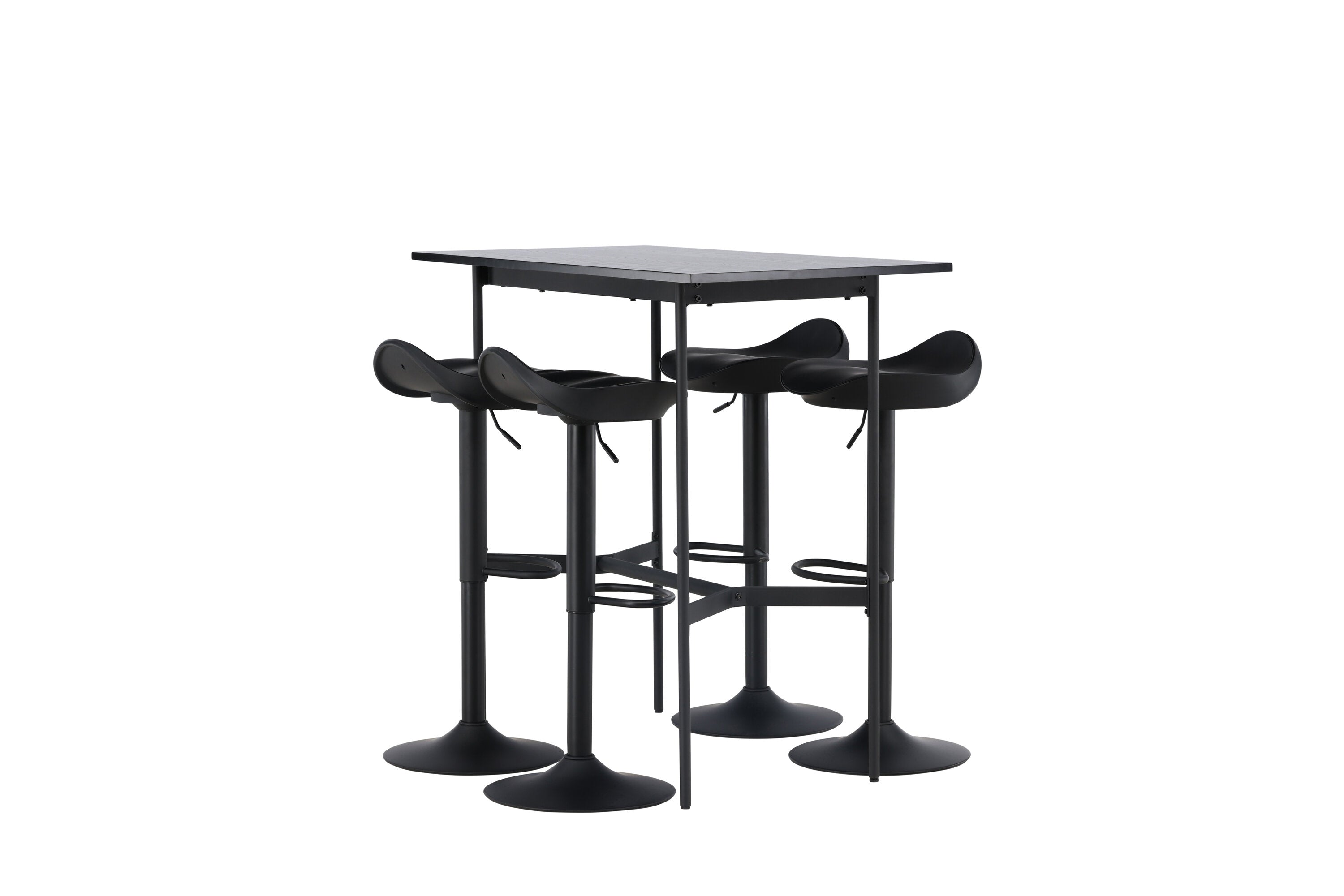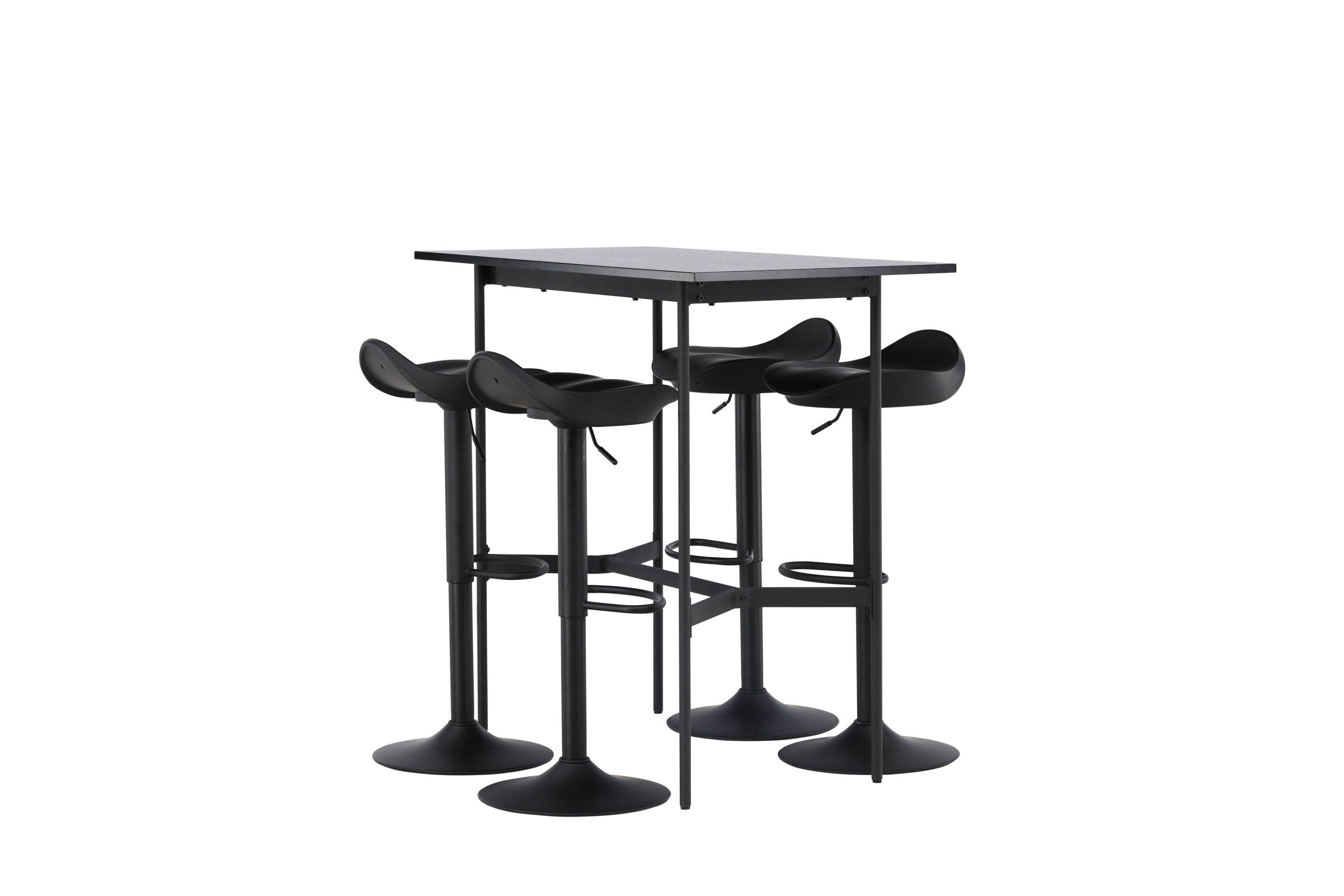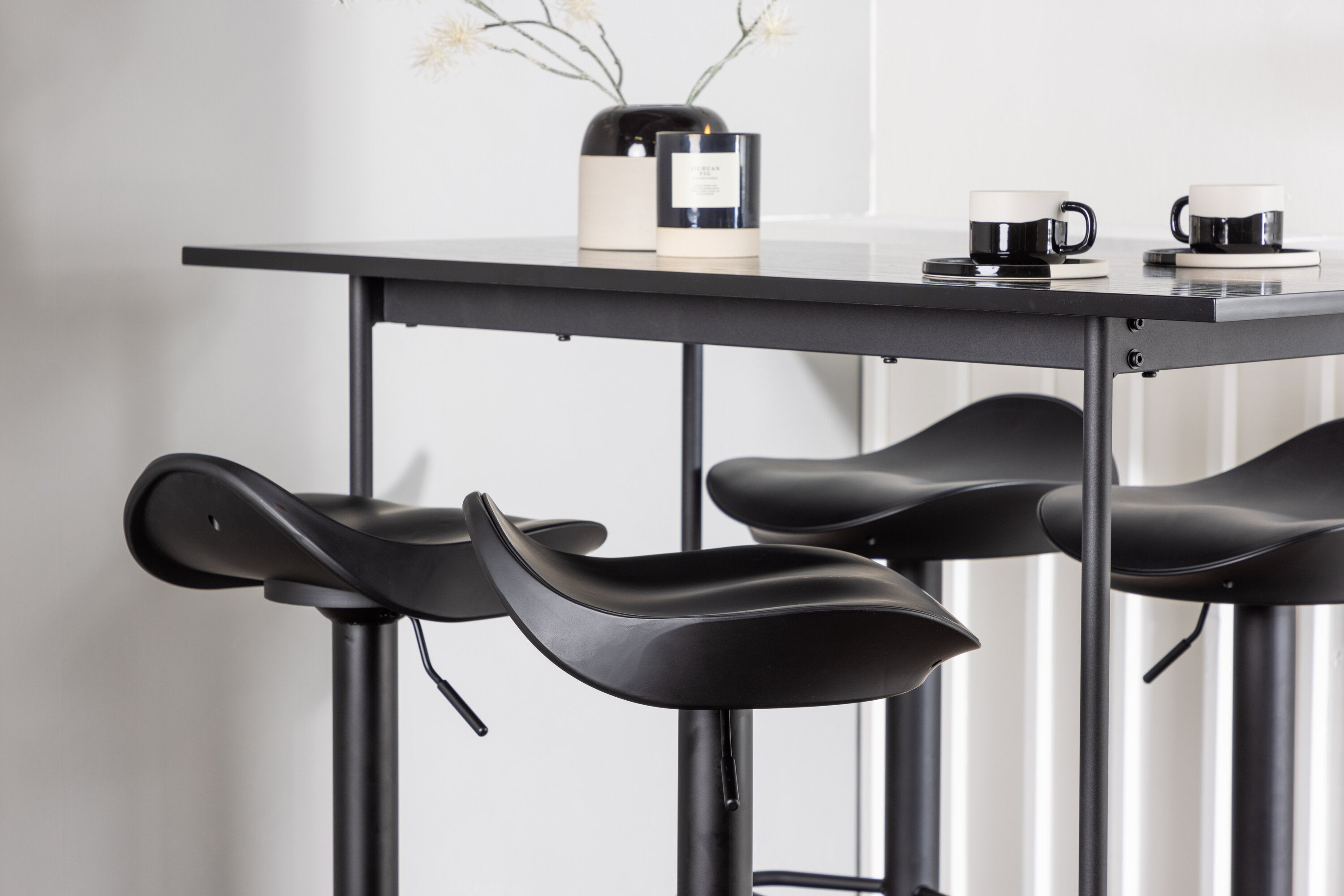 Vzdušné a stylové! Minimalistický barový stůl Rax má tenkou desku z černé MDF a úzké nohy stolu s integrovanou podnožkou v černém kovu. Zde společně s klasickými, černými barovými židlemi ze série Adesto. Židle má stylový design s trumpetovou nohou z černé oceli a jednoduchým sedákem z černého plastu. Spojte minimalismus s nadčasovým designem! Rozměry stolu: 120x60cm.