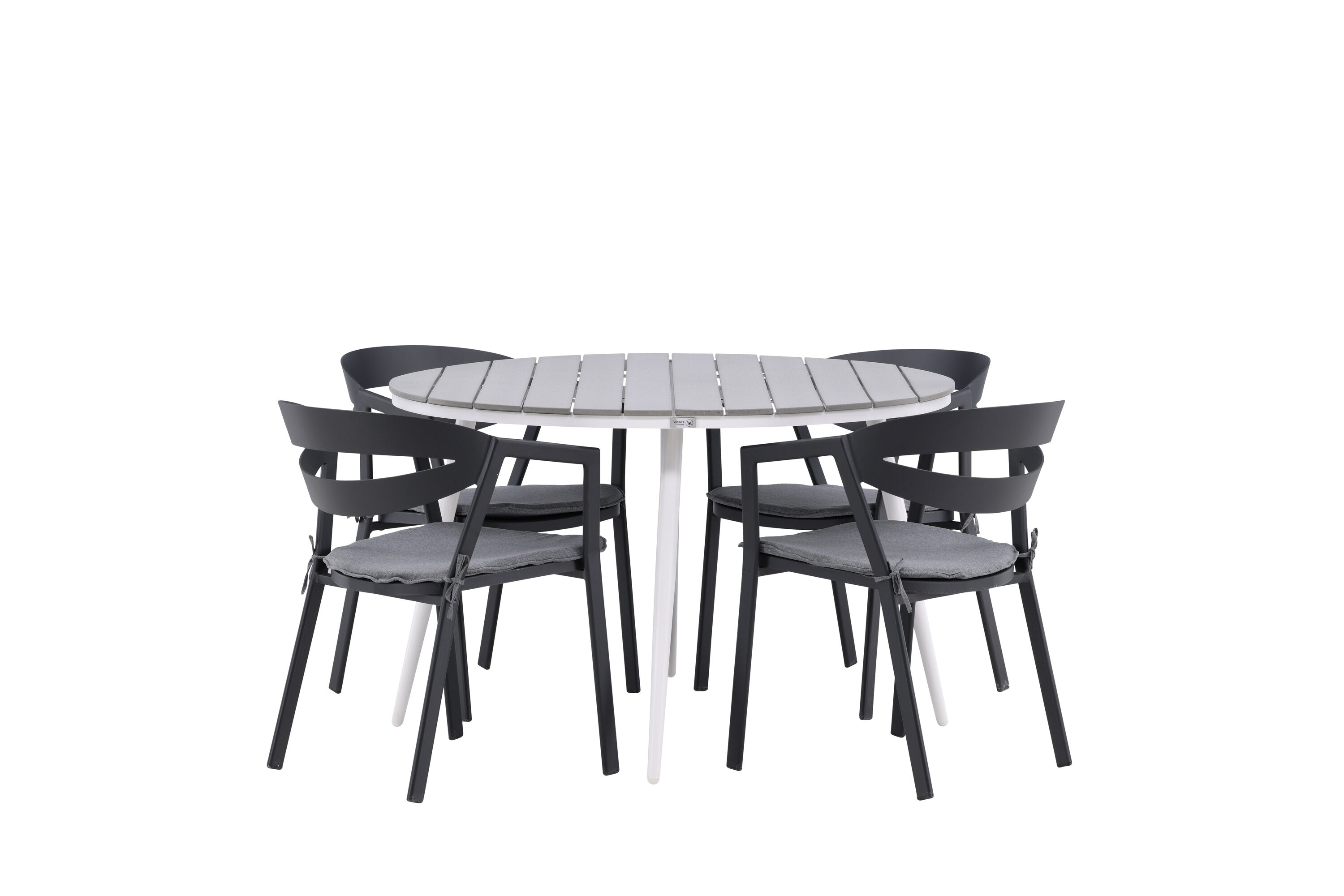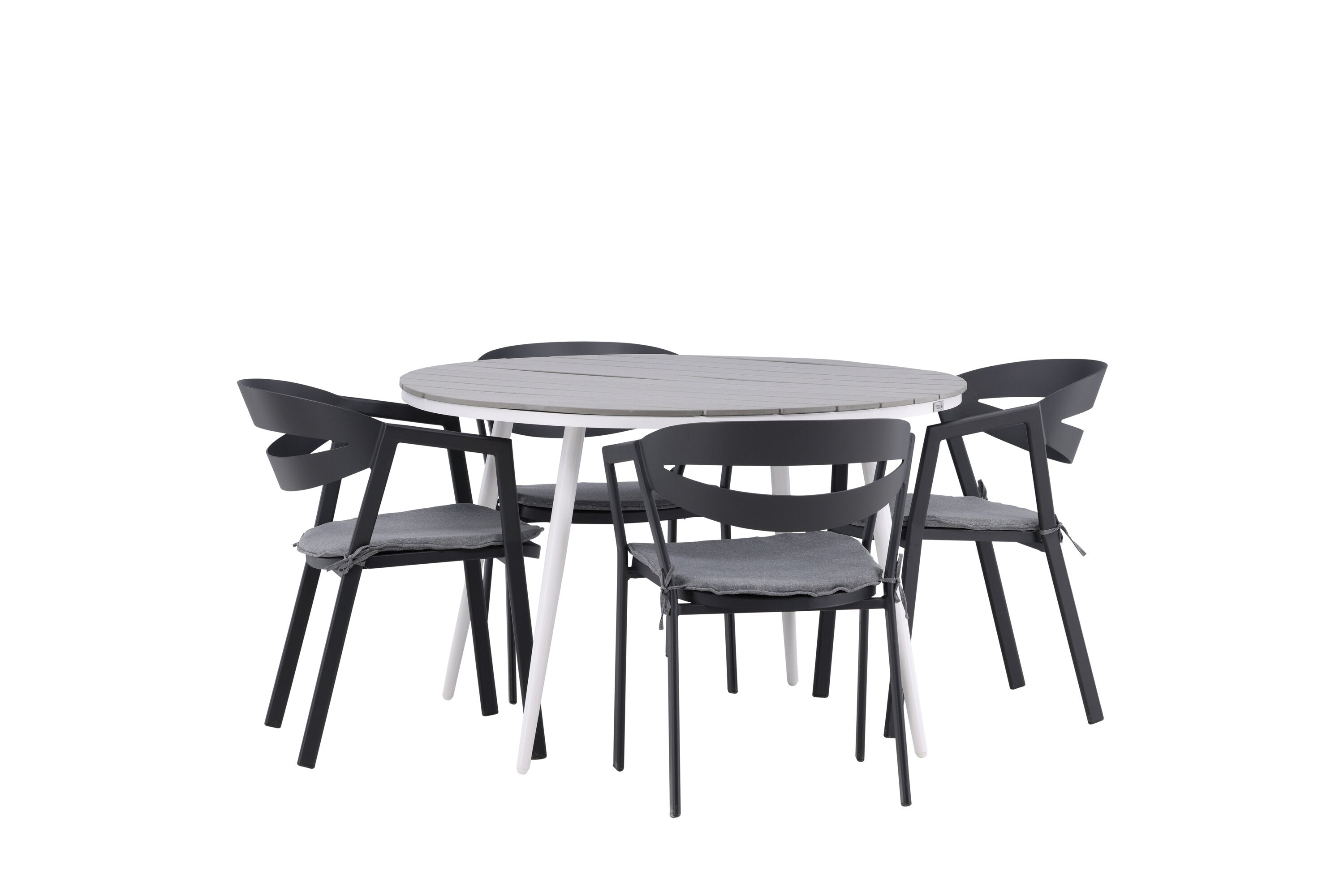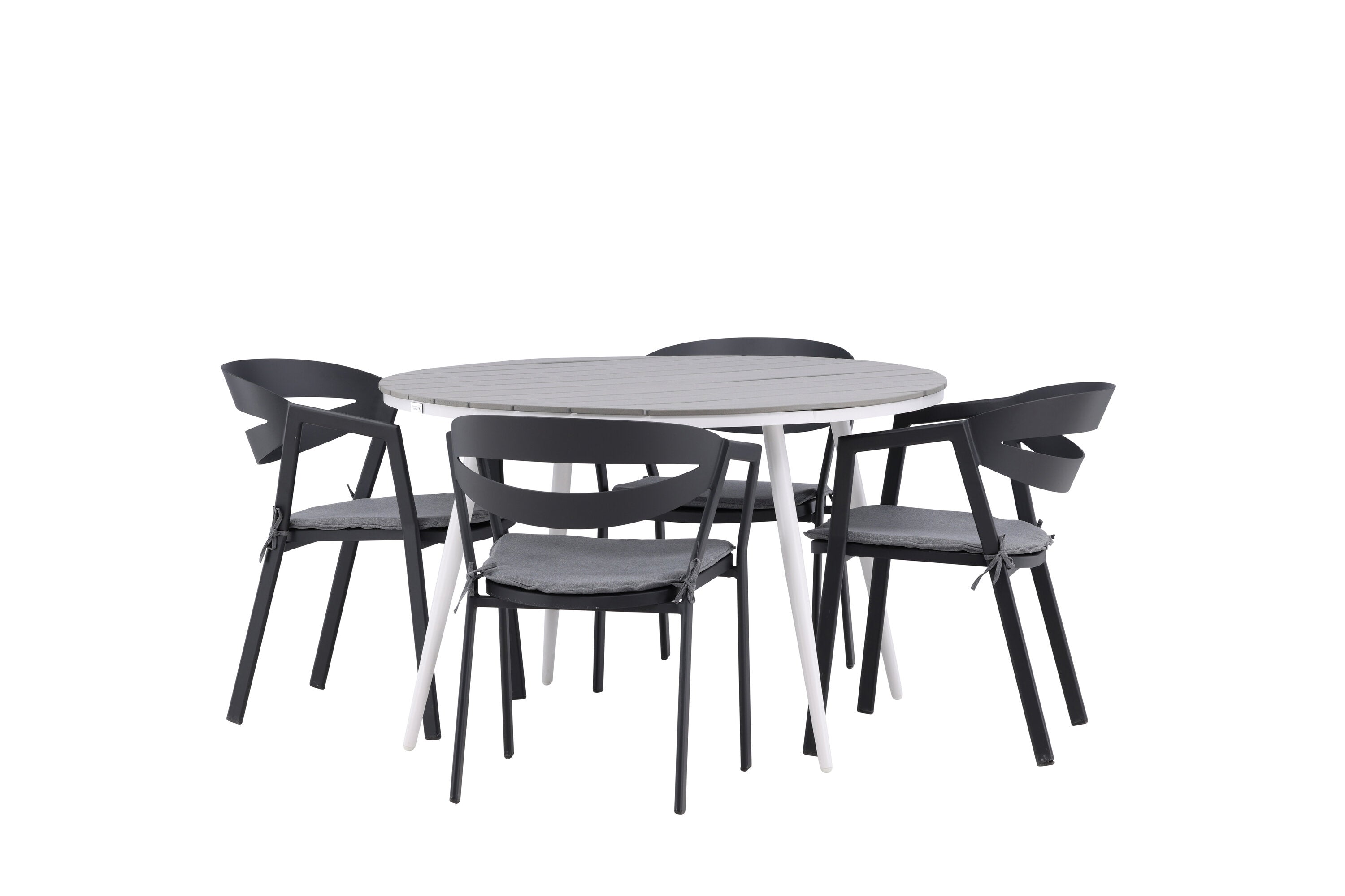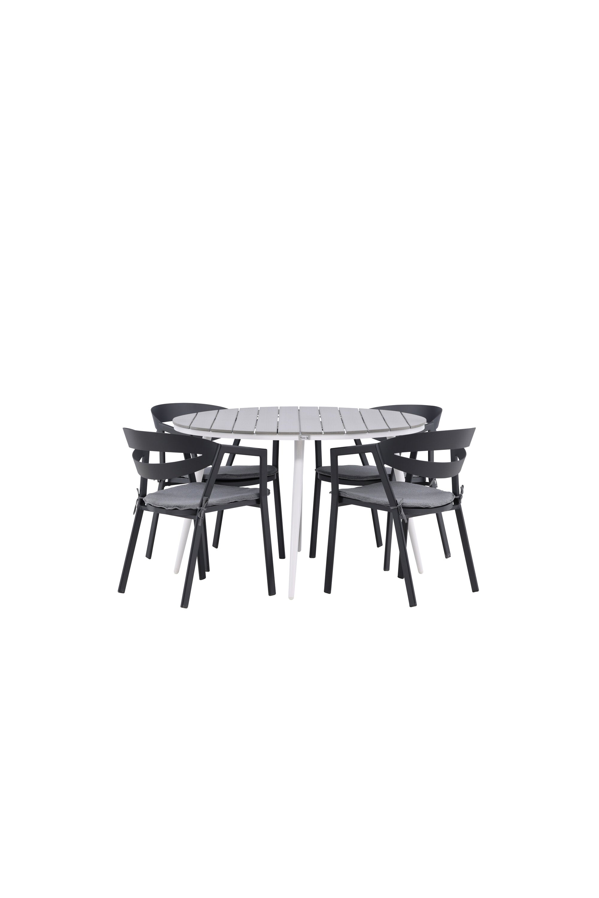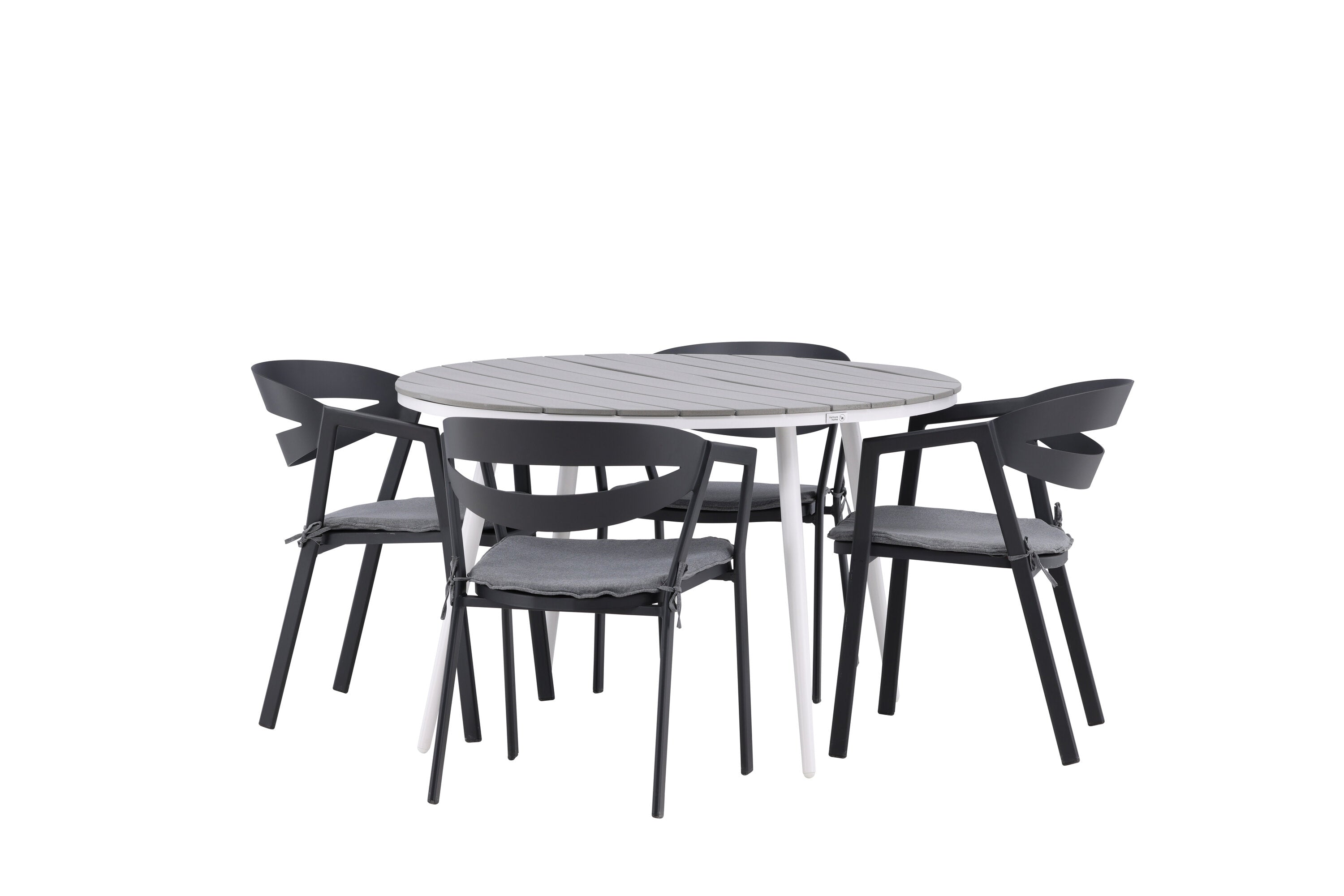 Break - Jídelní stůl kulatý - Bílá / Šedá - Alu / Aintwood - 120ø _1+ Štěrbina - Jídelní židle vč. Polštář - Černá / Šedá - Hliník - _4