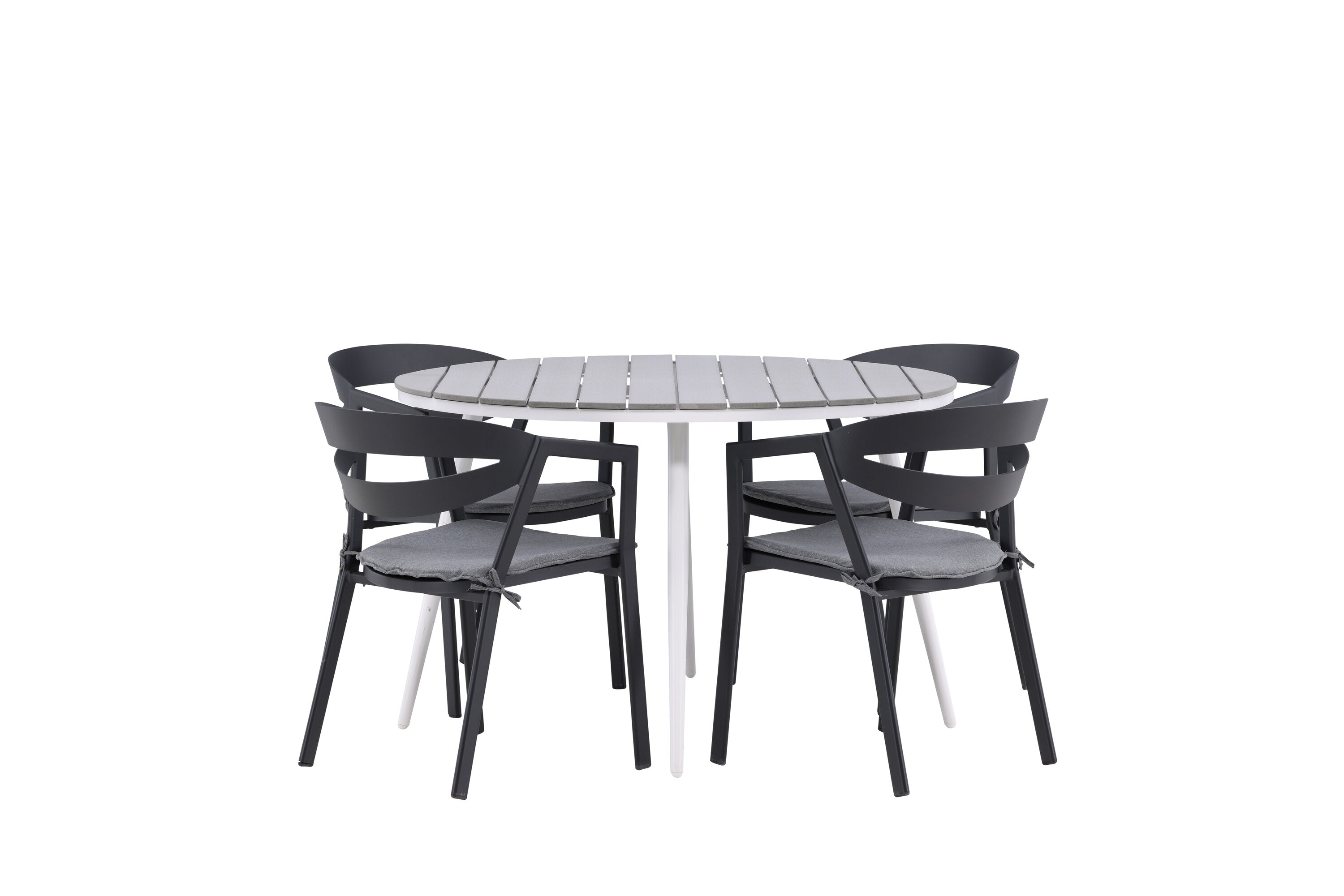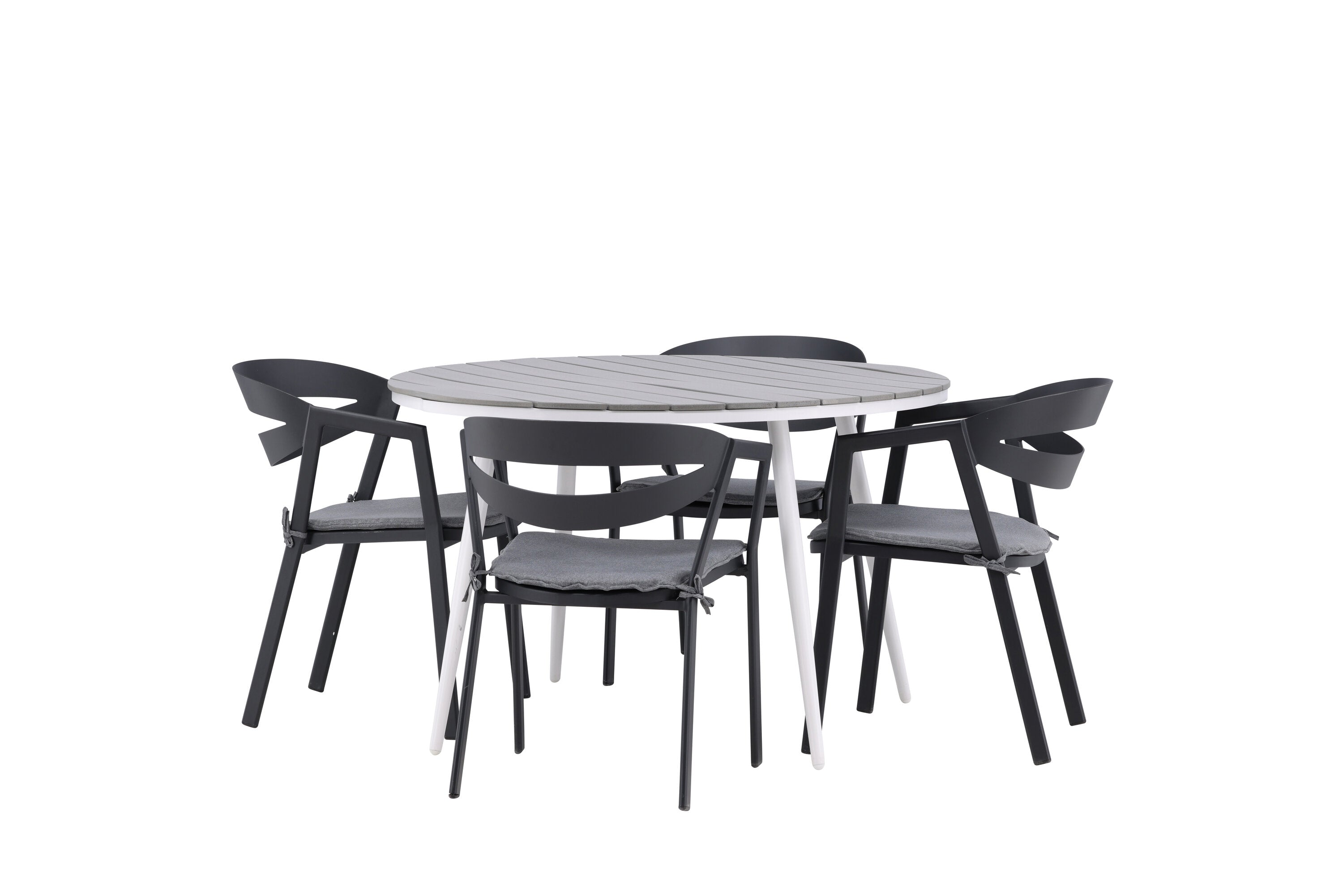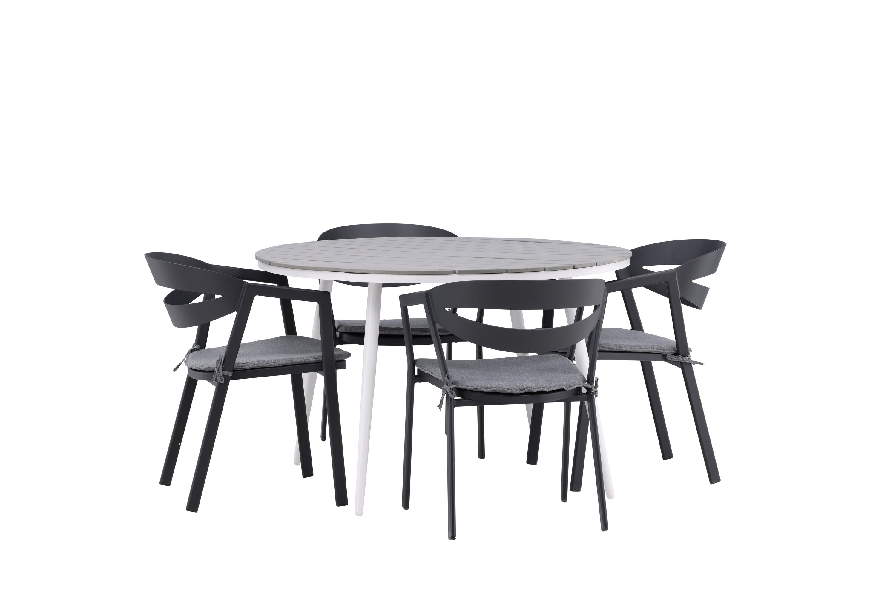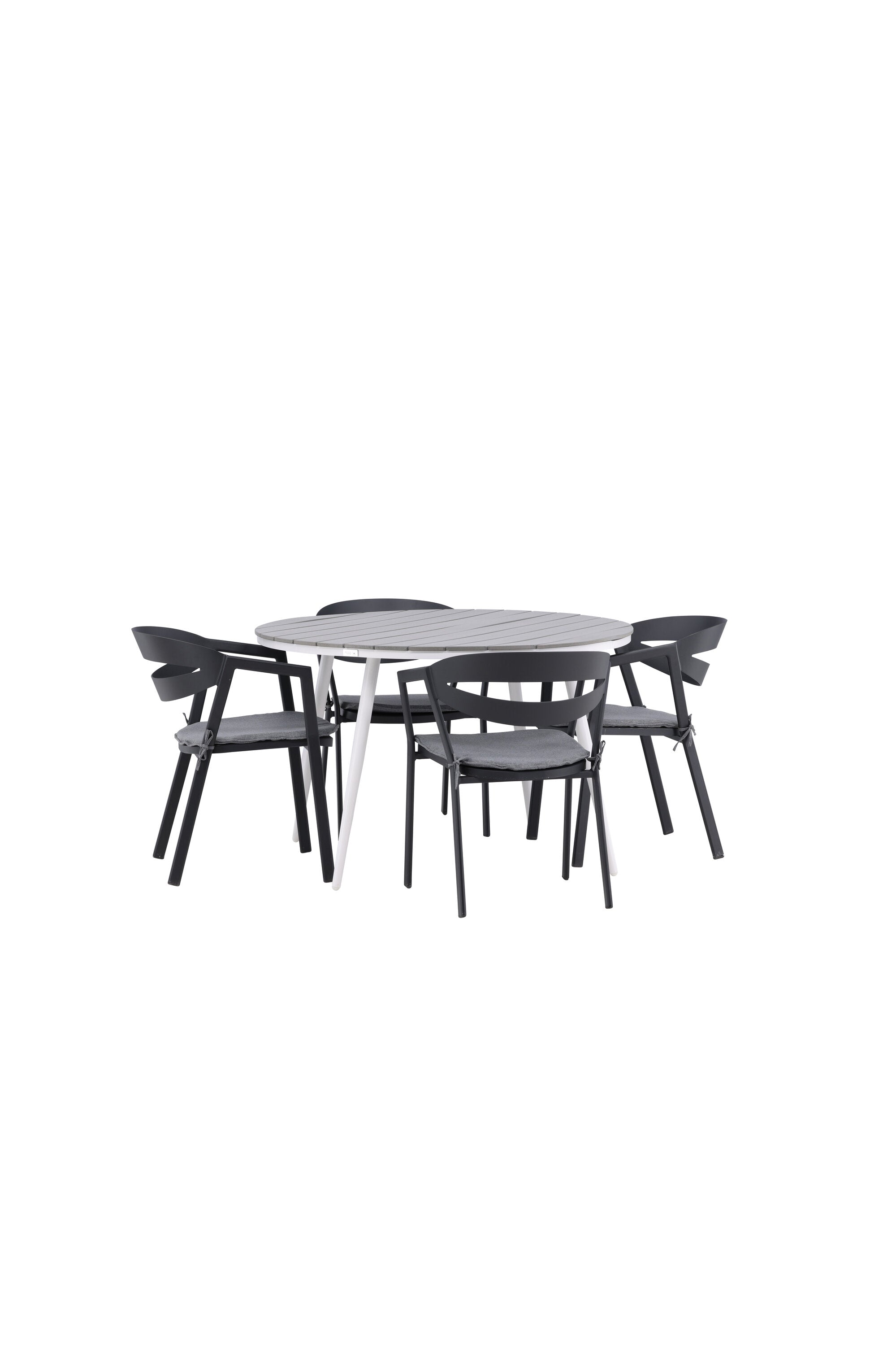 Break - Jídelní stůl kulatý - Bílá / Šedá - Alu / Aintwood - 120ø _1+ Štěrbina - Jídelní židle vč. Polštář - Černá / Šedá - Hliník - _4