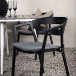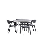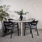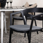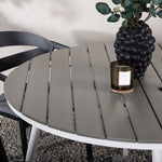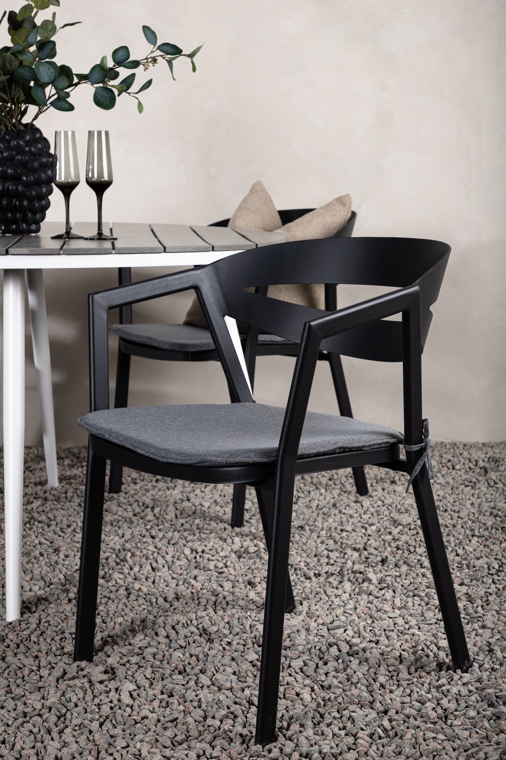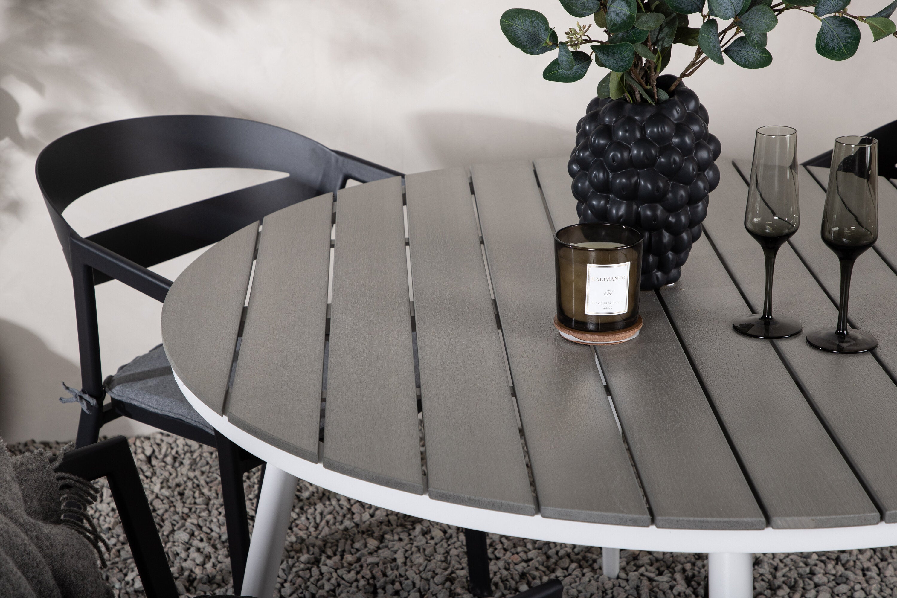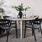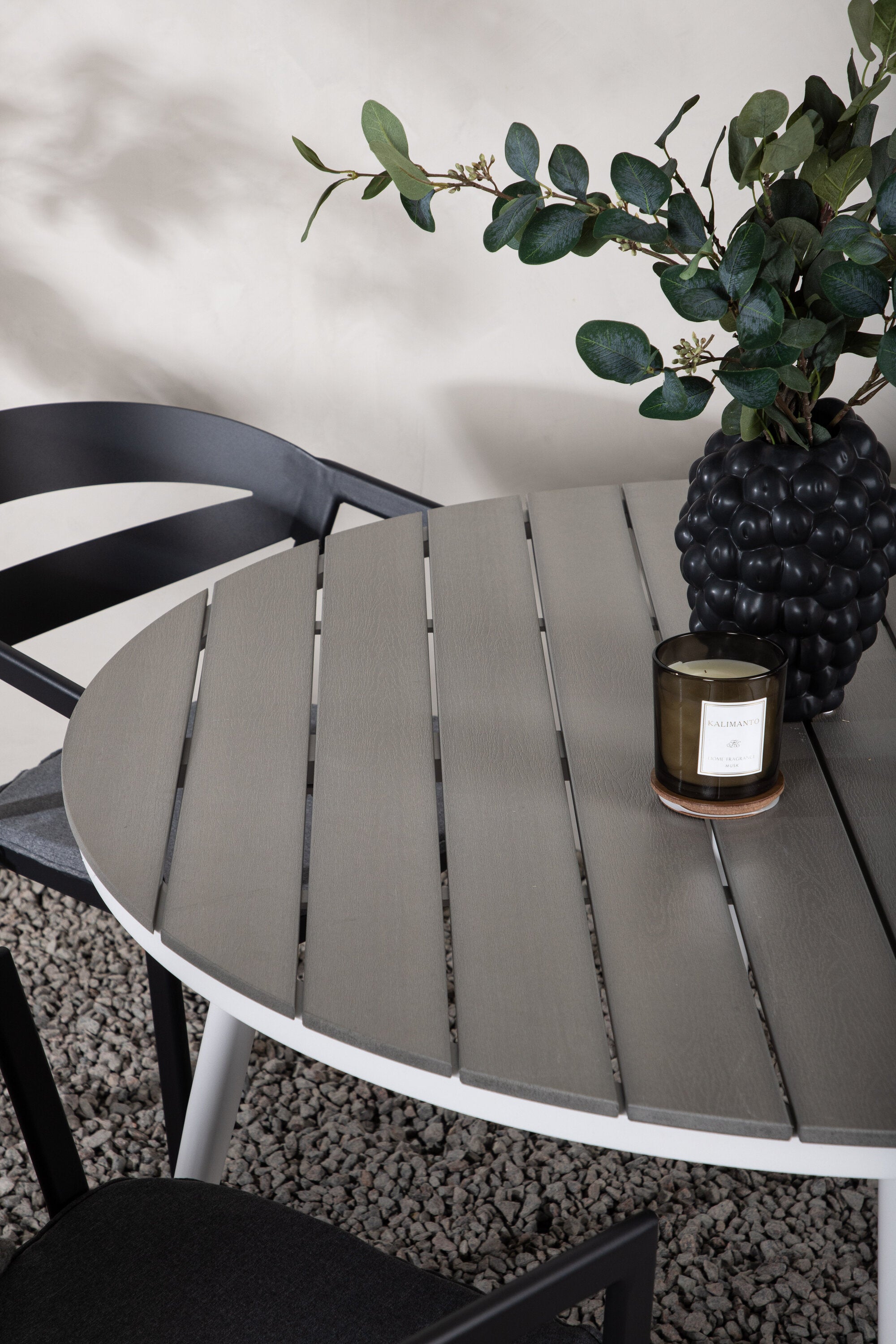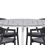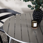 Kulatá skupina potravin, která kombinuje nadčasový design s lákavými tvary! Jídelní stůl Break má klasický design s kulatou stolní deskou v šedé barvě Aintwood a lehce rozšířenými nohami z bílého hliníku. Zde v dokonalé kombinaci s pohodlnými jídelními židlemi ze série Slit. Židle mají integrované područky z černého hliníku a šedý polštář pro větší pohodlí. Vytvořte si na terase dokonalé místo pro kávu!