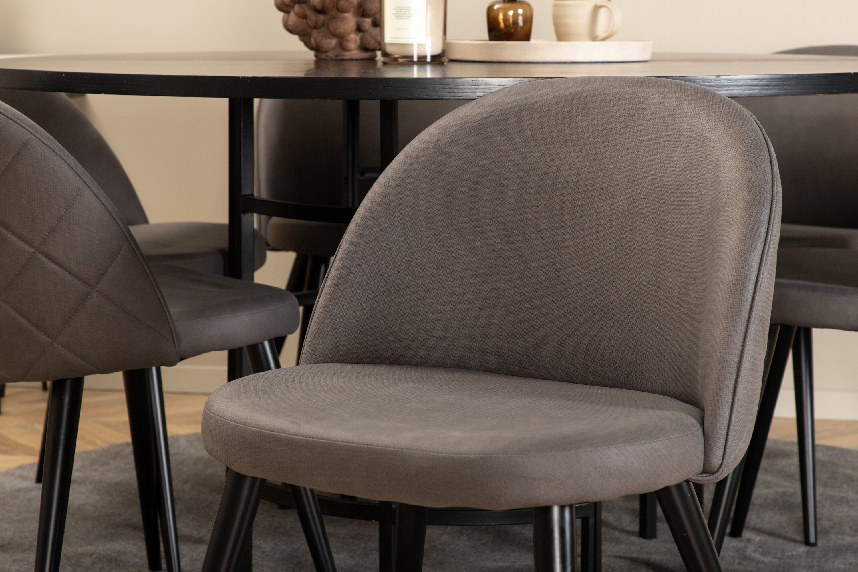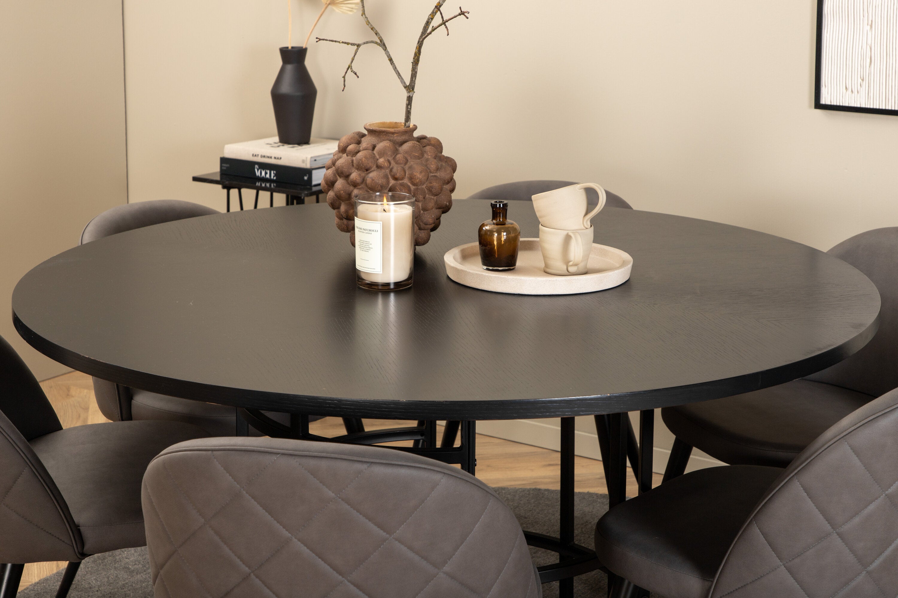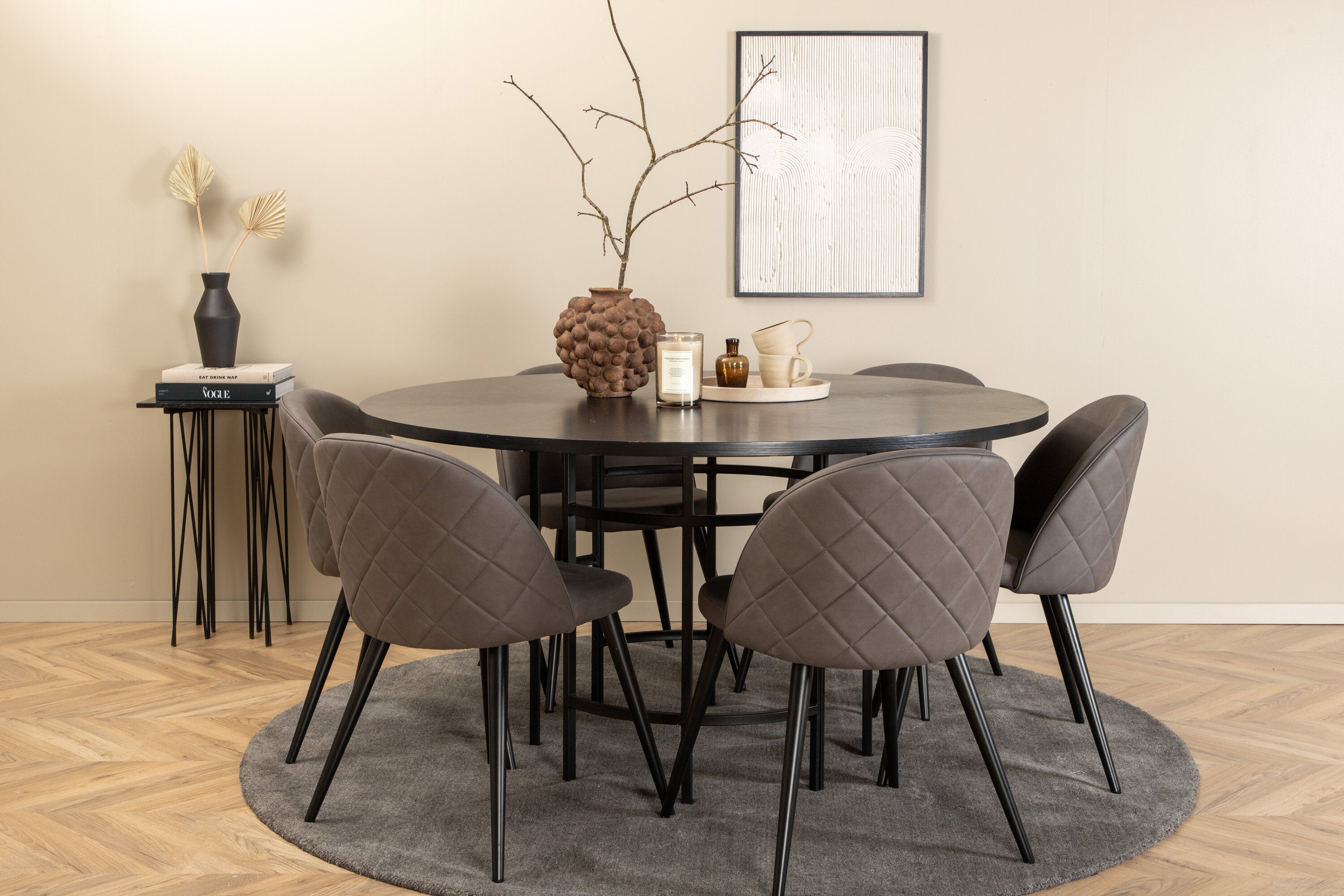 Zařiďte obývací pokoj lákavě a neotřesitelně! Jídelní stůl Copenhagen má trendový design v konzistentně černé barvě se stolovou deskou z MDF s dýhou a dekorativním kovovým podvozkem válcového tvaru. Rozměry stolu: Průměr: 140 cm, Výška: 74 cm. Zde v lahodné kombinaci se 6 jídelními židlemi Velvet Stitches. Nohy židle jsou snadno rozšířeny v železe a sedadla černá z mikrovlákna se stylovým dekoračním stehem. Rozměry židle: Výška: 76,5 cm, výška sedáku: 46,5 cm, šířka: 50 cm, hloubka: 57 cm. Stejně dobře vypadající pro oko, stejně jako pohodlné sezení!