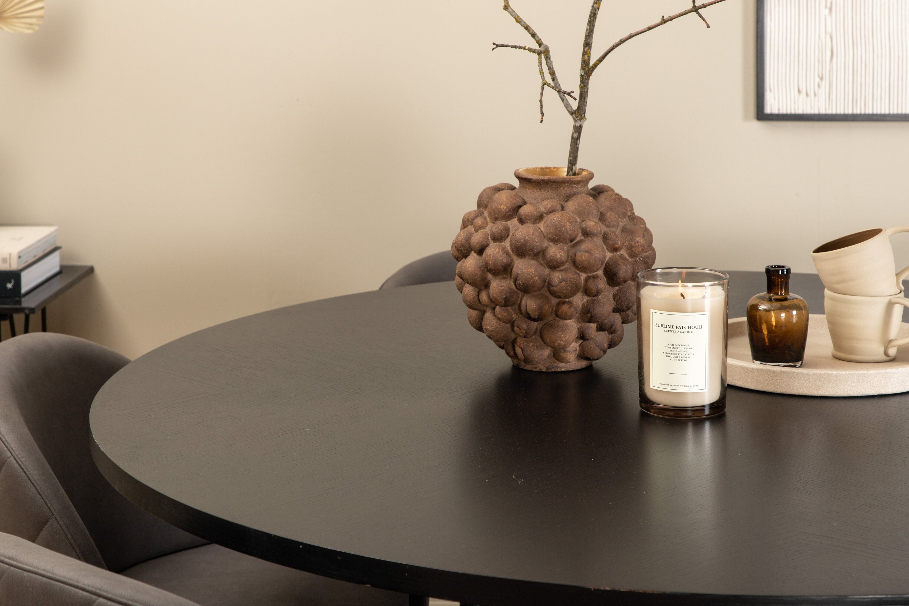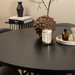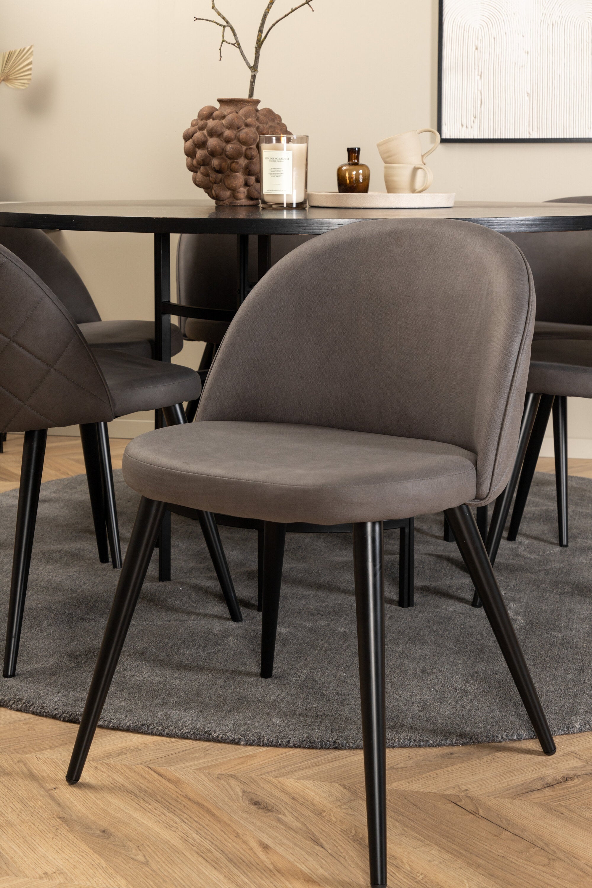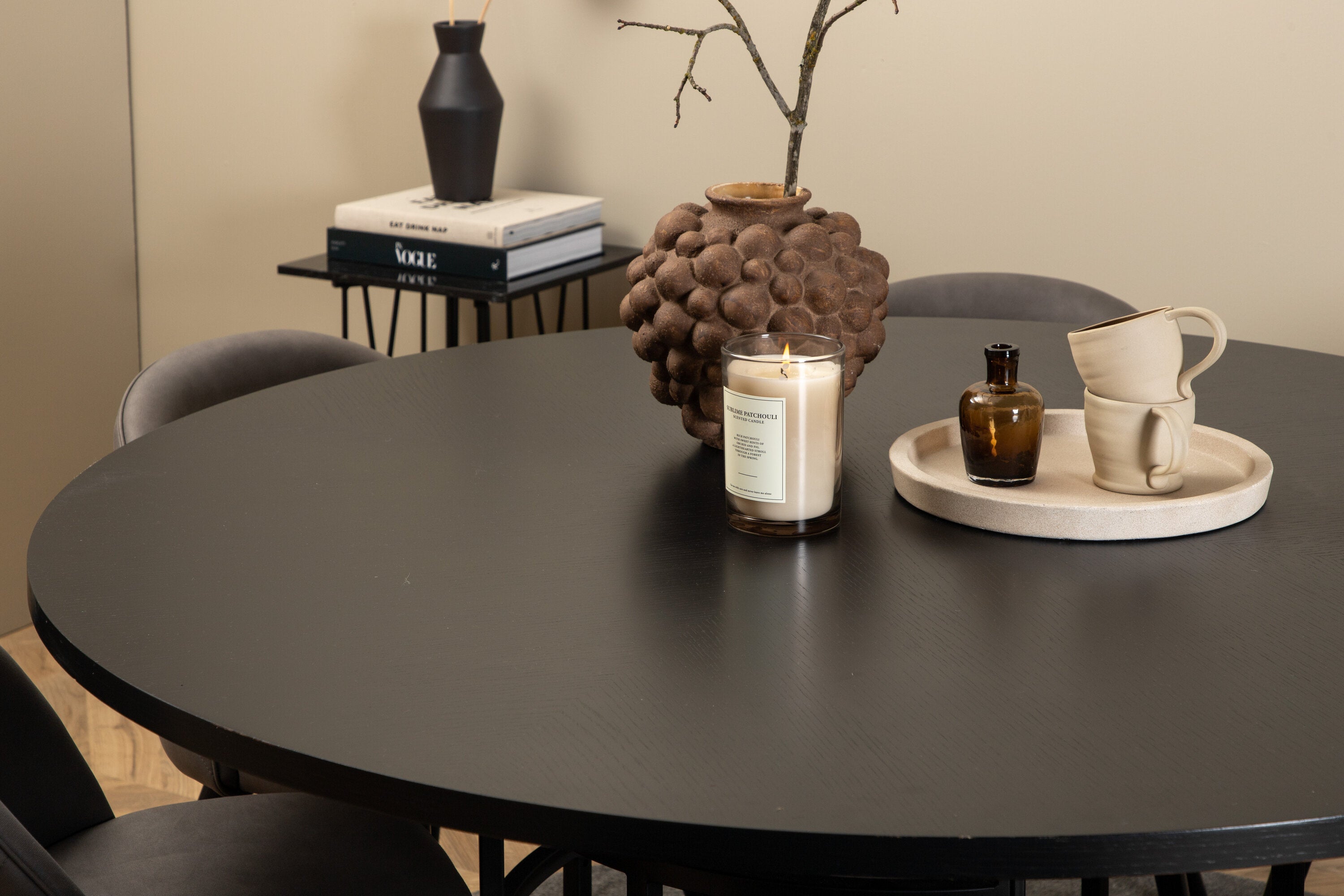 Zařiďte obývací pokoj lákavě a neotřesitelně! Jídelní stůl Copenhagen má trendový design v konzistentně černé barvě se stolovou deskou z MDF s dýhou a dekorativním kovovým podvozkem válcového tvaru. Rozměry stolu: Průměr: 140 cm, Výška: 74 cm. Zde v lahodné kombinaci se 6 jídelními židlemi Velvet Stitches. Nohy židle jsou snadno rozšířeny v železe a sedadla černá z mikrovlákna se stylovým dekoračním stehem. Rozměry židle: Výška: 76,5 cm, výška sedáku: 46,5 cm, šířka: 50 cm, hloubka: 57 cm. Stejně dobře vypadající pro oko, stejně jako pohodlné sezení!