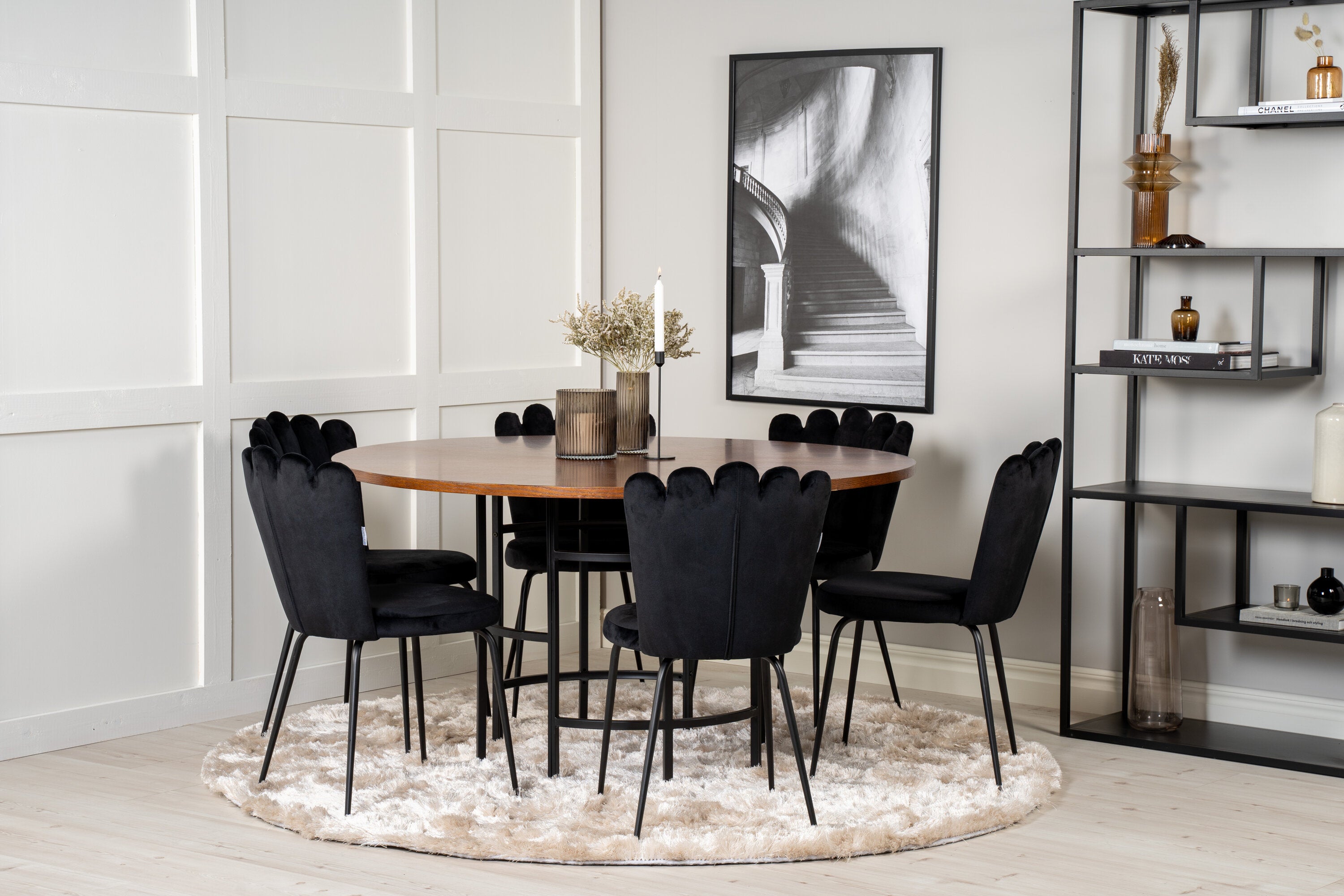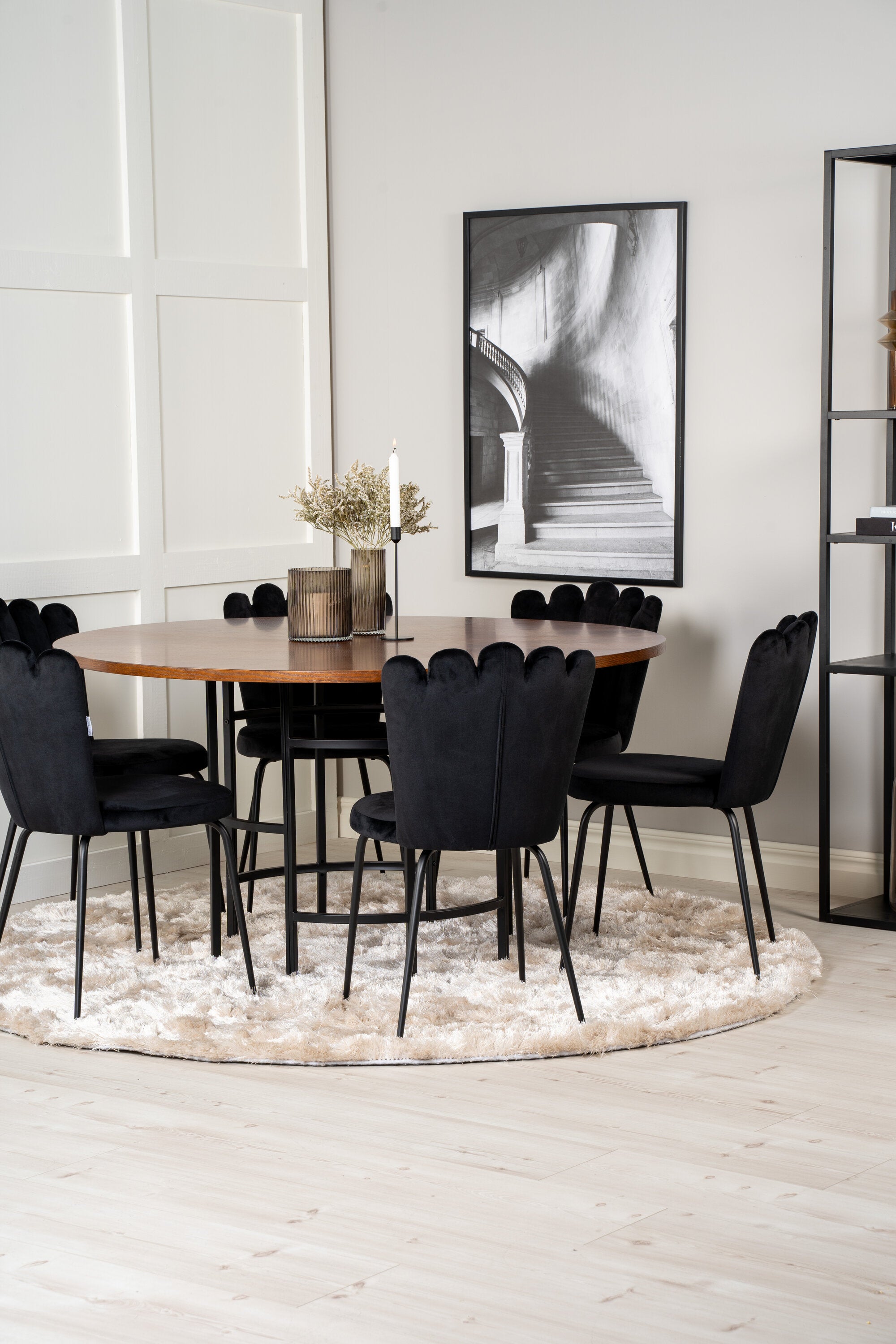 Elegantní a pompézní! Kulatá skupina potravin z kolekce Furniture Fashion. V celém černém výrazu, kde se sametové židle setkávají s deskou stolu připomínající tmavé dřevo, což dodává luxusní pocit. Stůl Copenhagen spolu se sametovými židlemi v černé barvě ze série Limhamn. Zde je místo pro mnohé - pozvěte na pěkné rodinné večeře!