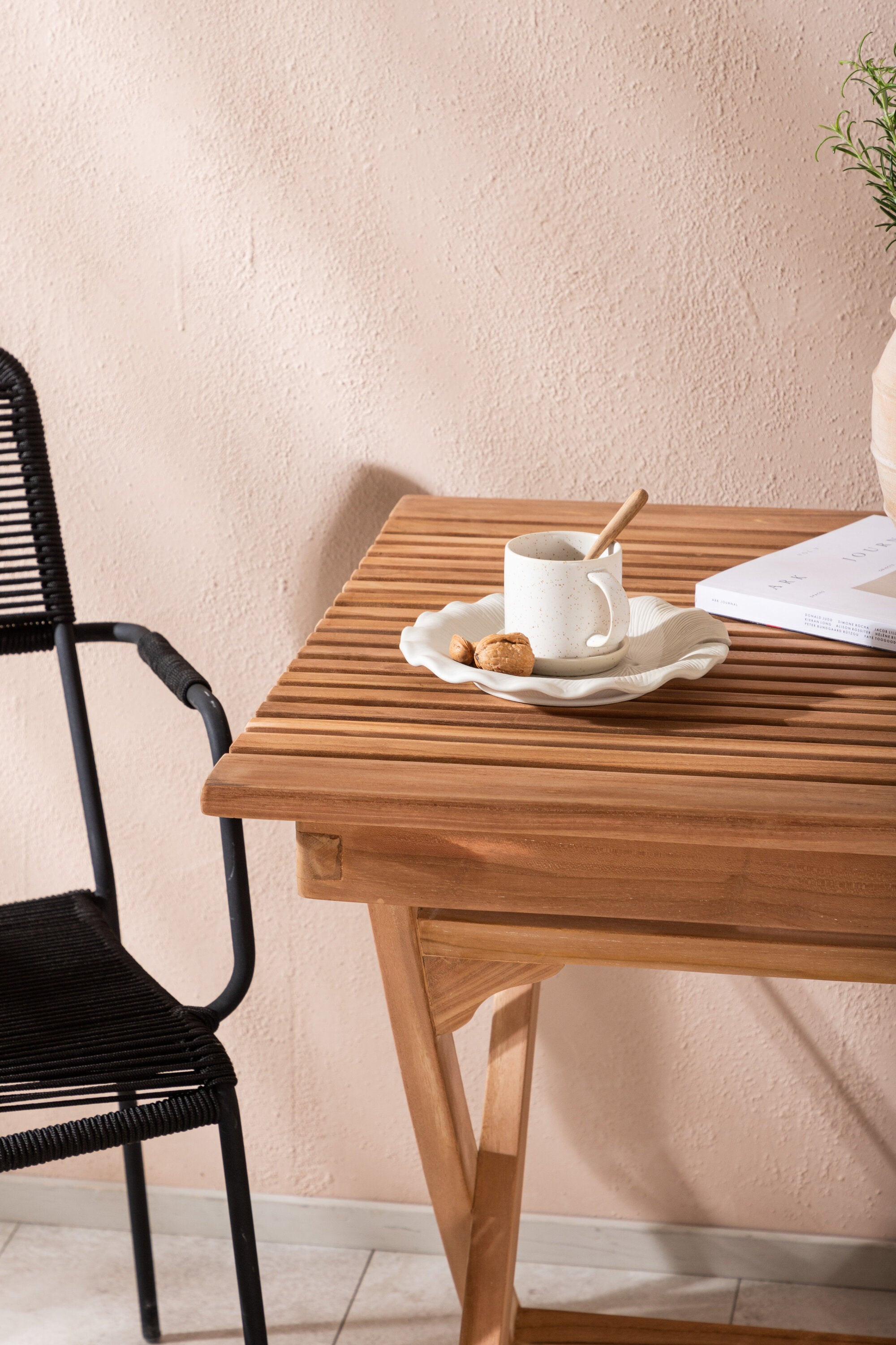 Ghana - perfektní kavárenský stůl pro všechny letní hodiny kávy! Stolek má minimalistický design ve vkusném teaku a je skládací pro praktický pohyb a skladování. Zde v trendové kombinaci s našimi oblíbenými jídelními židlemi ze série Lindos. Židle mají integrované područky z černého hliníku a sedák z černého lana. Vytvořte lákavý poutač, který zapůsobí!