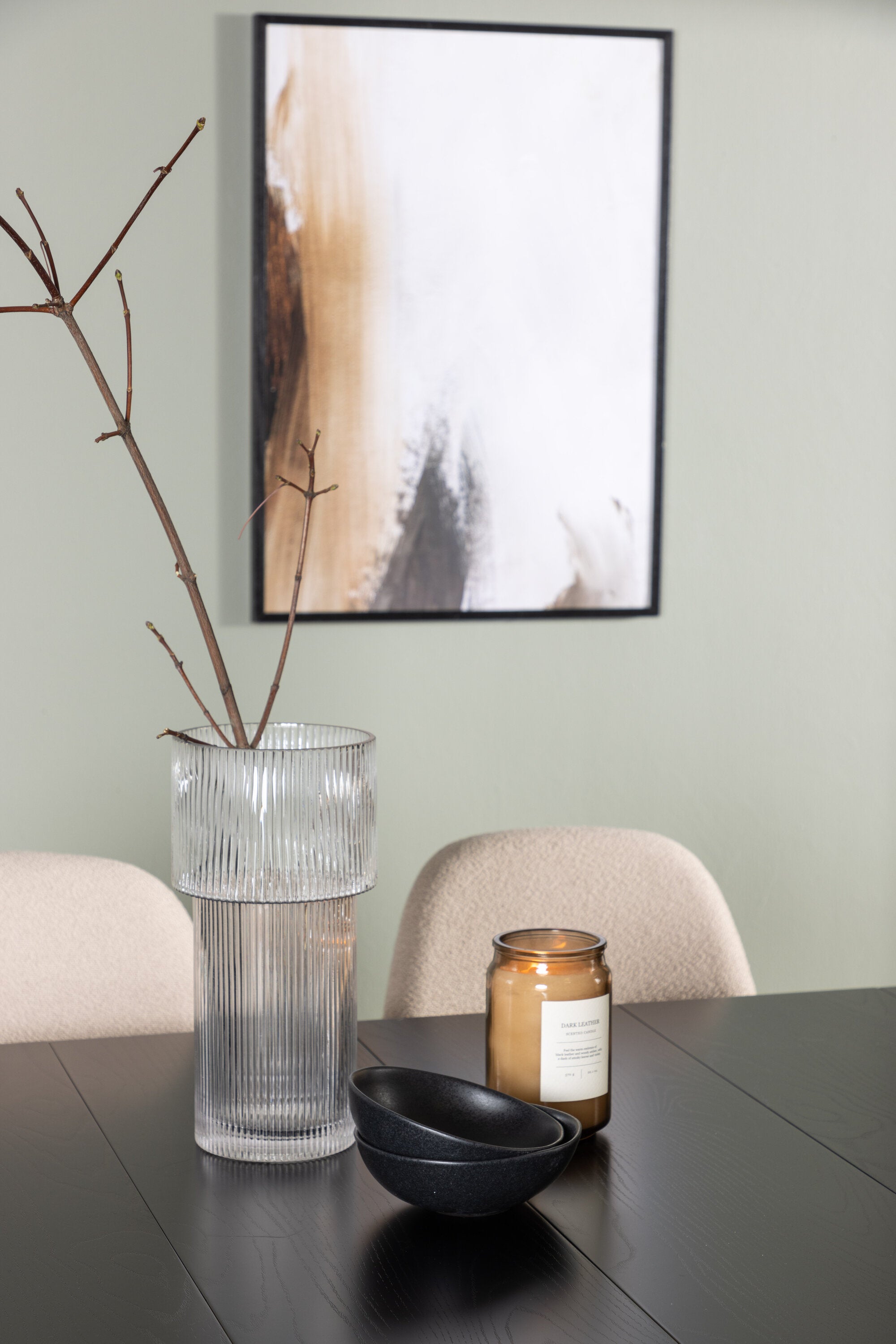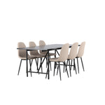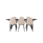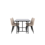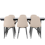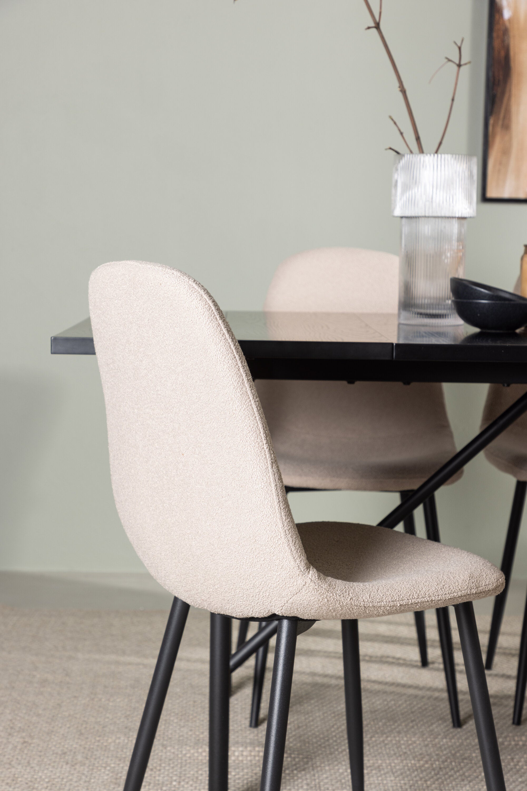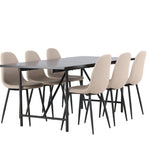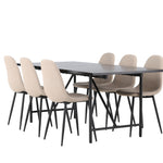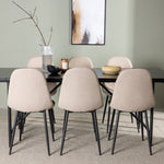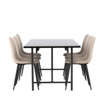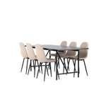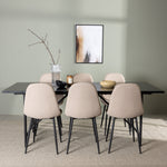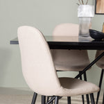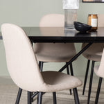 Pro doplnění vašeho jídelního stolu jsme jej sladili také s béžovými židlemi ze série Berit. Tyto židle mají čistý a moderní design s mírně zakřiveným opěradlem a pohodlným sedákem čalouněným sametovou látkou a polyesterovým lnem. Se svými štíhlými černými železnými nohami stylově ladí s černou barvou jídelního stolu.
