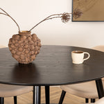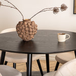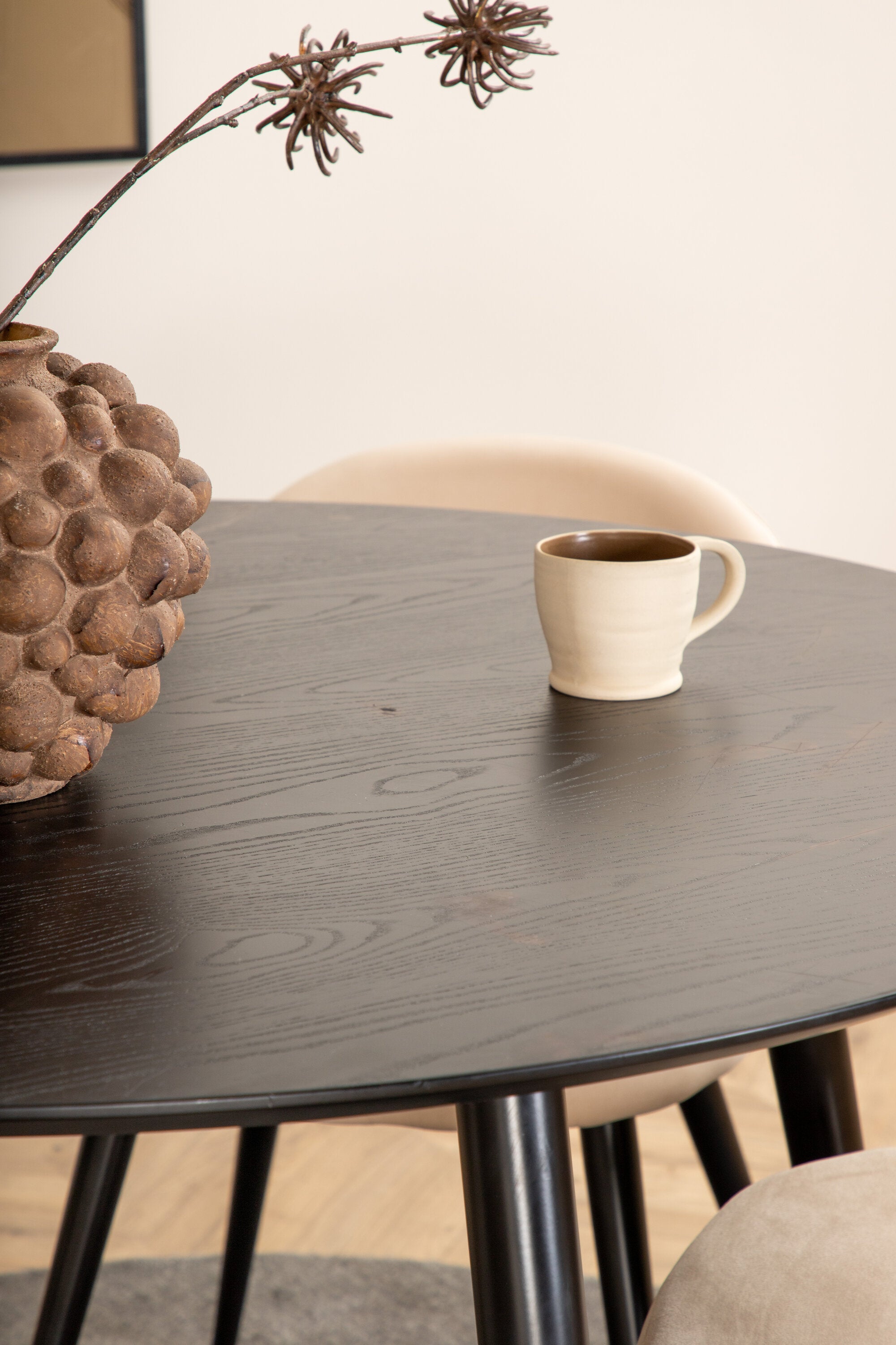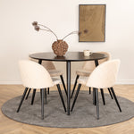Vytvořte si lákavý poutač v srdci domova! Náš kulatý jídelní stůl ze série Dip má stylovou desku z MDF a lehce rozevlátou kovovou nohu stolu. Stůl je konzistentně v černé barvě, která dodává místnosti moderní a luxusní atmosféru. Zde spolu se 4 našimi oblíbenými jídelními židlemi Velvet Stitches, které přispívají k pěknému celku v obývacím pokoji. Nohy židle jsou snadno rozšířeny v černém železe a sametová sedadla v béžové barvě dodávají místnosti pěkný lesk. Užijte si příjemná jídla!