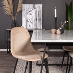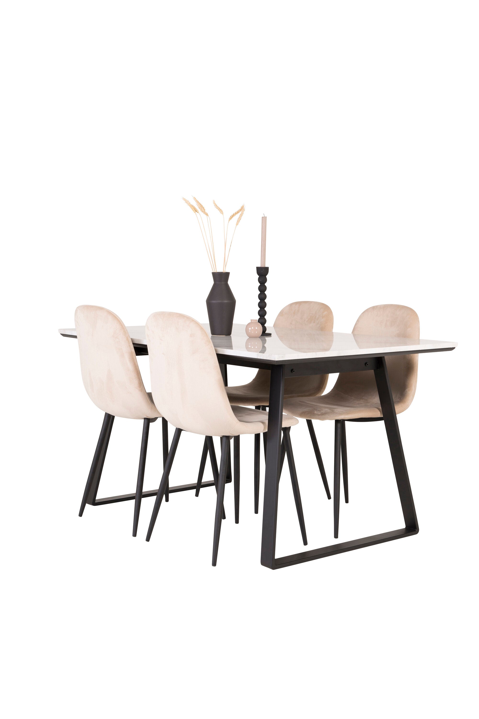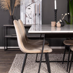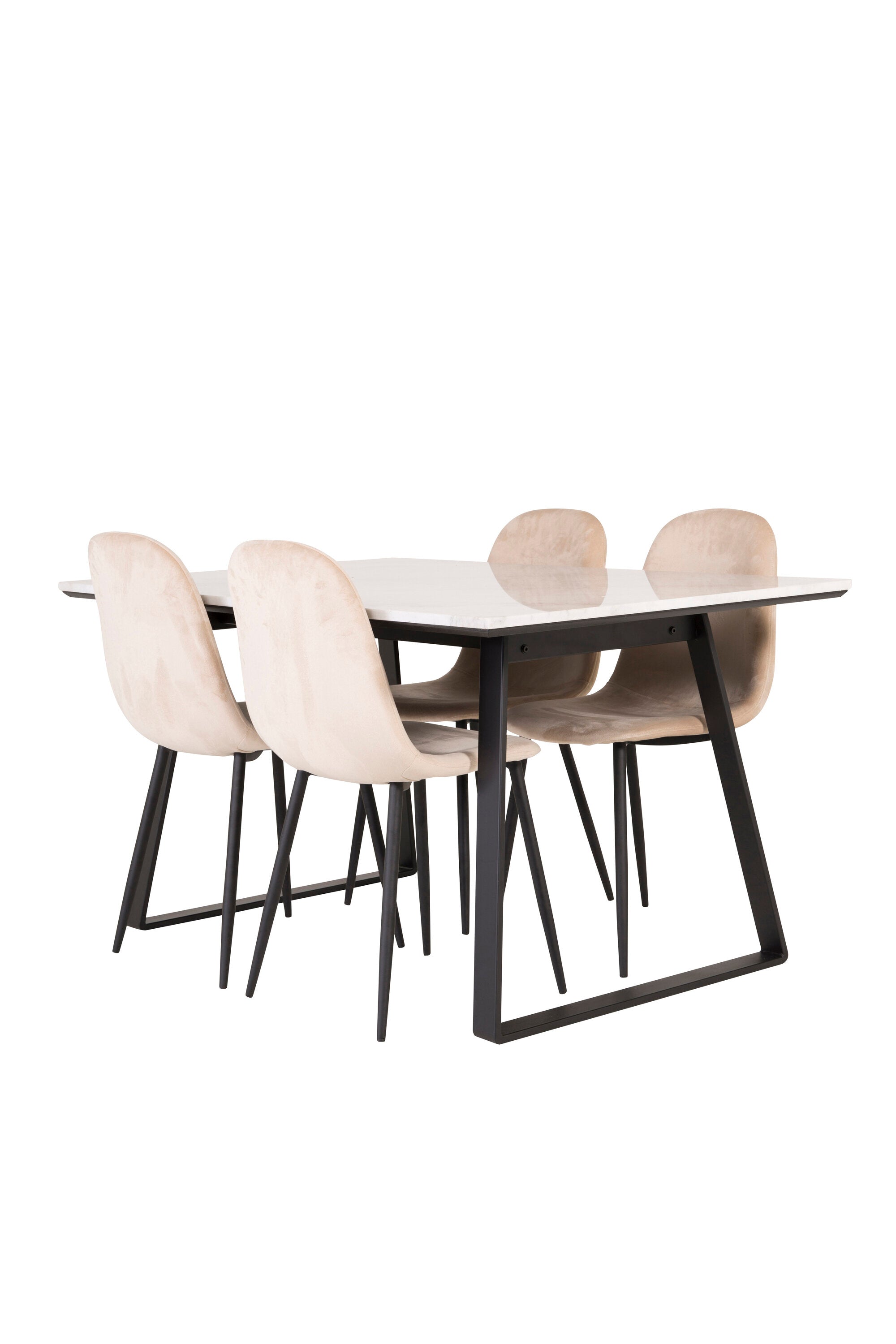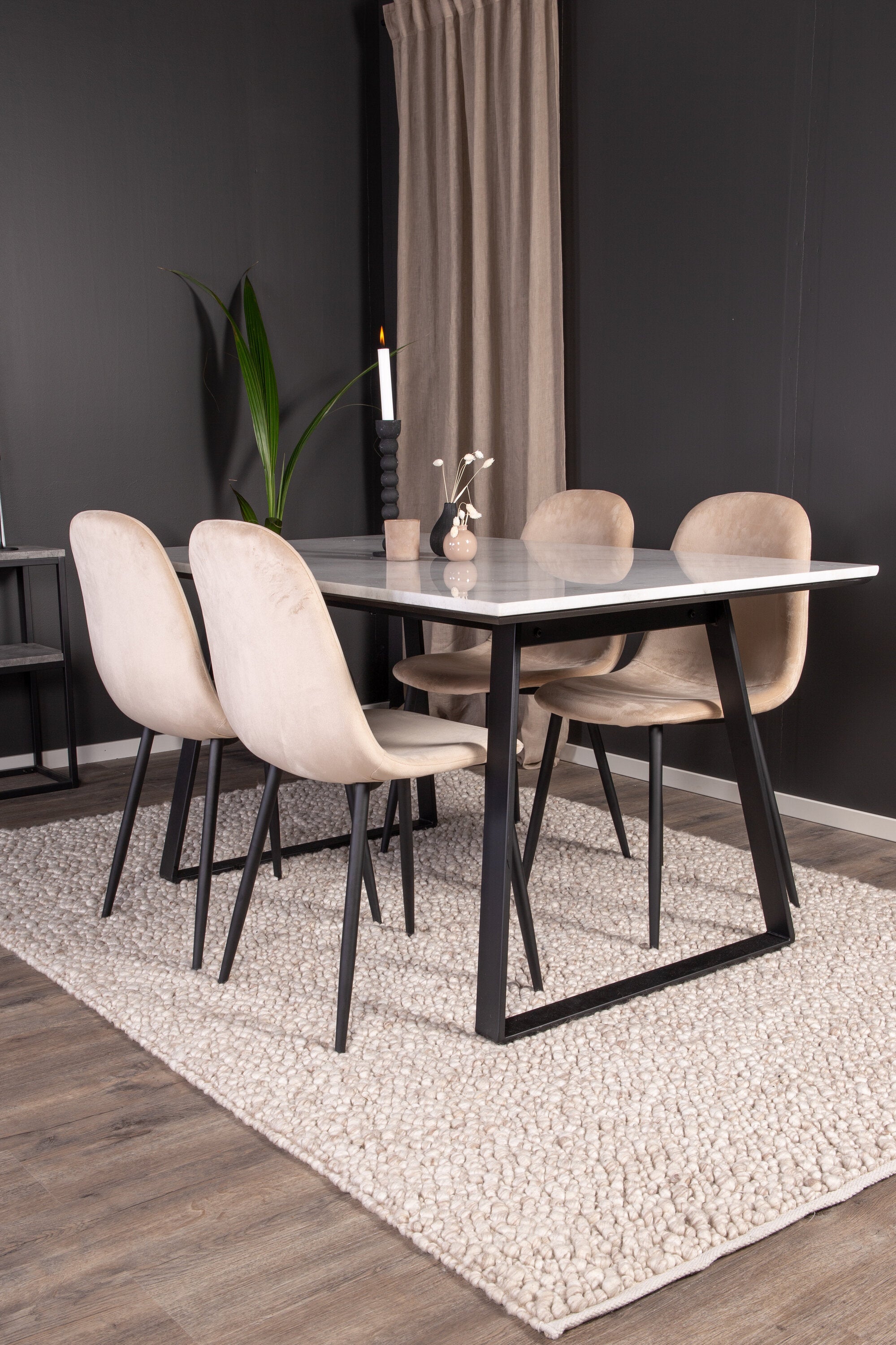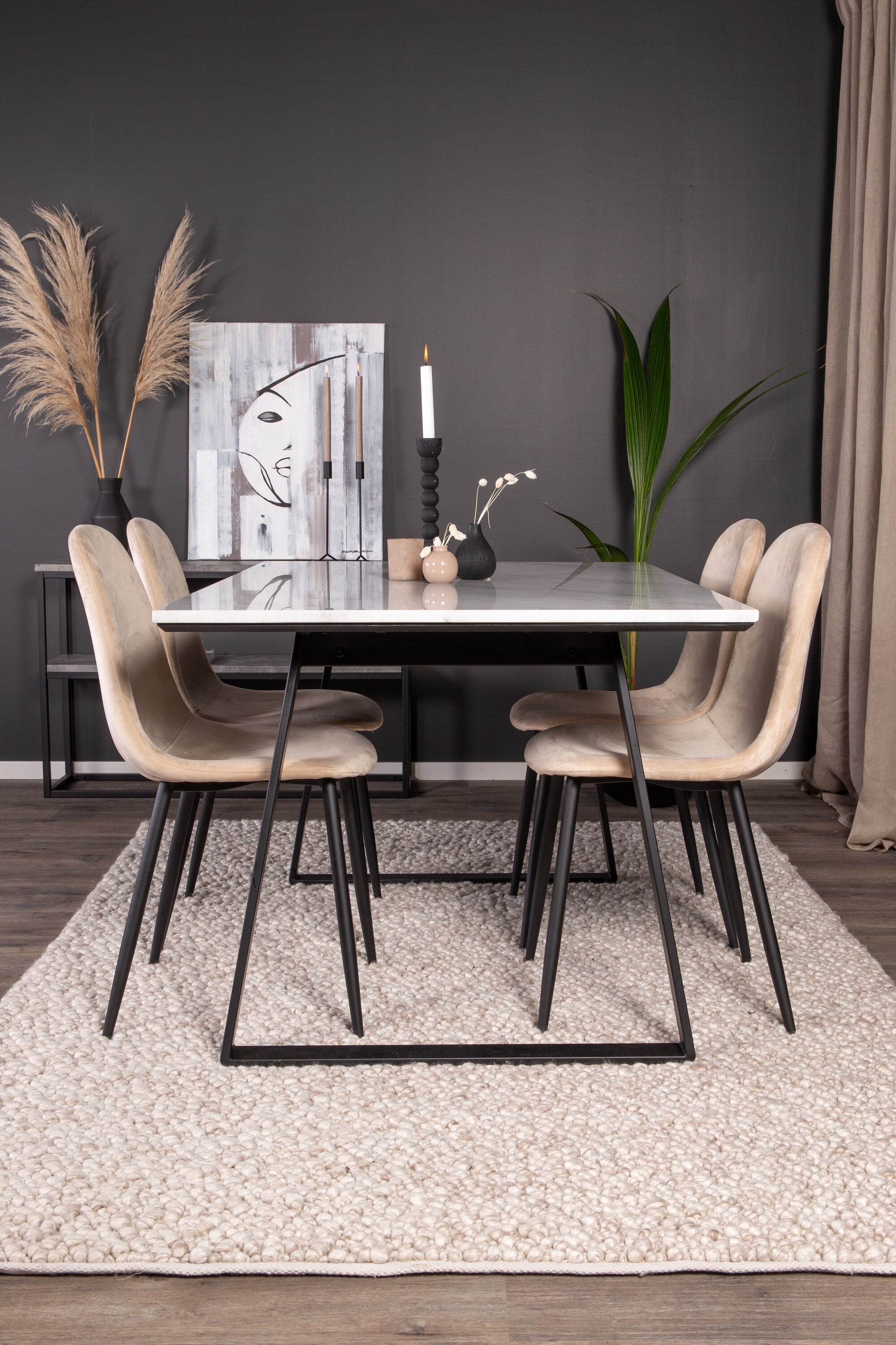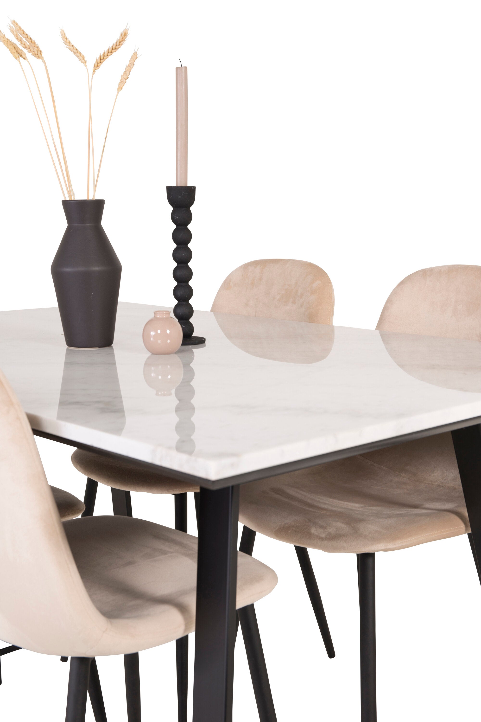 Náš lahodný jídelní stůl Estelle ve stylovém mramorovém vzhledu spolu s béžovými jídelními židlemi Polar. Oblečte svou skupinu jídel nahoru nebo dolů jinou výzdobou všude kolem, která se hodí pro každodenní život i na párty!