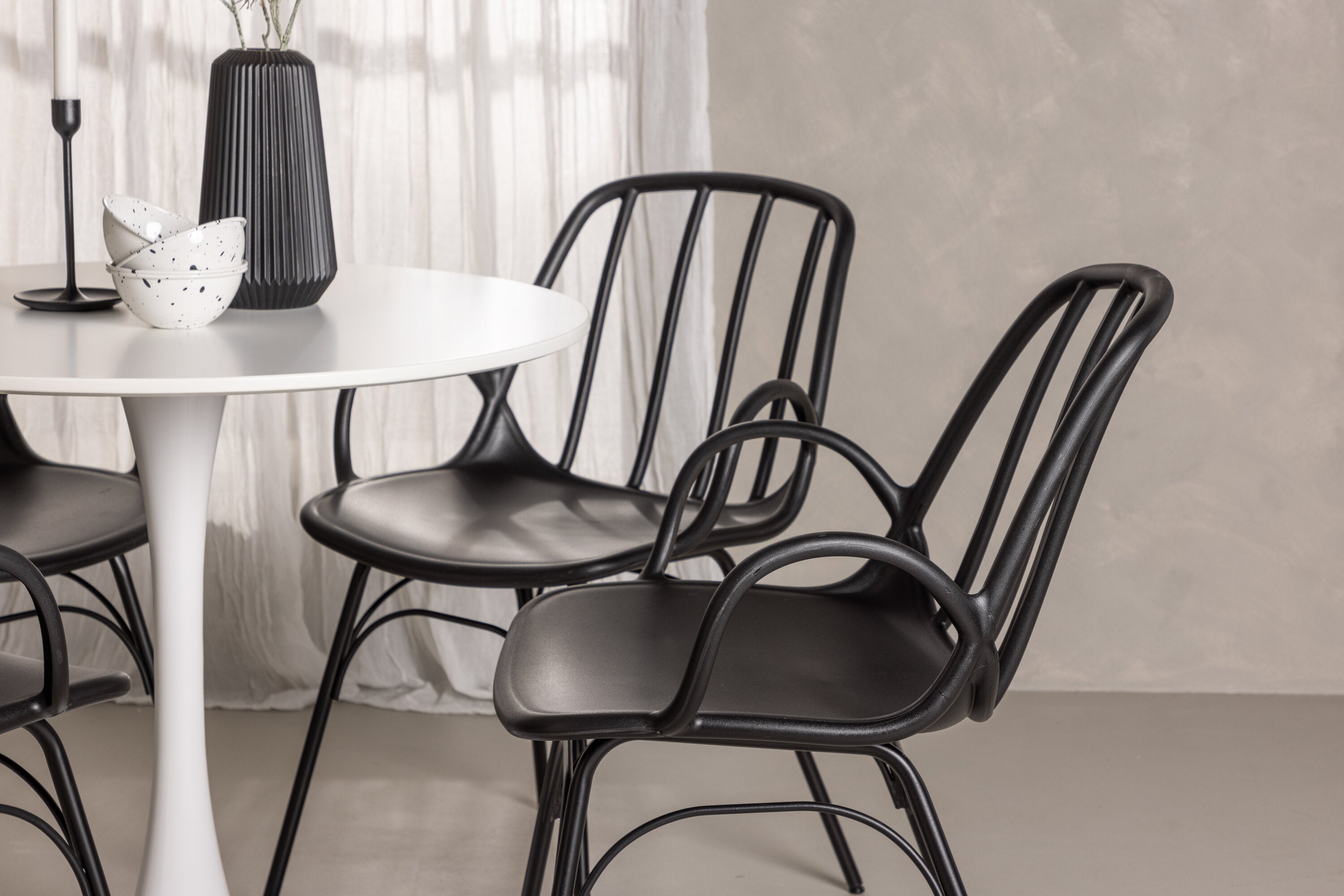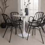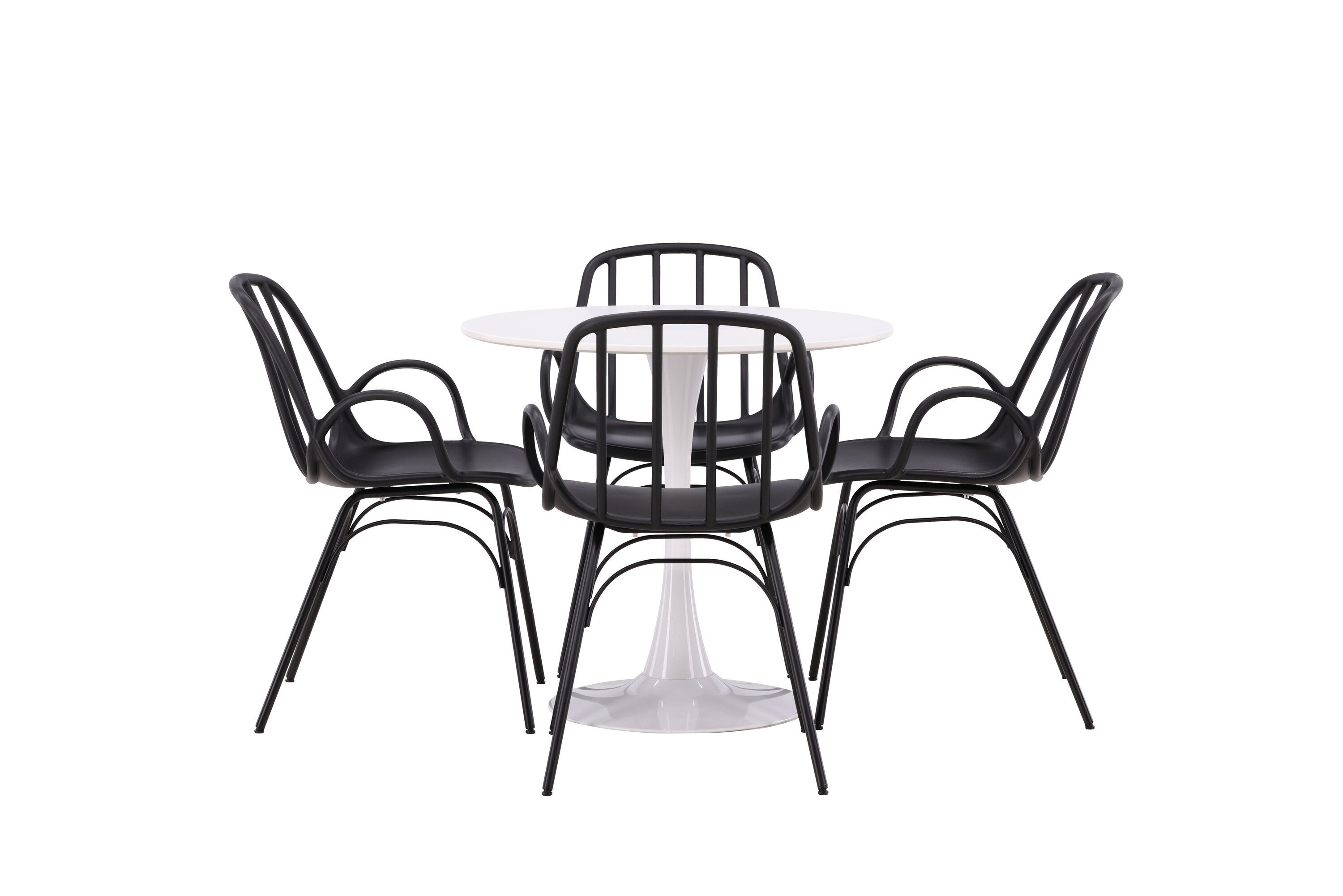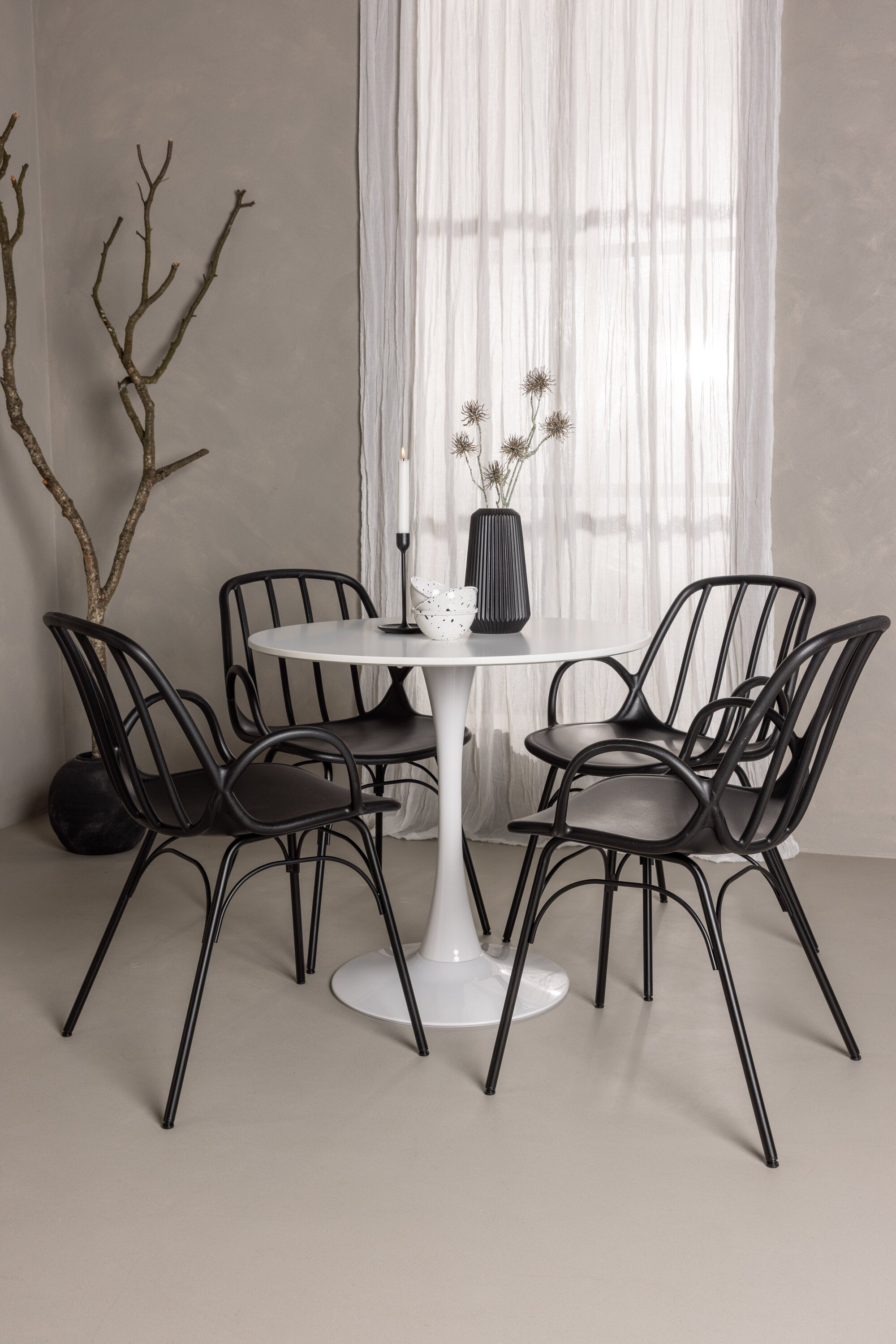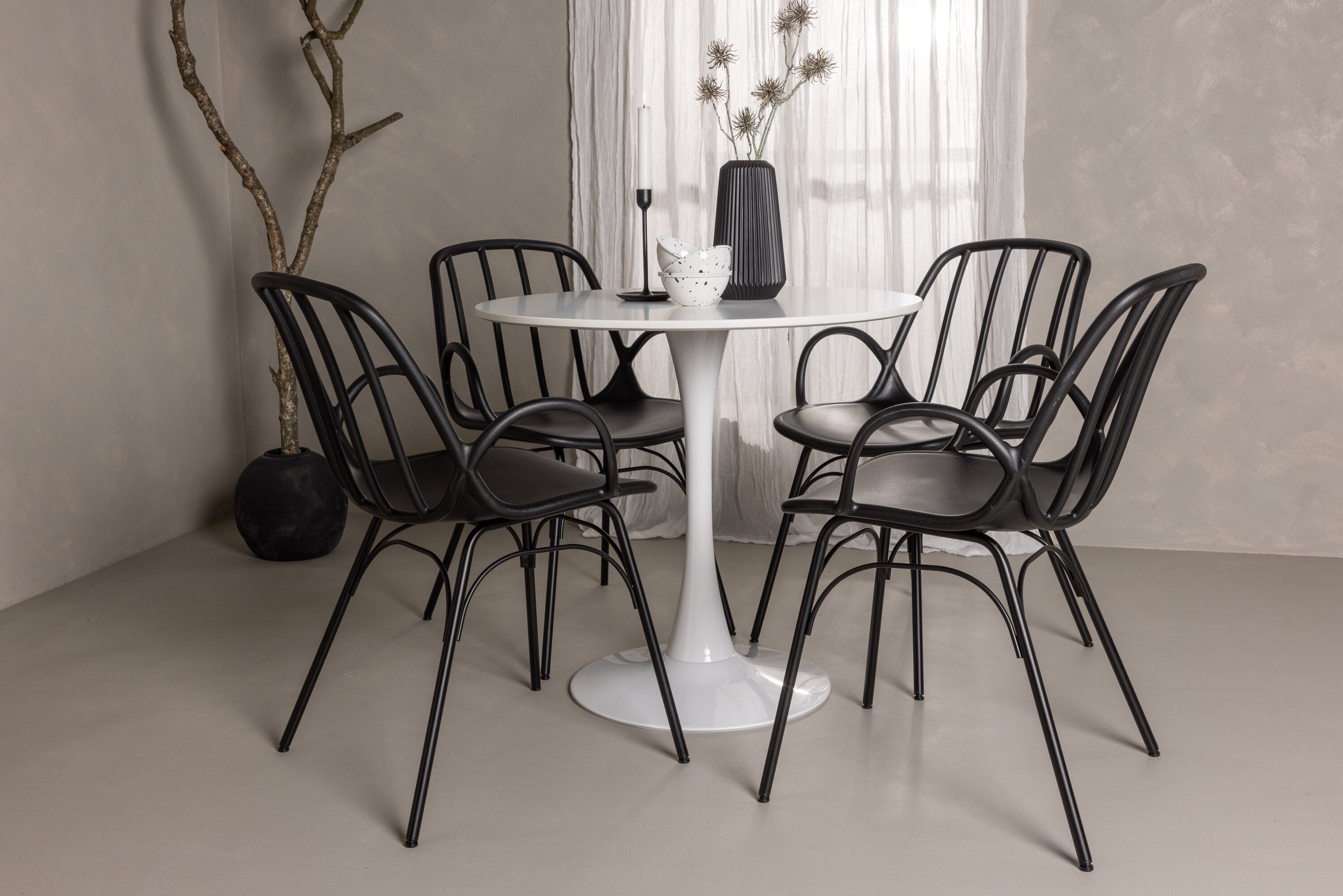 Stůl Hamden má výšku 75 cm a průměr 80 ​​cm, díky čemuž je kompaktní a všestranný. Bílá stolní deska poskytuje jasný a svěží pocit, zatímco černé židle Dyrön vytvářejí silný kontrast a dodávají interiéru moderní nádech.
