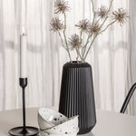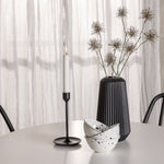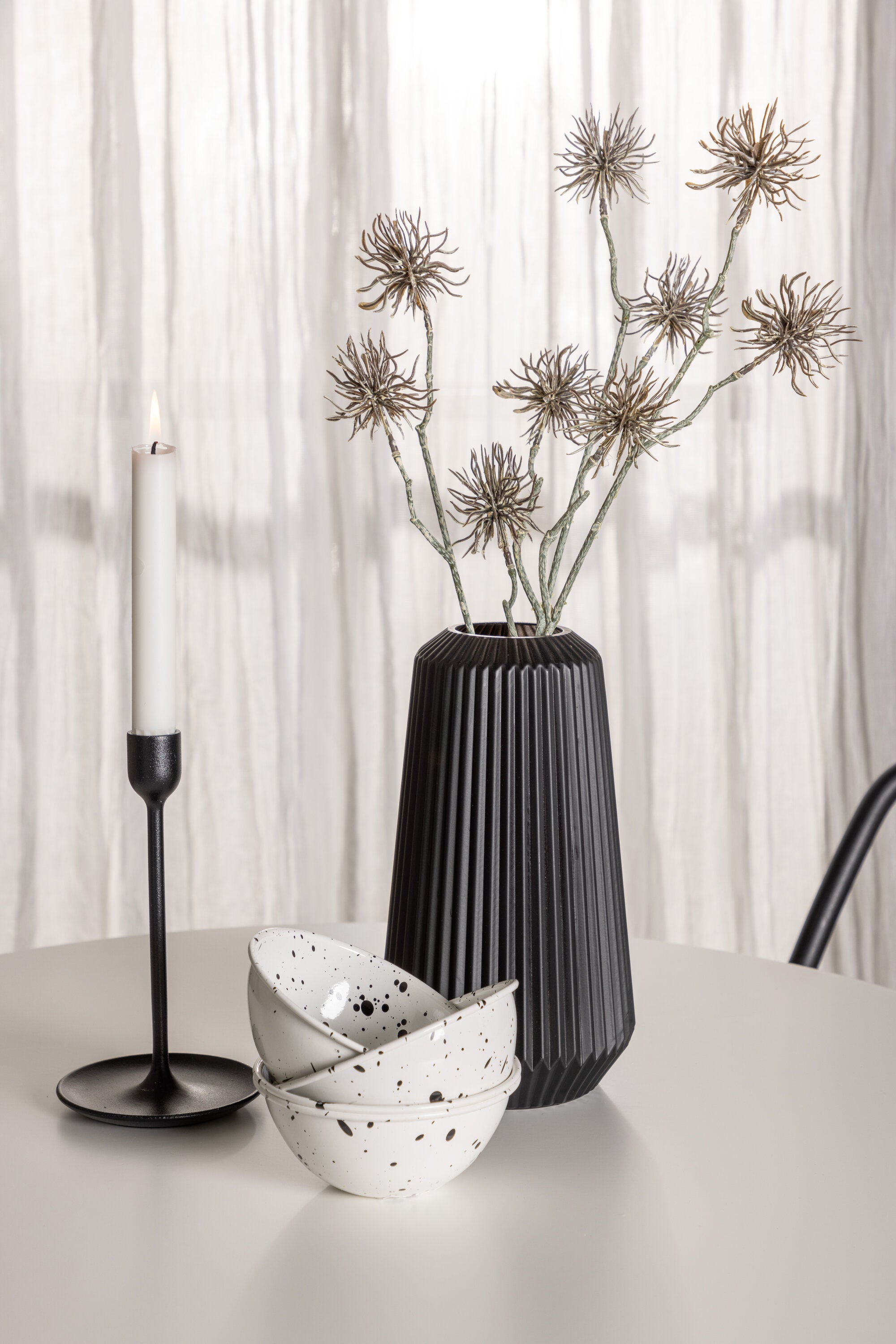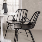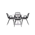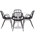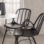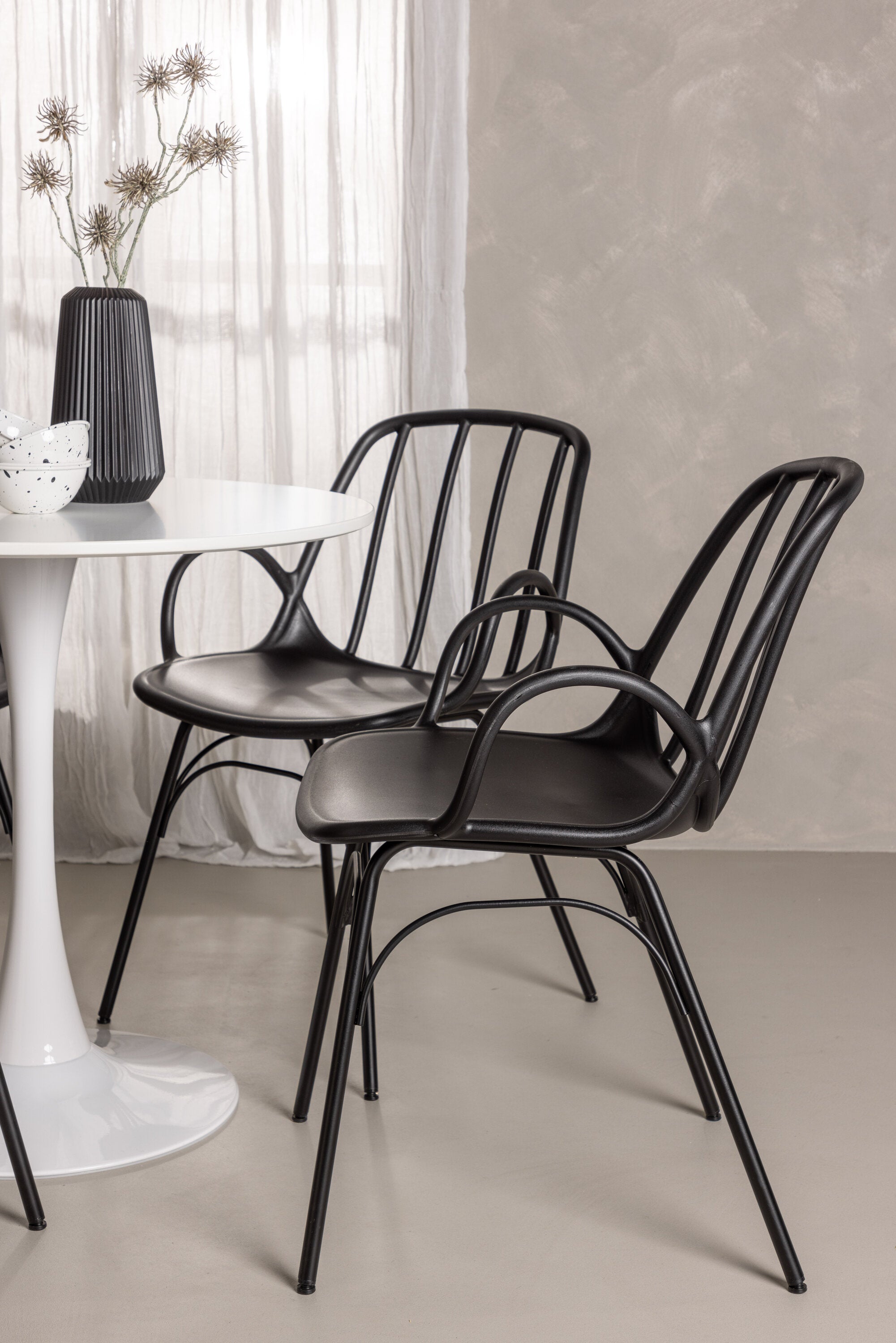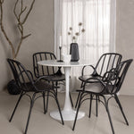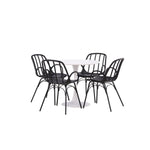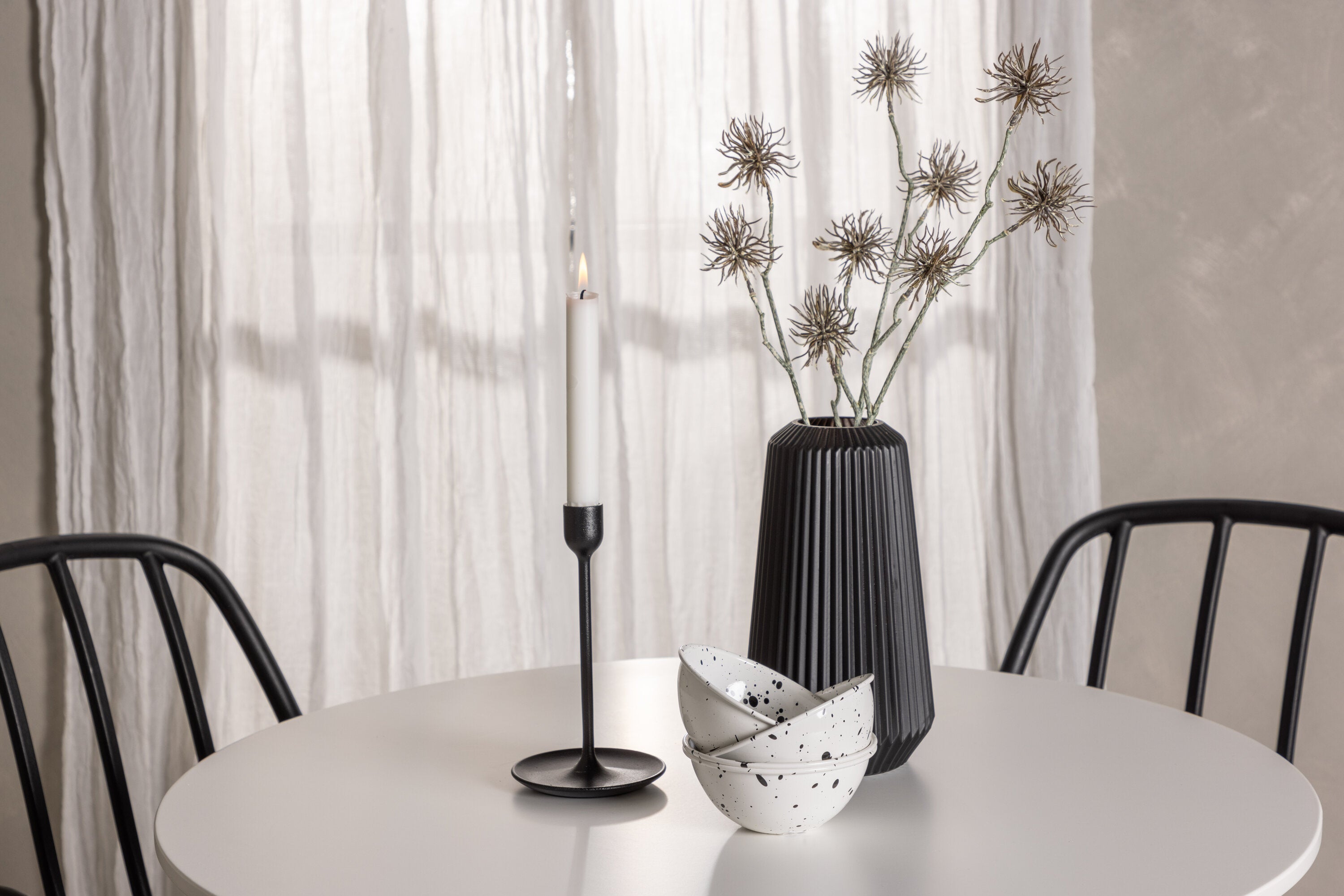 Stůl Hamden má výšku 75 cm a průměr 80 ​​cm, díky čemuž je kompaktní a všestranný. Bílá stolní deska poskytuje jasný a svěží pocit, zatímco černé židle Dyrön vytvářejí silný kontrast a dodávají interiéru moderní nádech.