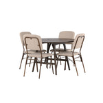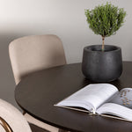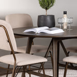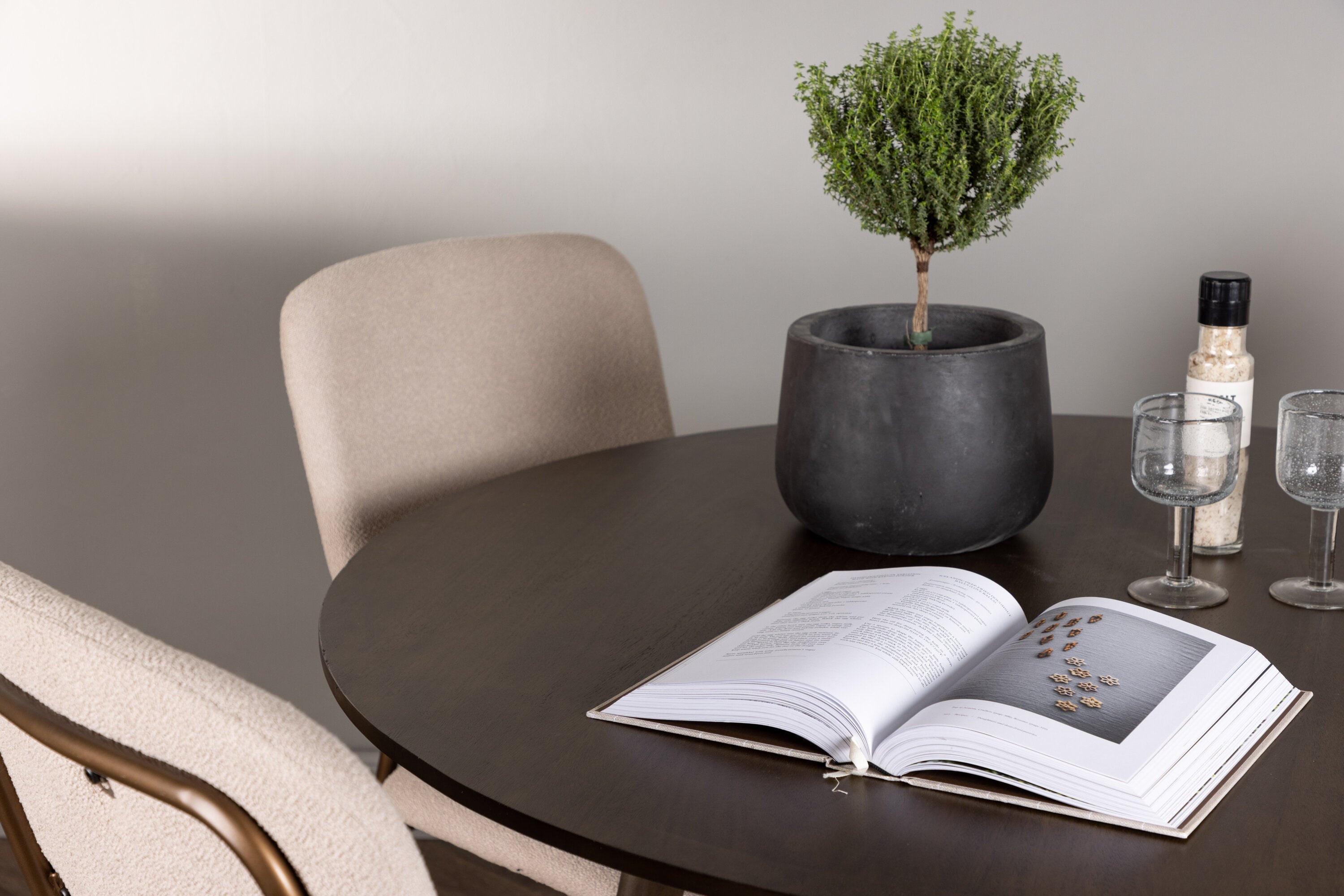 Zde společně s našimi stylovými jídelními židlemi Seda. Béžová polyesterová tkanina židle s texturou a tmavě hnědé ocelové nohy židle vám nabízejí dokonalou rovnováhu mezi elegancí a ležérním luxusem. Zemitá barevná kombinace je elegantní a snadno sladitelná s dalším nábytkem ve vaší domácnosti.