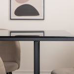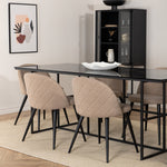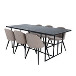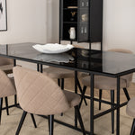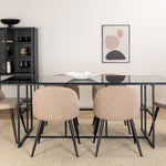 Vyzdobte obývací pokoj moderně a stylově! Jídelní stůl Leif má poutavý design s elegantní horní deskou z kouřového černého skla a rámem z černého kovu – inspirovaný průmyslovými stěnami, které šplhají na žebříčku trendů. Rozměry stolu: Délka: 200 cm, Šířka: 90 cm, Výška: 74 cm. Sladěno se 6 sametovými jídelními židlemi s ozdobným prošíváním v béžovém sedáku z polyesterového lnu a černými nohami židle ze železa. Rozměry židle: Výška: 76,5 cm, výška sedáku: 46,5 cm, šířka: 50 cm, hloubka: 57 cm. Pozvěte dopředu na mnoho příjemných jídel!