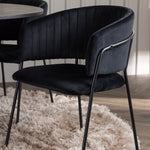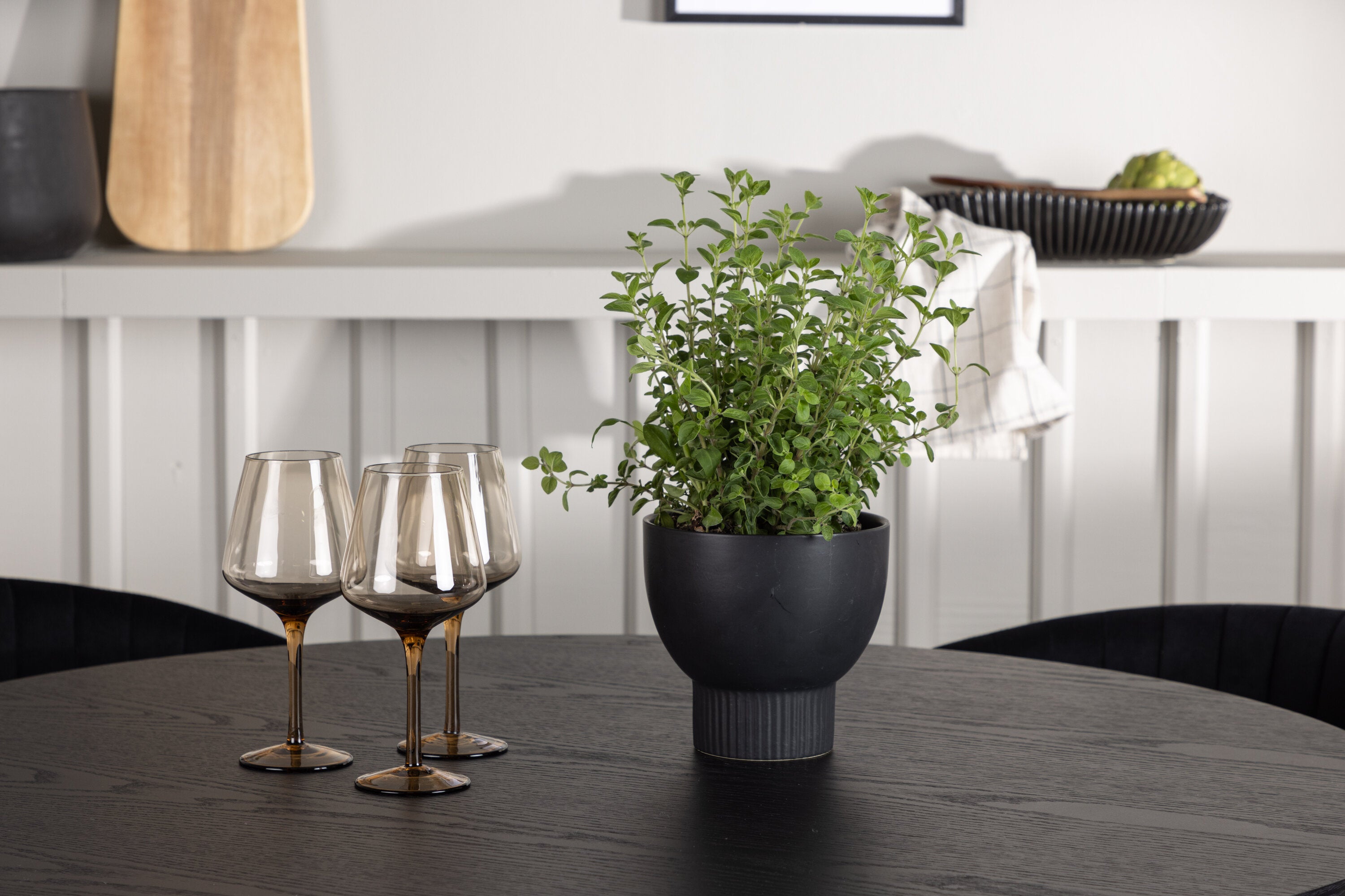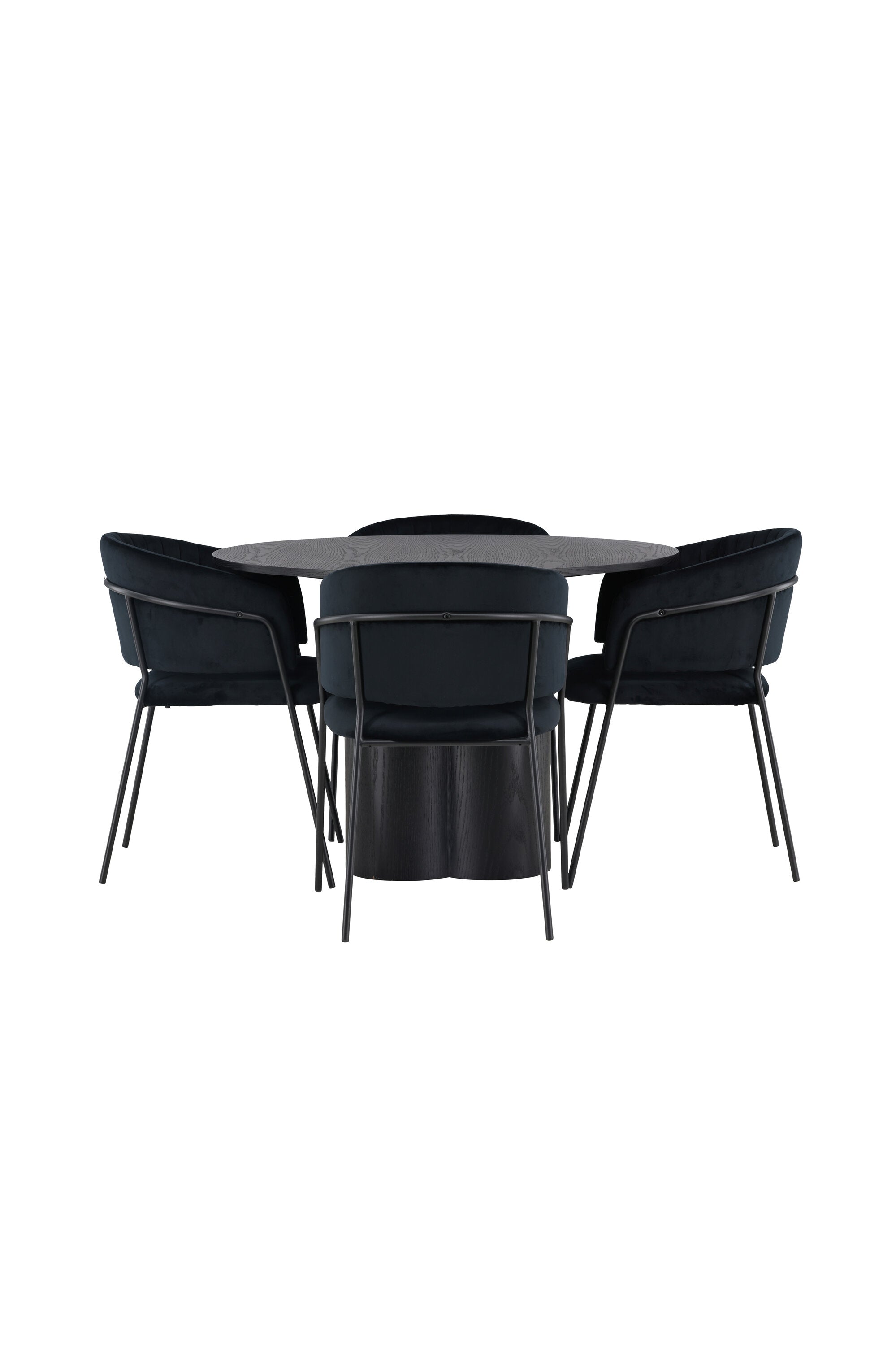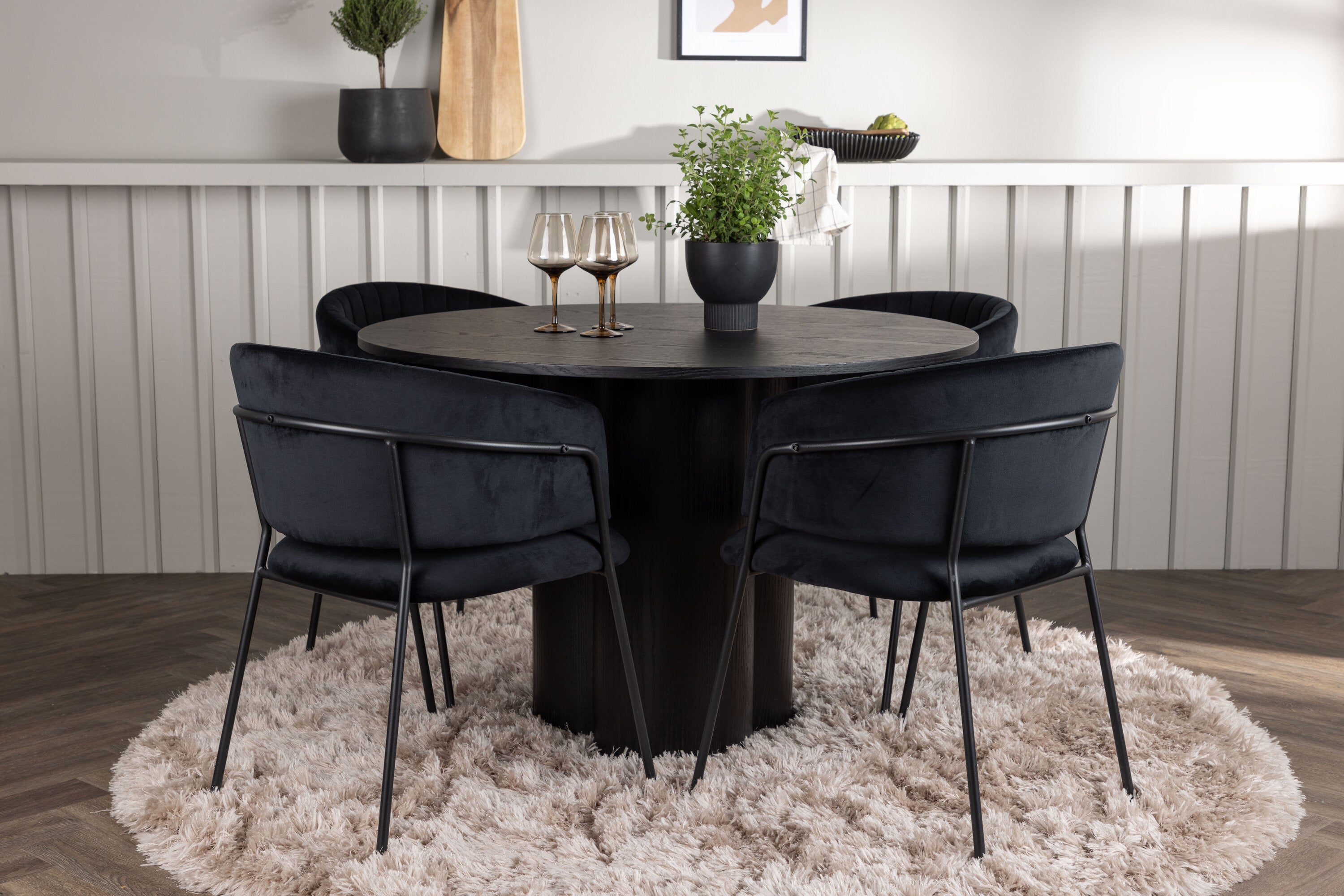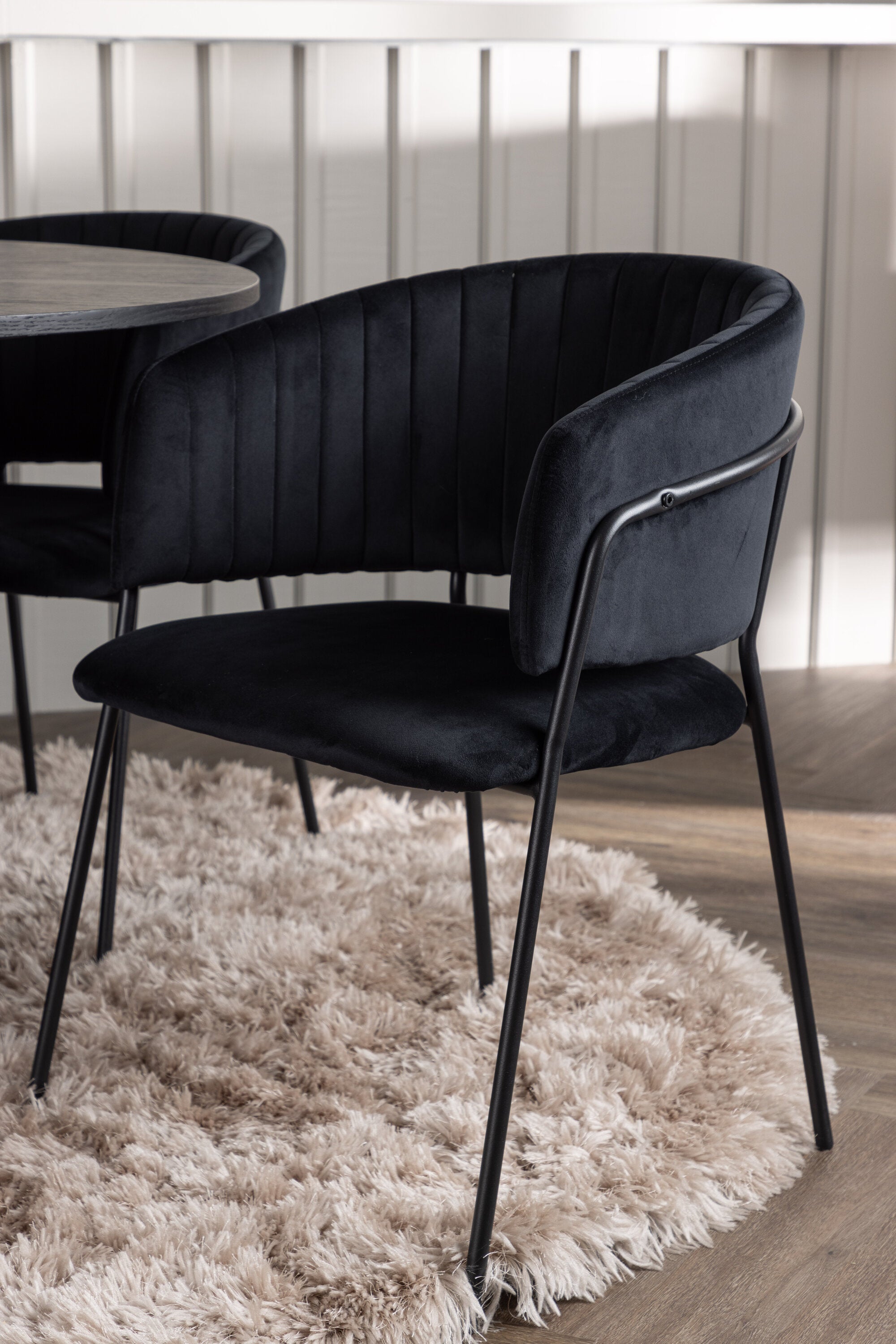 Spolu s naším kulatým jídelním stolem Olivia pocházejí černé jídelní židle Selma. S jejich celočalouněným designem a mírně zakřivenými zády se budete cítit zváni k odpočinku a užít si každý okamžik kolem jídelního stolu. Sametové čalounění a stylové ozdobné švy dodávají židlím luxusní pocit. Nakonec se štíhlé černé ocelové nohy stanou stylovým kontrastem k měkké látce a jemně doplní celkový design.