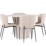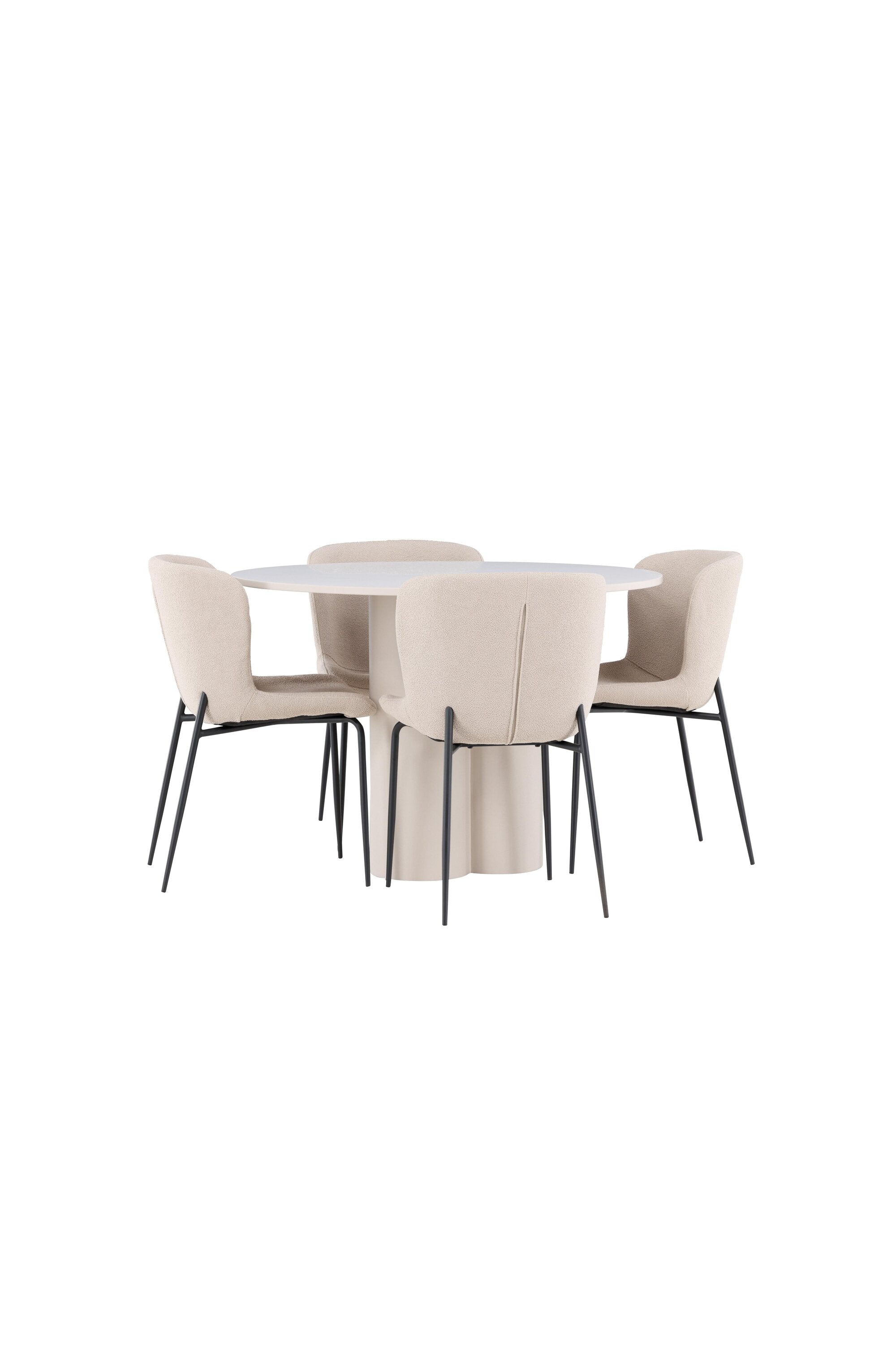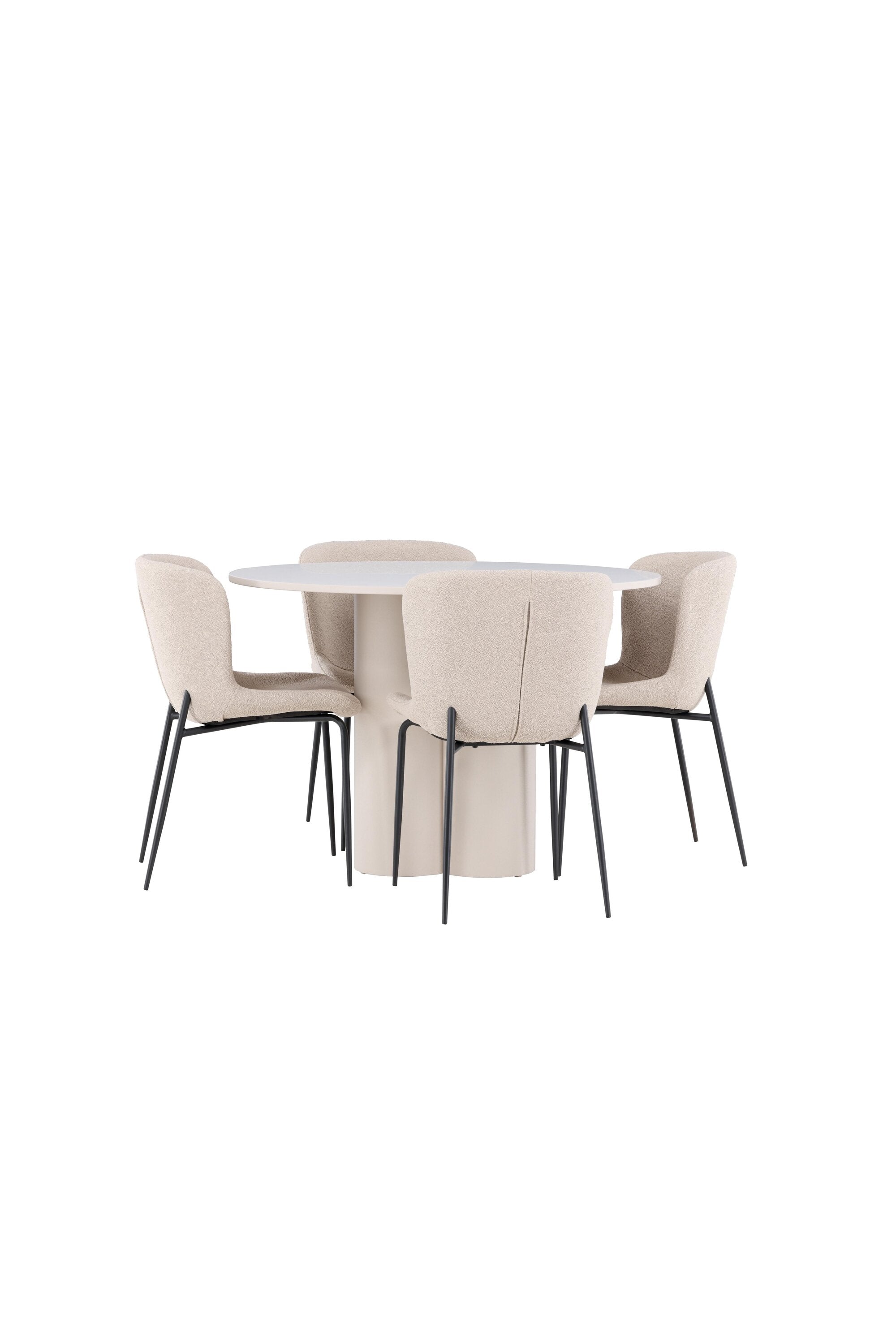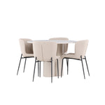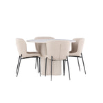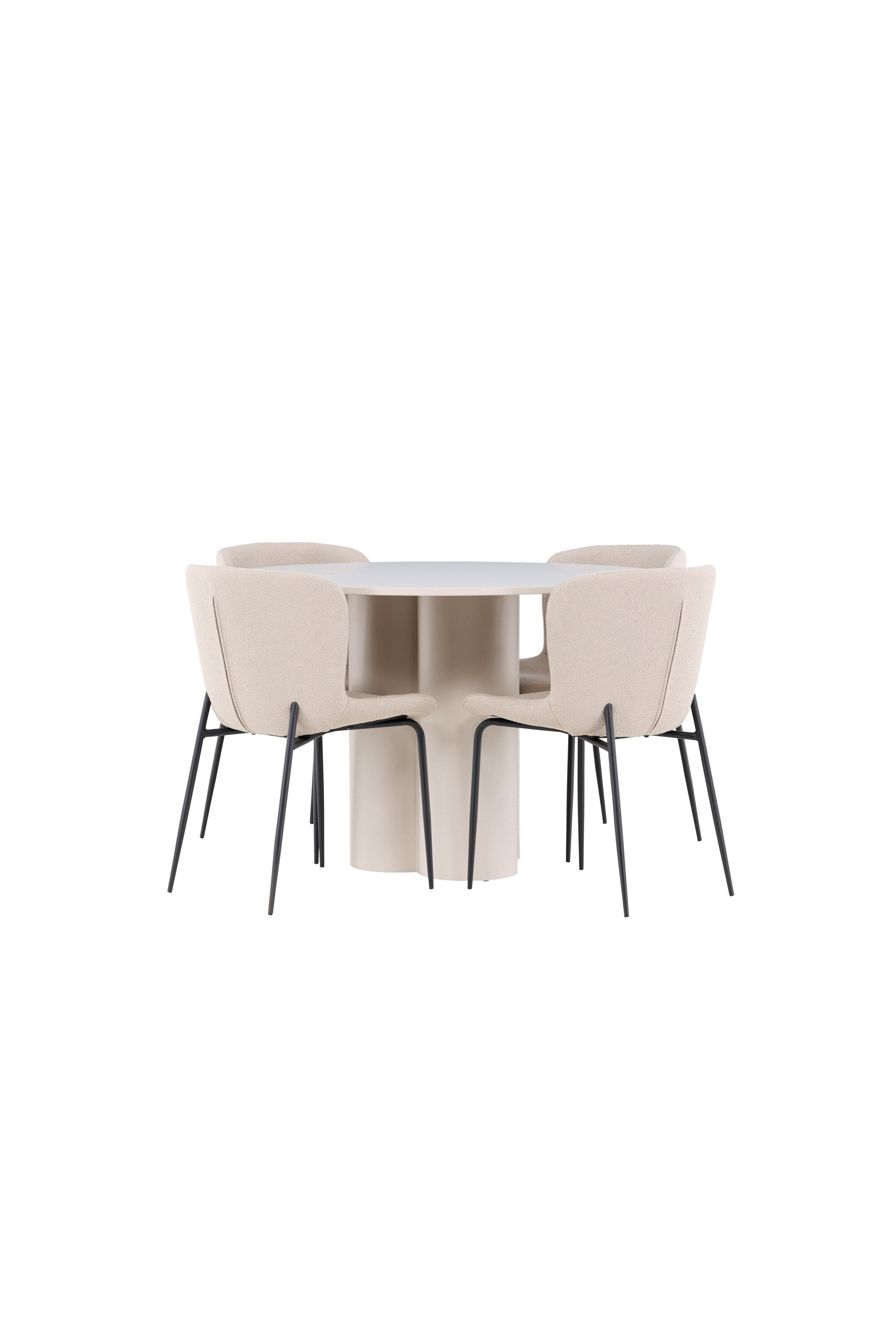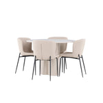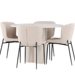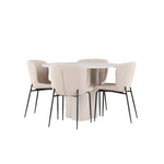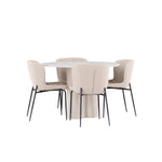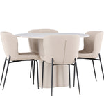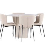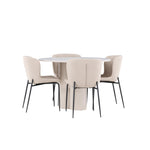 Vytvořte si stylový a příjemný jídelní kout s naší elegantní jídelní sadou, která kombinuje stůl Olivia s pohodlnými židlemi Modesto. Tato jídelní souprava je ideální pro každodenní stravování i slavnostní příležitosti a dodá vaší jídelně moderní a harmonickou atmosféru. Stůl Olivia vyrobený z MDF má světle béžovou barvu, která dodá vaší jídelně hřejivý a příjemný pocit. Stůl s průměrem 110 cm nabízí dostatek prostoru pro jídlo a rozhovory, přičemž jeho kulatý tvar vytváří vyvážené a společenské prostředí. Robustní konstrukce stolu zajišťuje dlouhodobé používání a stabilitu. Čtyři židle Modesto skvěle doplňují stůl svými elegantními sedadly čalouněnými béžovým buklem a elegantními černými nohami. Tyto židle nabízejí pohodlí i styl, takže jsou ideální pro dlouhé a příjemné večeře s rodinou a přáteli. Jejich moderní design s vysokými opěradly a měkkými sedáky dodá vaší jídelně sofistikovaný a moderní nádech. Tato jídelní souprava je dokonalou kombinací estetiky a funkčnosti, takže je vynikající volbou pro ty, kteří hledají elegantní a pohodlný jídelní kout. Vylepšete svou jídelnu kombinací stolu Olivia a židlí Modesto a vytvořte si místo, kde se budou sdílet vzpomínky a radost.