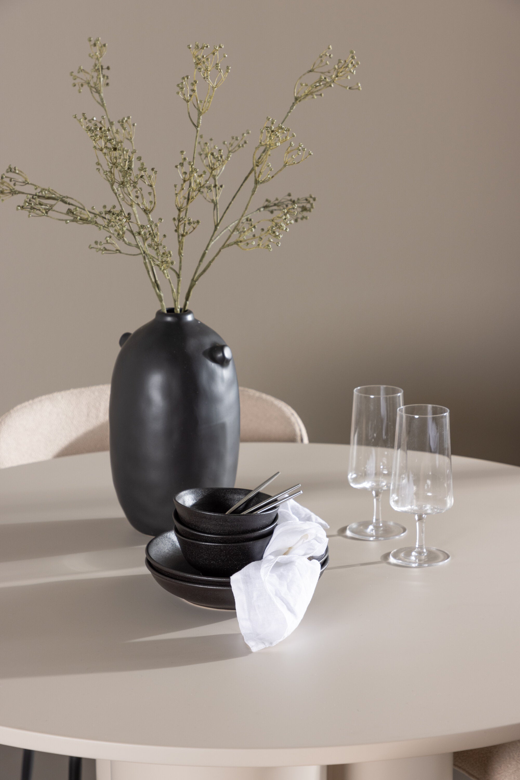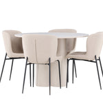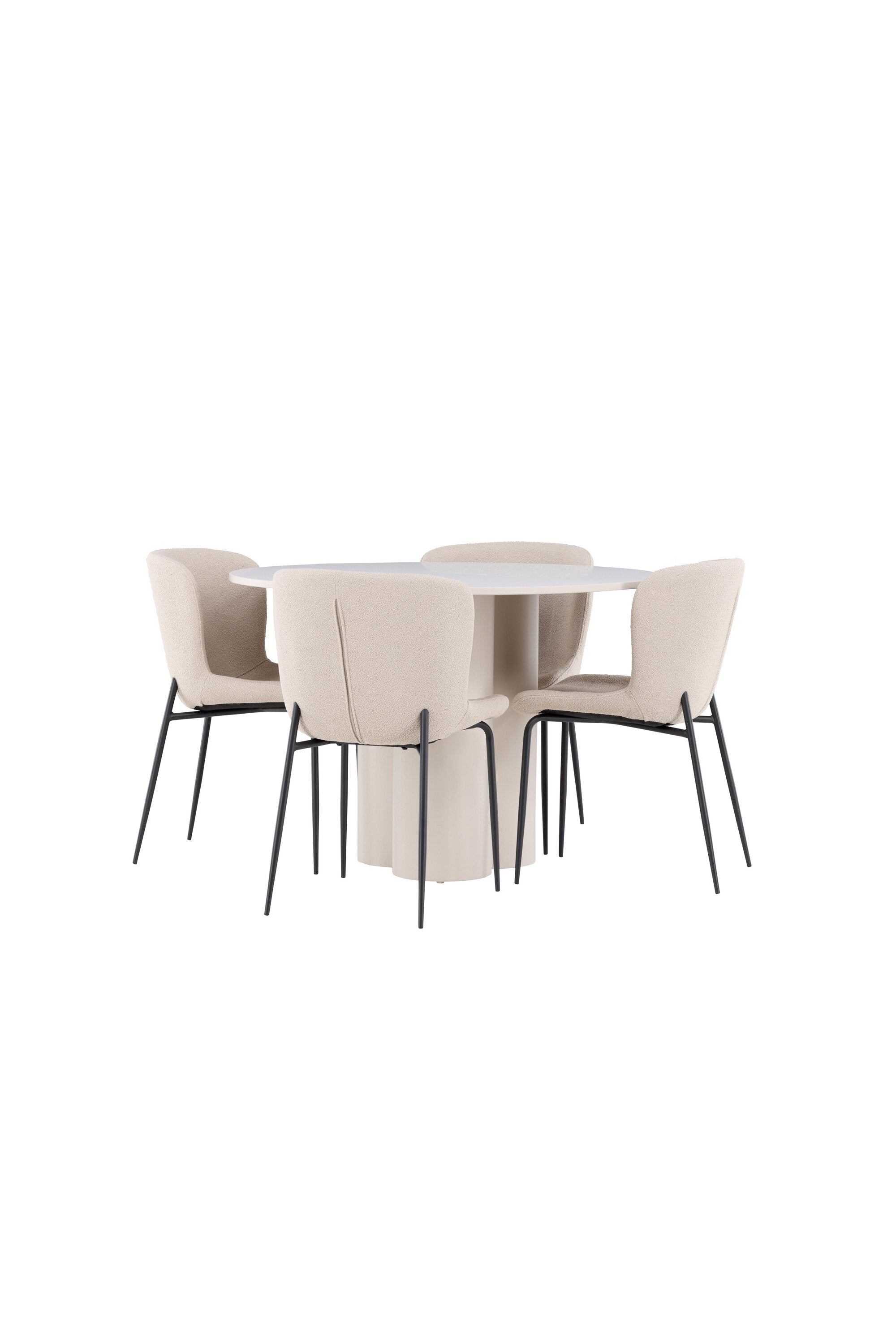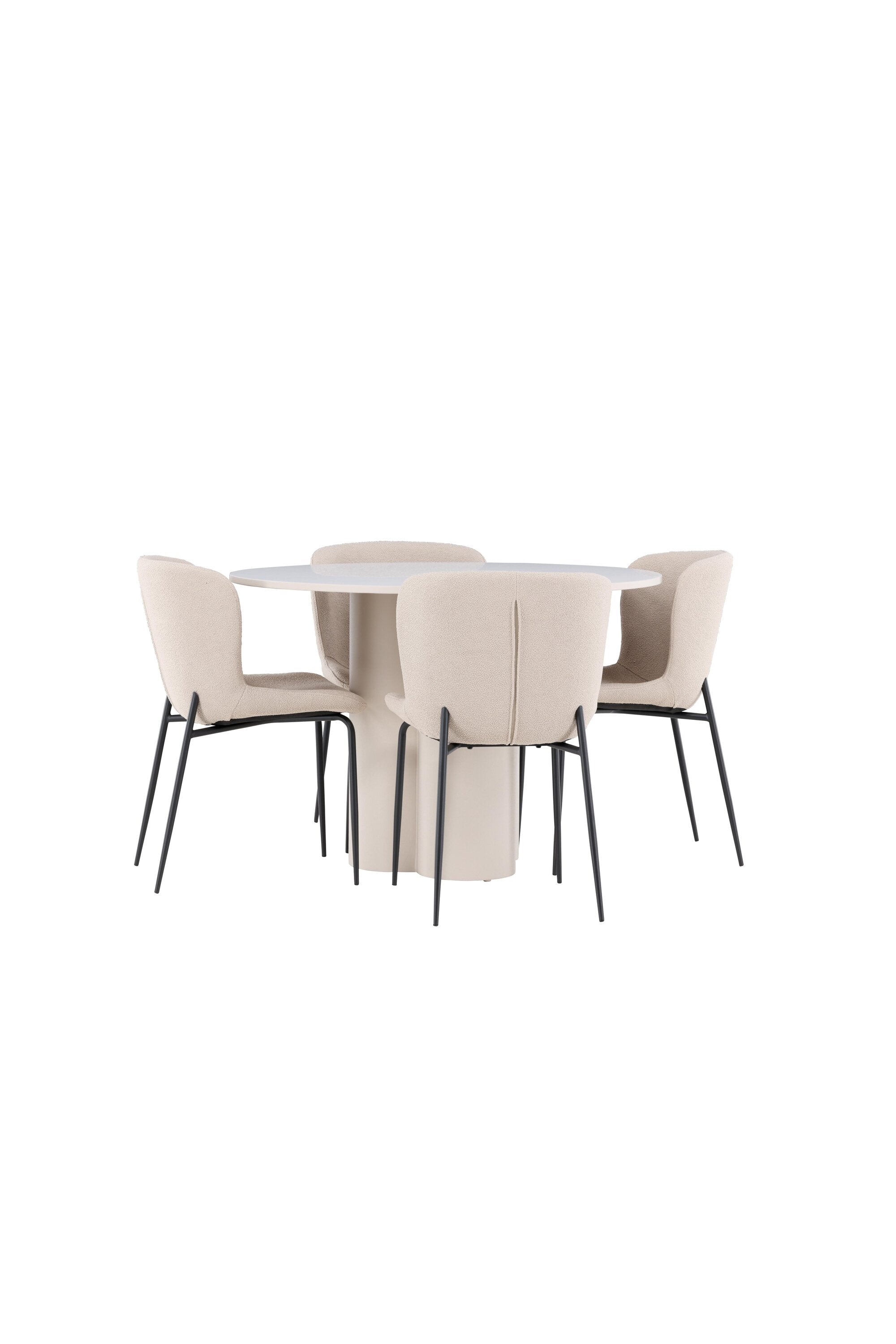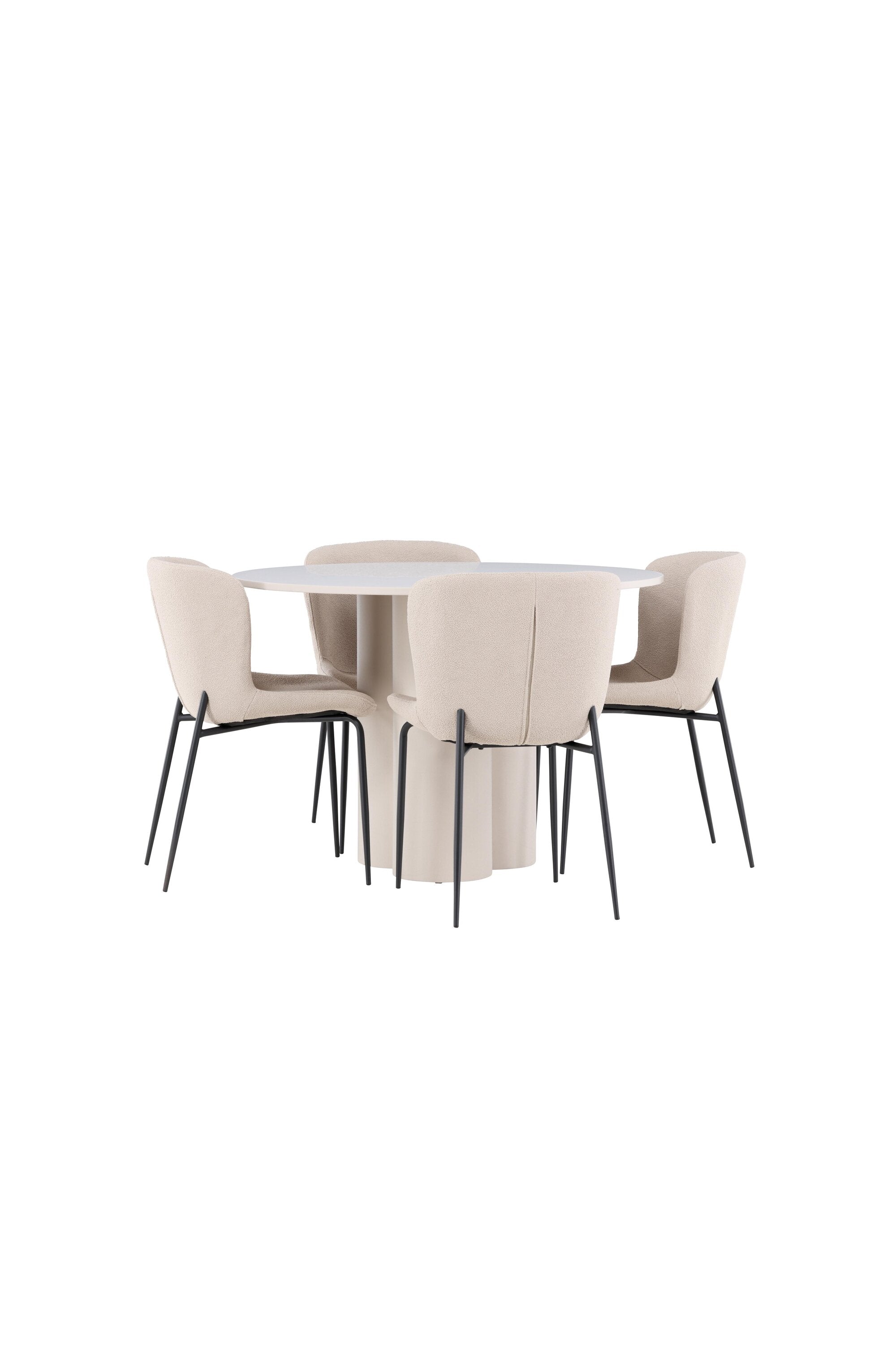 Vytvořte si stylový a příjemný jídelní kout s naší elegantní jídelní sadou, která kombinuje stůl Olivia s pohodlnými židlemi Modesto. Tato jídelní souprava je ideální pro každodenní stravování i slavnostní příležitosti a dodá vaší jídelně moderní a harmonickou atmosféru. Stůl Olivia vyrobený z MDF má světle béžovou barvu, která dodá vaší jídelně hřejivý a příjemný pocit. Stůl s průměrem 110 cm nabízí dostatek prostoru pro jídlo a rozhovory, přičemž jeho kulatý tvar vytváří vyvážené a společenské prostředí. Robustní konstrukce stolu zajišťuje dlouhodobé používání a stabilitu. Čtyři židle Modesto skvěle doplňují stůl svými elegantními sedadly čalouněnými béžovým buklem a elegantními černými nohami. Tyto židle nabízejí pohodlí i styl, takže jsou ideální pro dlouhé a příjemné večeře s rodinou a přáteli. Jejich moderní design s vysokými opěradly a měkkými sedáky dodá vaší jídelně sofistikovaný a moderní nádech. Tato jídelní souprava je dokonalou kombinací estetiky a funkčnosti, takže je vynikající volbou pro ty, kteří hledají elegantní a pohodlný jídelní kout. Vylepšete svou jídelnu kombinací stolu Olivia a židlí Modesto a vytvořte si místo, kde se budou sdílet vzpomínky a radost.