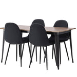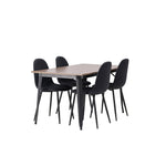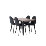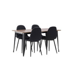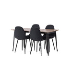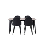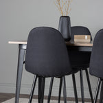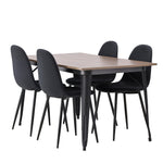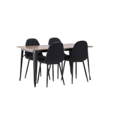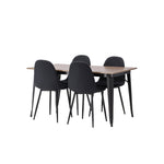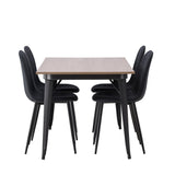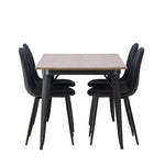 Stylová jídelní skupina v severských podobách! Jídelní stůl ze série Tempe má stylový, skandinávský design. Vyrobeno ze čtvercové desky stolu z MDF v barvě ořechu a nohou stolu z černého kovu. Zde je stůl kombinován s černými jídelními židlemi ze série Polar. Židle má zaoblený design s klasickým designem - stejně praktická jako nadčasová. Opěradlo a sedák jsou čalouněny černou polyesterovou tkaninou a nohy černým práškovým kovem. Jednoduše, úžasná kombinace! Rozměry stolu: 140x80cm.