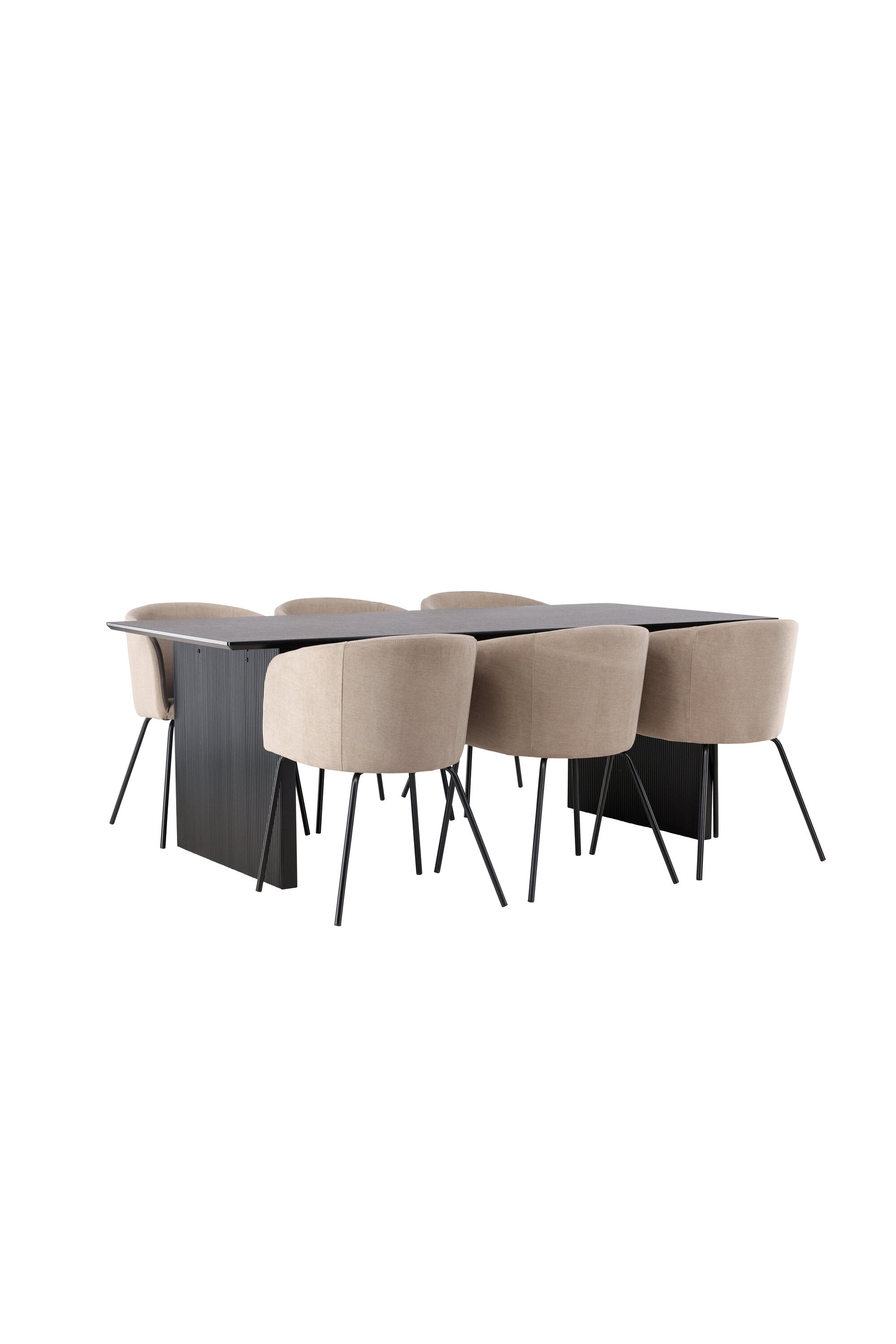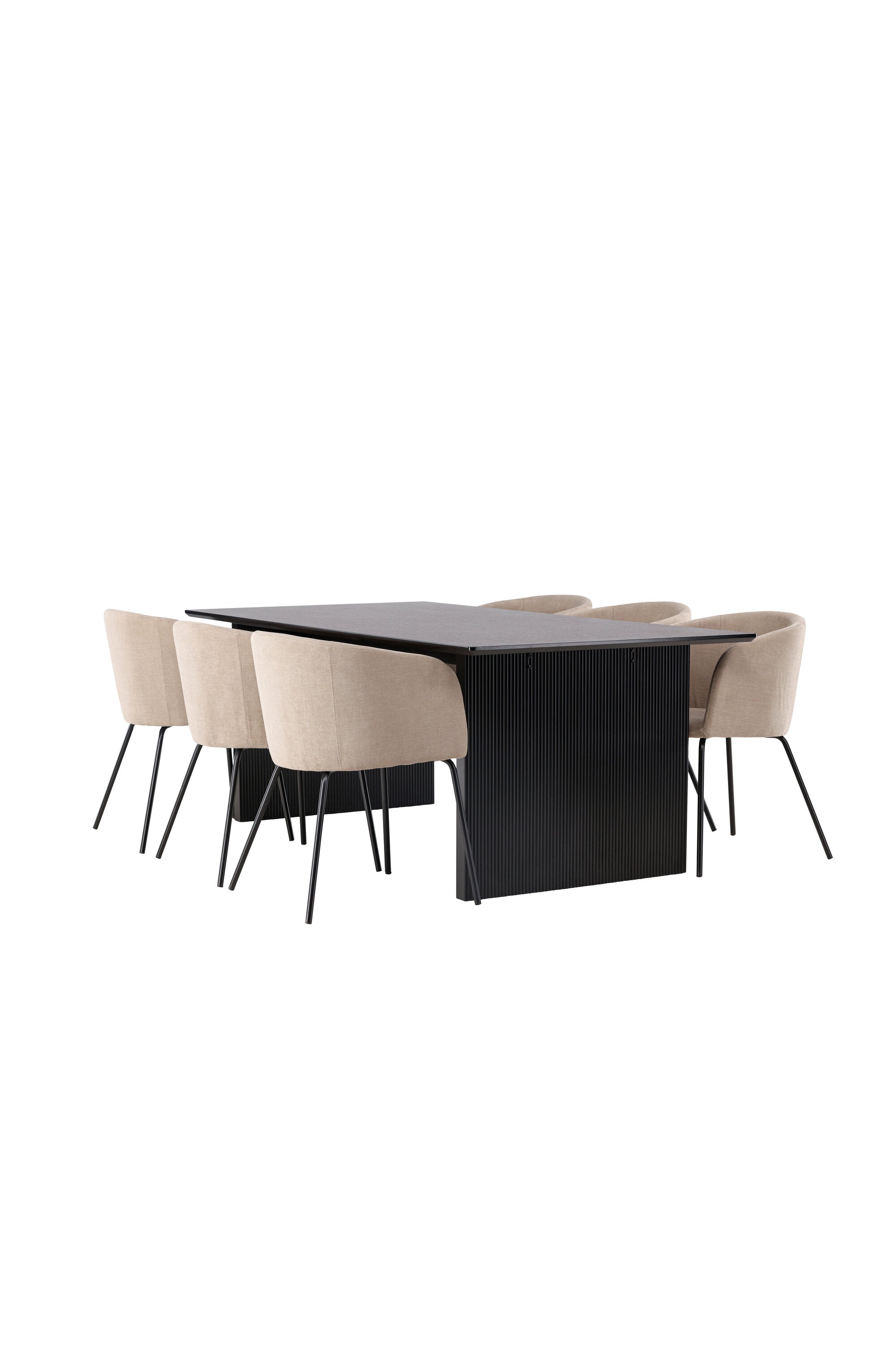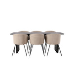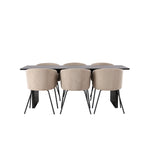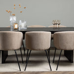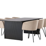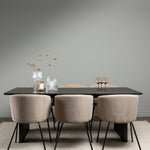 Fantastická jídelní skupina se všemi správnými funkcemi! Obdélníkový jídelní stůl Vail má rovné severské tvary a je vyroben z odolné MDF v ušpiněné černé barvě. Stolová deska je tenká v obdélníkovém designu a balancuje na dvou pevných dřevěných deskách, které tvoří základnu. Zde spolu s našimi pohodlnými jídelními židlemi Berit. Židle má celočalouněný design s mírně zaobleným opěradlem a sedákem z polyesterového lnu a úzkými nohami z černého železa. Zde získáte luxusní a zvoucí jídelní skupinu! Rozměry stolu: 200x100cm.