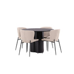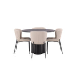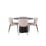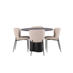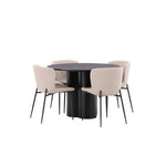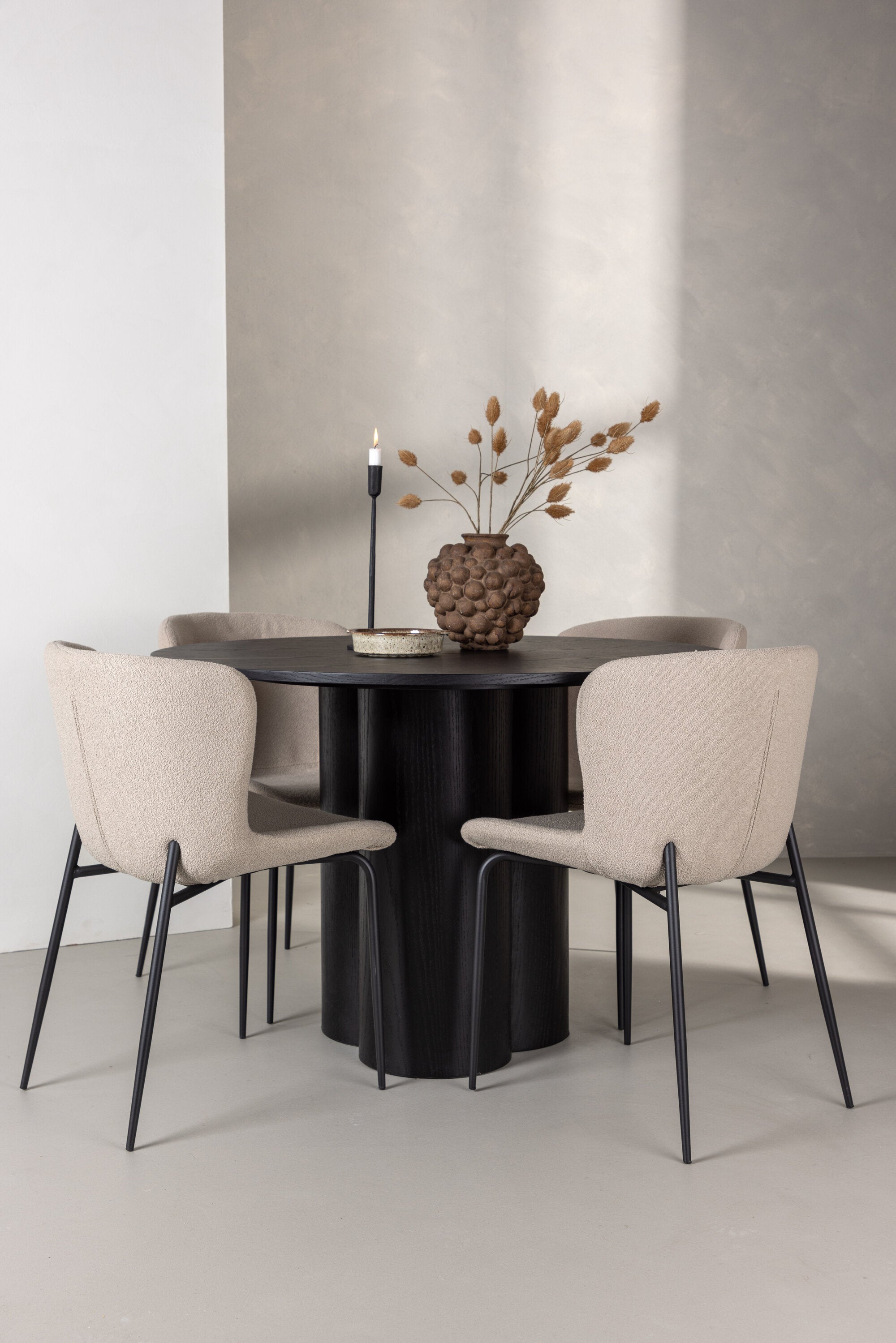Vytvořte si příjemnou atmosféru v srdci svého domova s ​​touto stylovou skupinou jídel! Židle jsou ze série Modesto a mají čalounění béžovou chlupatou bouclé látkou a minimalistické nohy v černém kovu. Mírně zaoblená záda a čalouněný sedák poskytují extra pohodlí. Skvěle se hodí k jídelnímu stolu Olivia. Stůl má celý holistický design v černé MDF s tenkou, kulatou deskou a třemi nohami ve tvaru válce, které jsou shromážděny pod středem stolu. Barva má na dýhované desce světlý obal, díky kterému je viditelný vzor materiálu. Mělo by to být příjemné sedět u dobrého jídla!