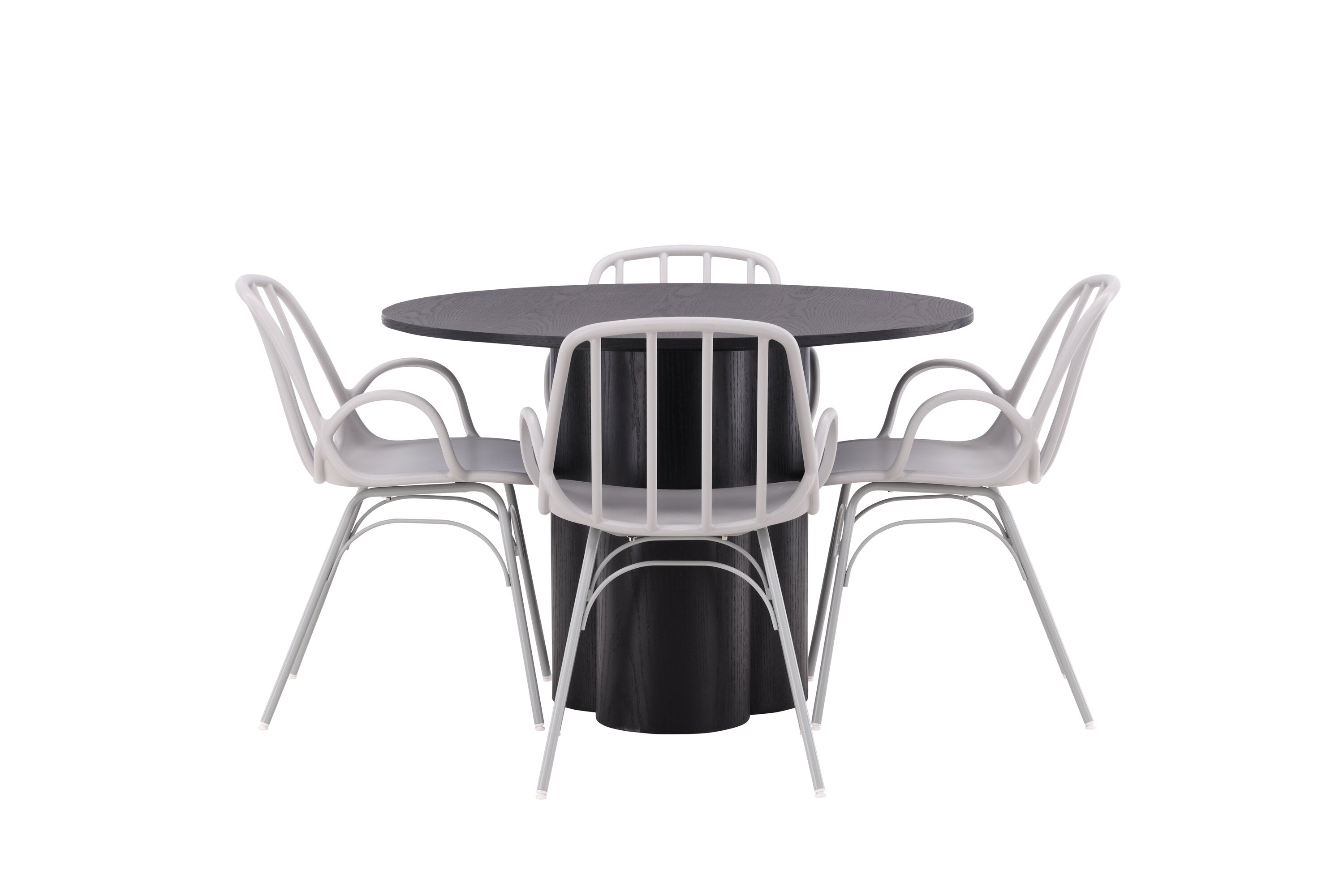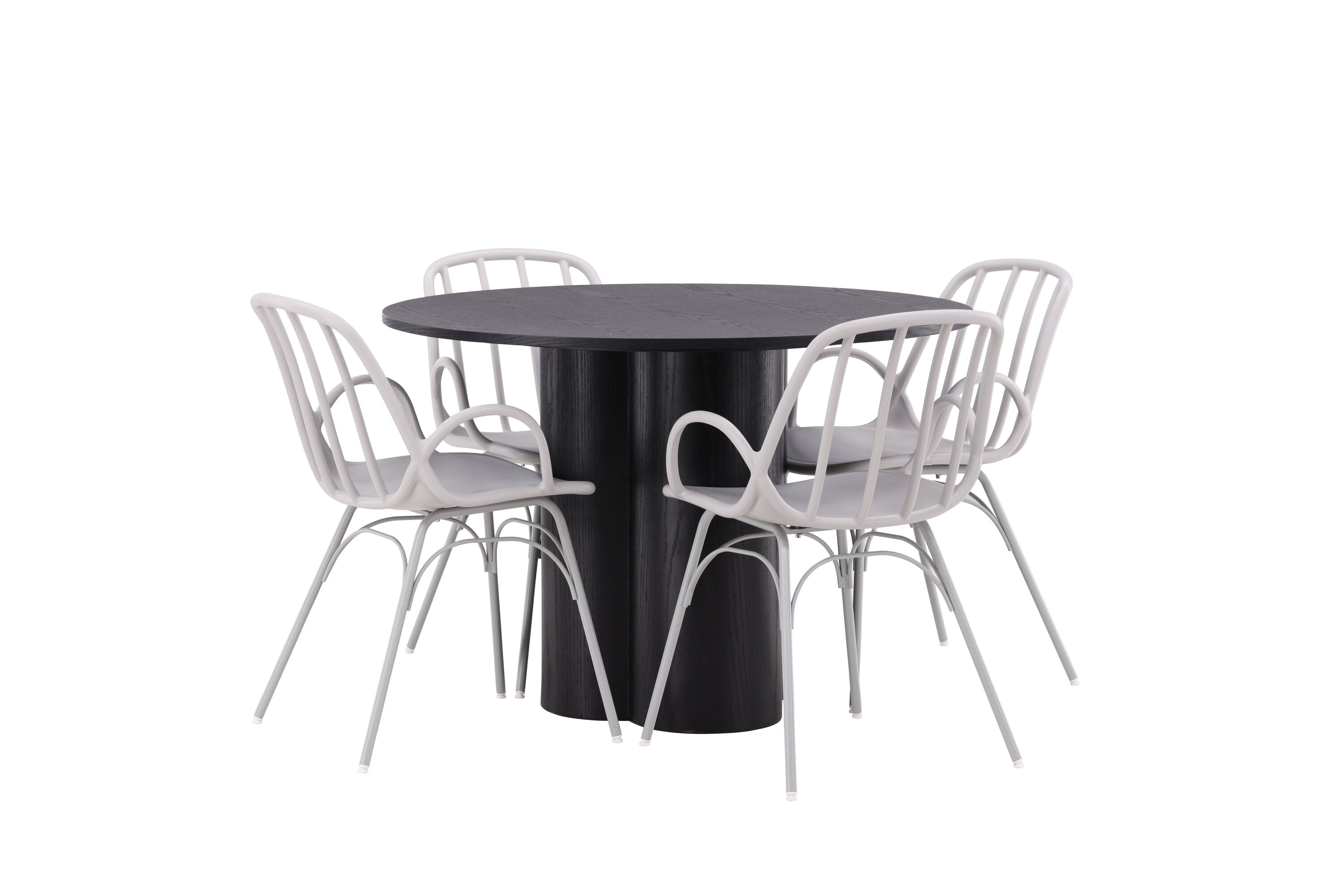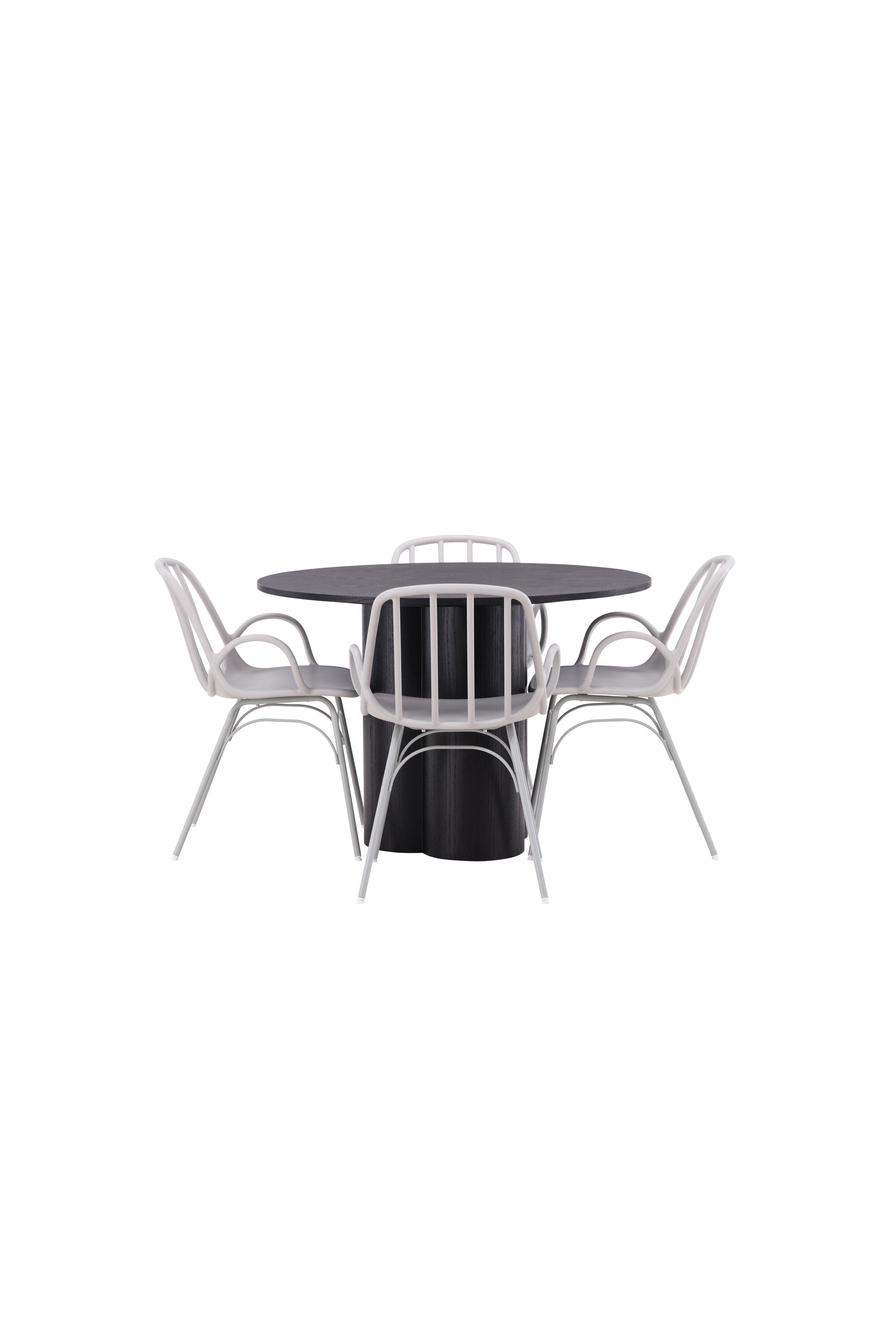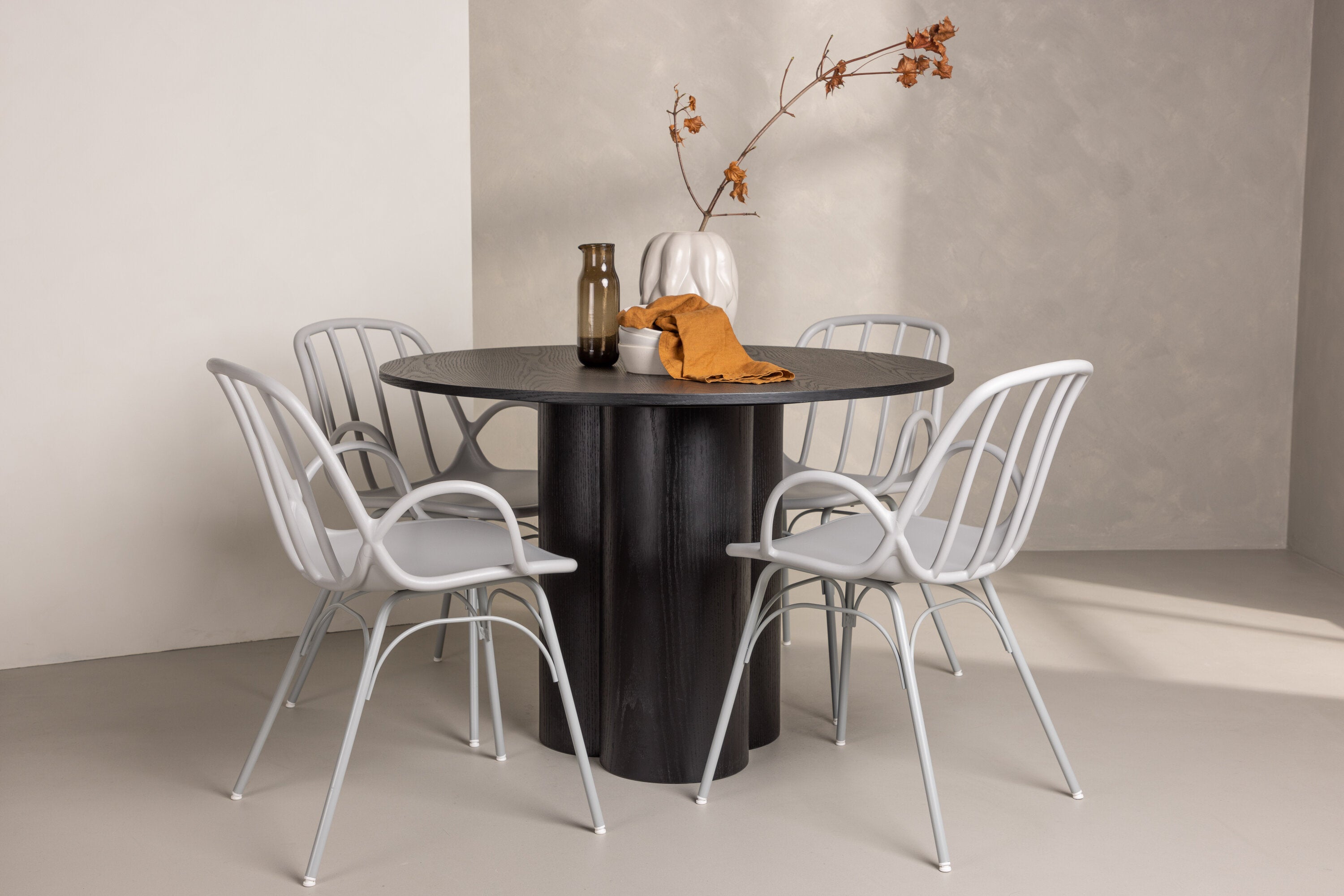 Je to zápas! Vychutnejte si příjemná jídla u našeho oblíbeného jídelního stolu Olivia. Stůl má celý holistický design v černé MDF s tenkou, kulatou deskou a třemi nohami ve tvaru válce, které jsou shromážděny pod středem stolu. Barva má na dýhované desce světlý obal, díky kterému je viditelný vzor materiálu. Zde společně s odolnými jídelními židlemi ze série Dyrön. Tato židle má detailní design se zakřivenými tvary, integrovanými područkami a rozšířenými nohami, důsledně vyrobena z odolného plastu a oceli v štíhlé šedé barvě. Vytvořte si moderní poutač v obývacím pokoji!