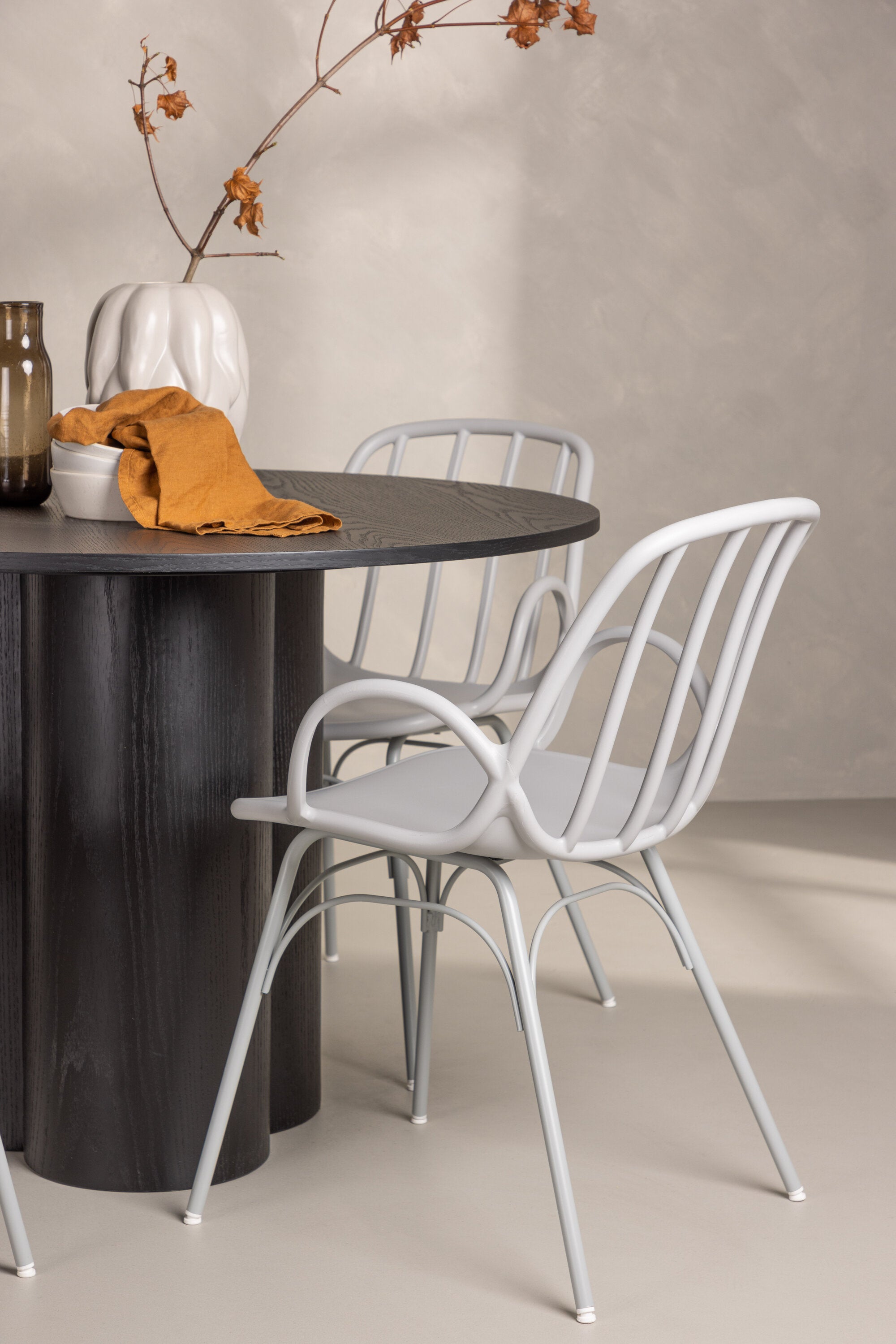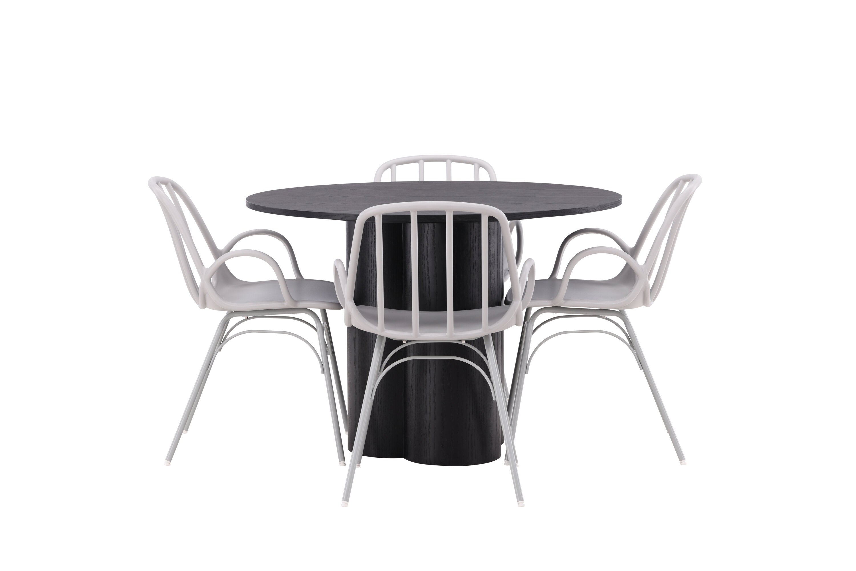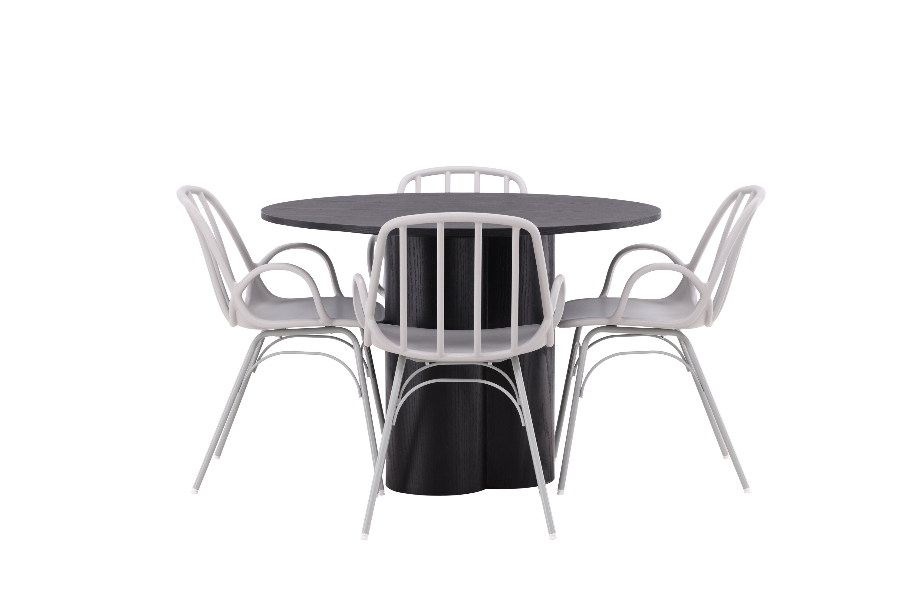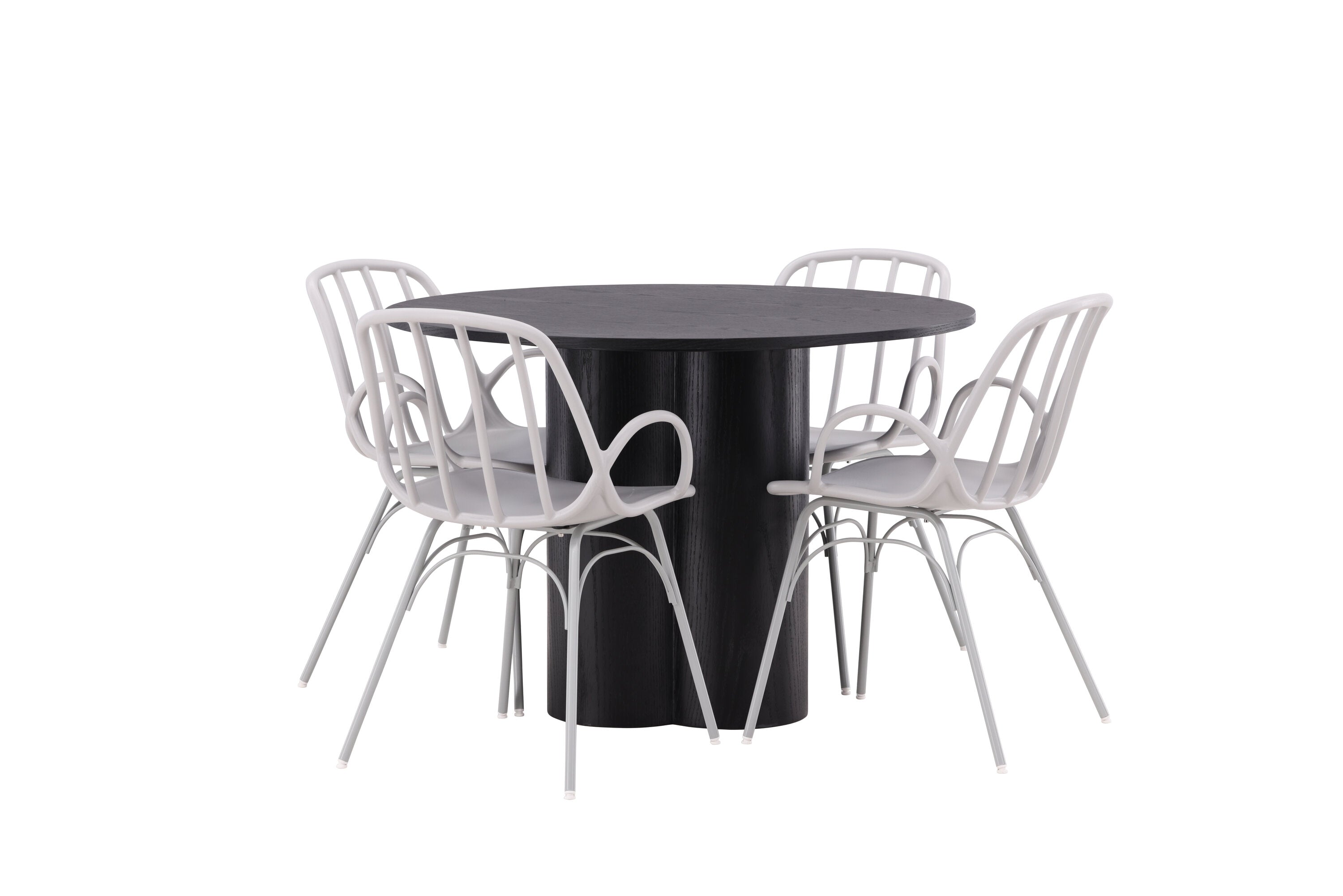 Je to zápas! Vychutnejte si příjemná jídla u našeho oblíbeného jídelního stolu Olivia. Stůl má celý holistický design v černé MDF s tenkou, kulatou deskou a třemi nohami ve tvaru válce, které jsou shromážděny pod středem stolu. Barva má na dýhované desce světlý obal, díky kterému je viditelný vzor materiálu. Zde společně s odolnými jídelními židlemi ze série Dyrön. Tato židle má detailní design se zakřivenými tvary, integrovanými područkami a rozšířenými nohami, důsledně vyrobena z odolného plastu a oceli v štíhlé šedé barvě. Vytvořte si moderní poutač v obývacím pokoji!