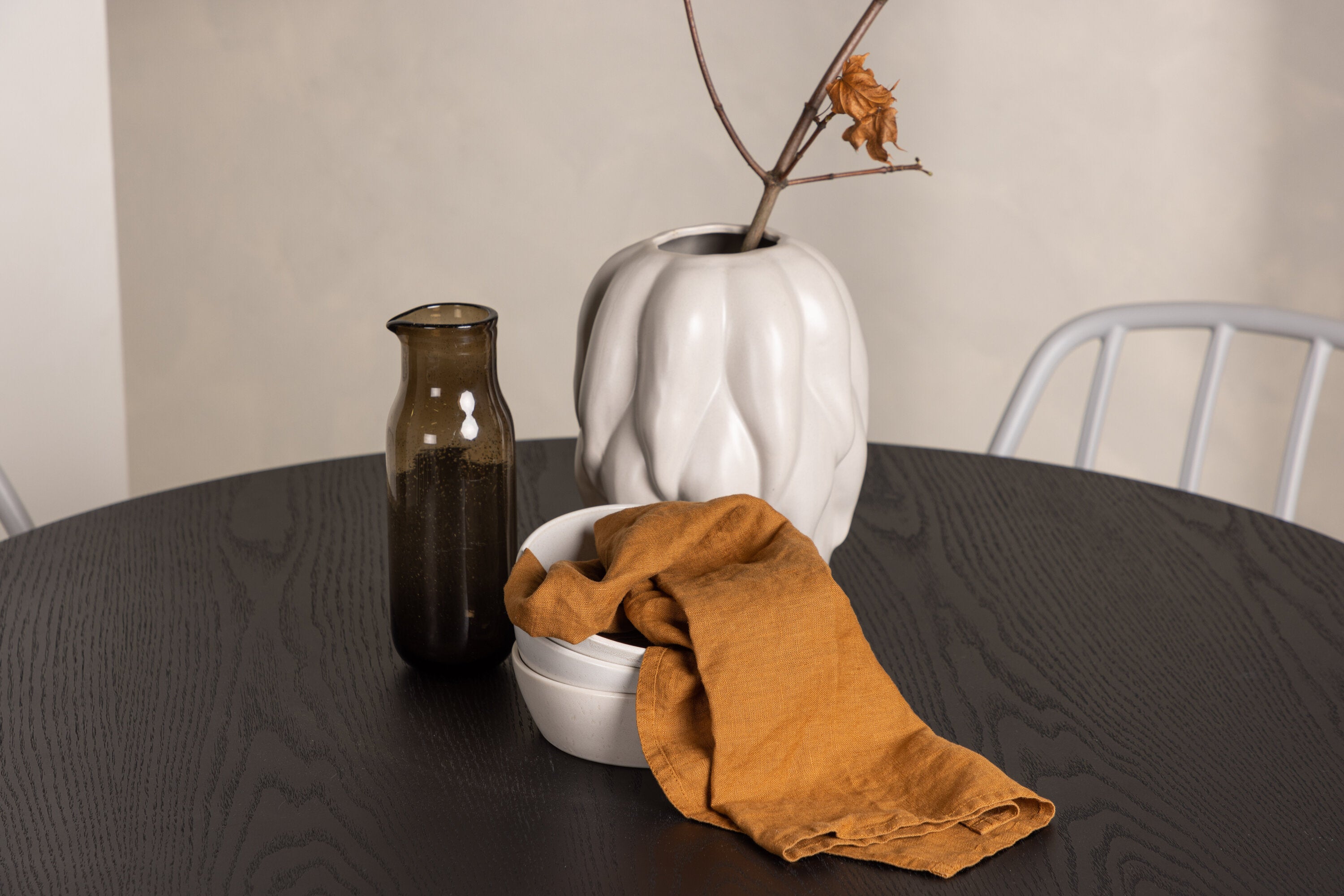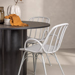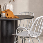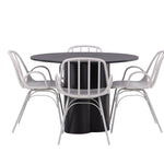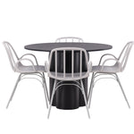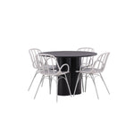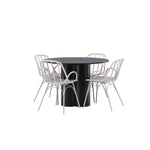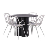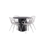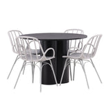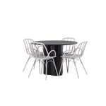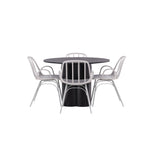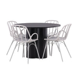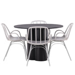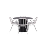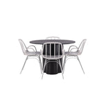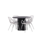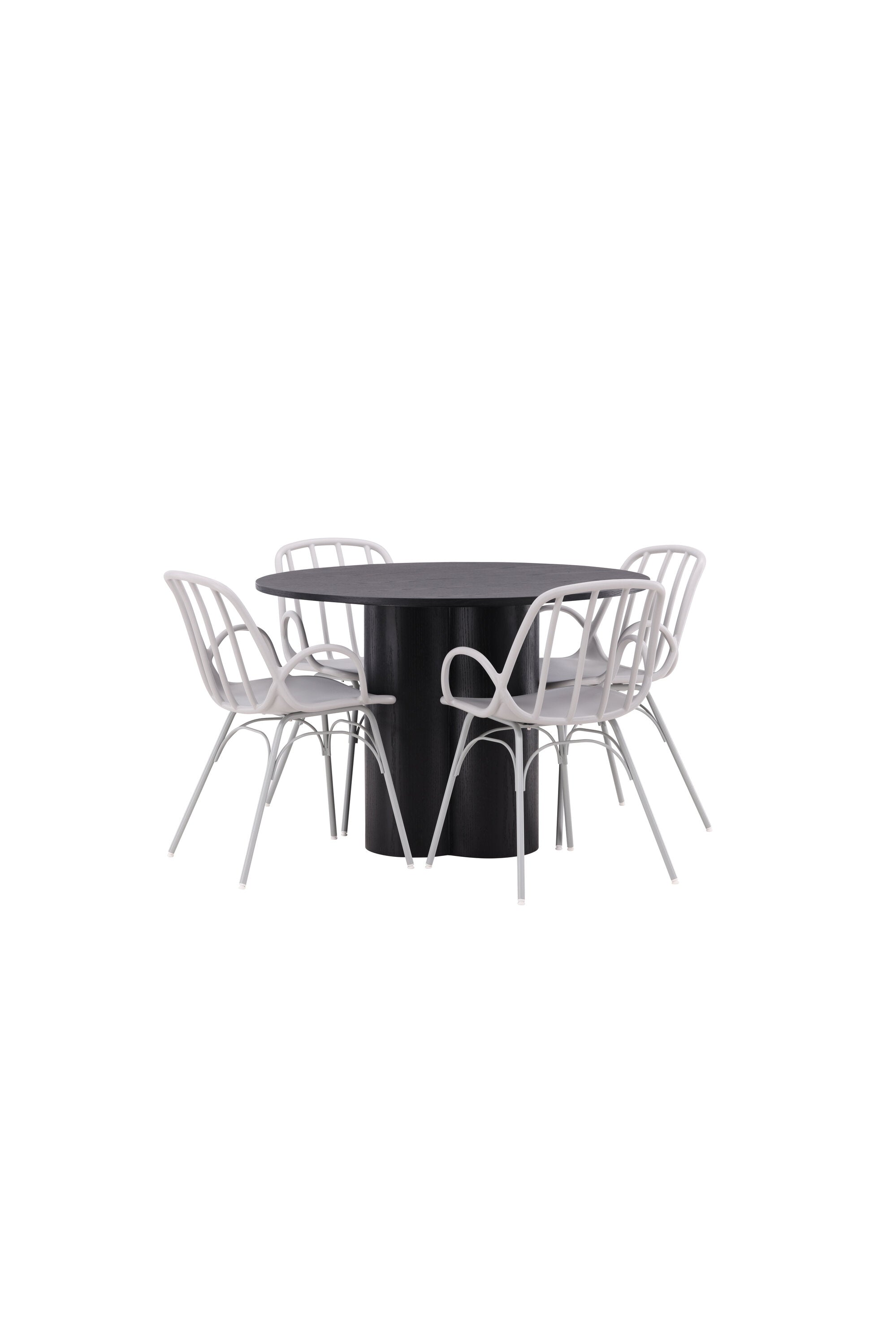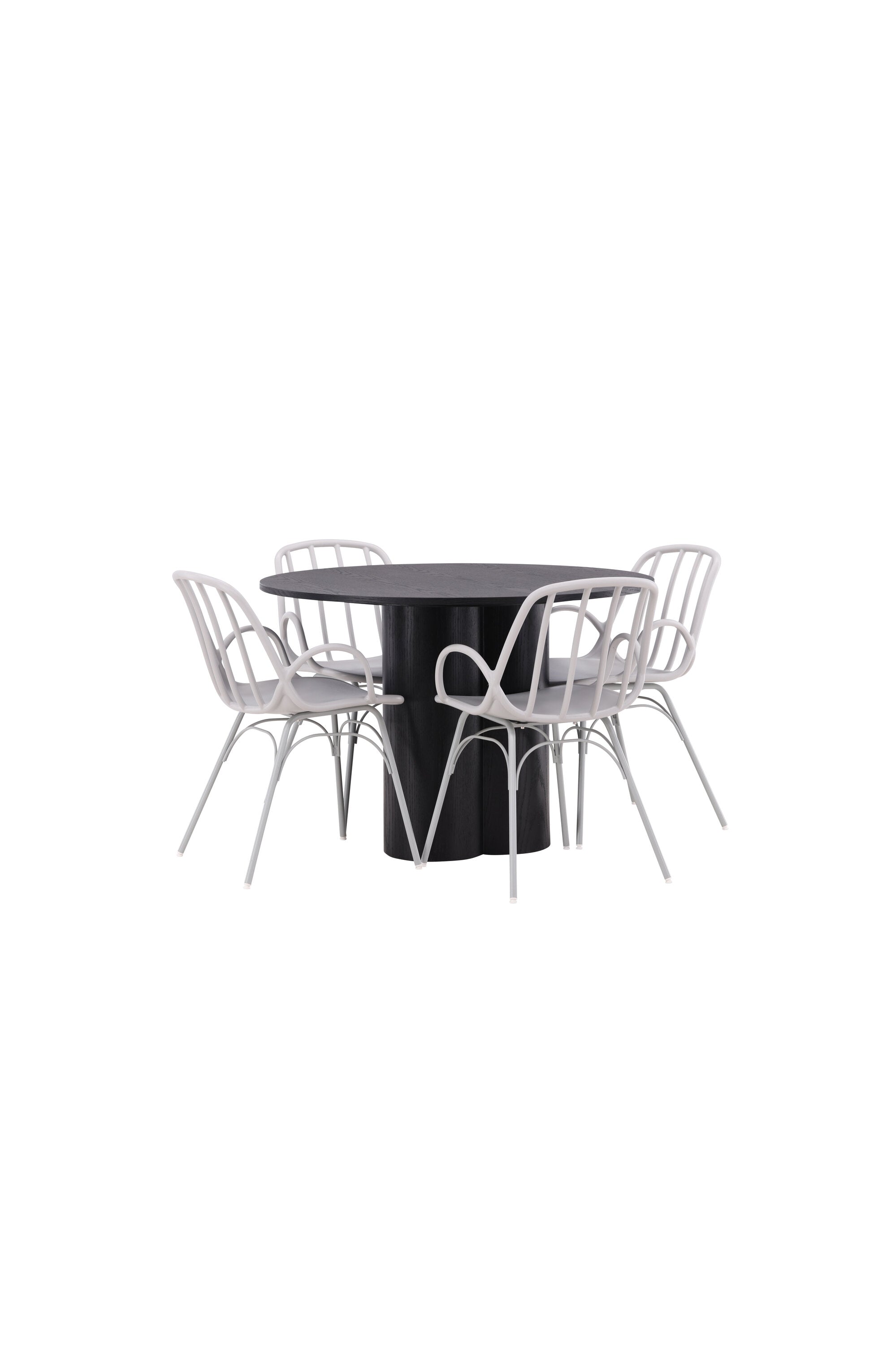 Je to zápas! Vychutnejte si příjemná jídla u našeho oblíbeného jídelního stolu Olivia. Stůl má celý holistický design v černé MDF s tenkou, kulatou deskou a třemi nohami ve tvaru válce, které jsou shromážděny pod středem stolu. Barva má na dýhované desce světlý obal, díky kterému je viditelný vzor materiálu. Zde společně s odolnými jídelními židlemi ze série Dyrön. Tato židle má detailní design se zakřivenými tvary, integrovanými područkami a rozšířenými nohami, důsledně vyrobena z odolného plastu a oceli v štíhlé šedé barvě. Vytvořte si moderní poutač v obývacím pokoji!