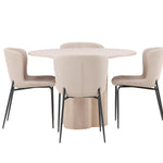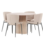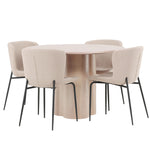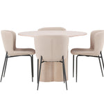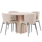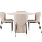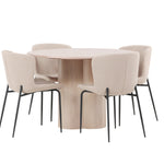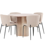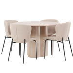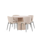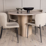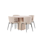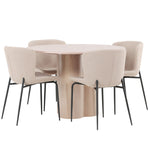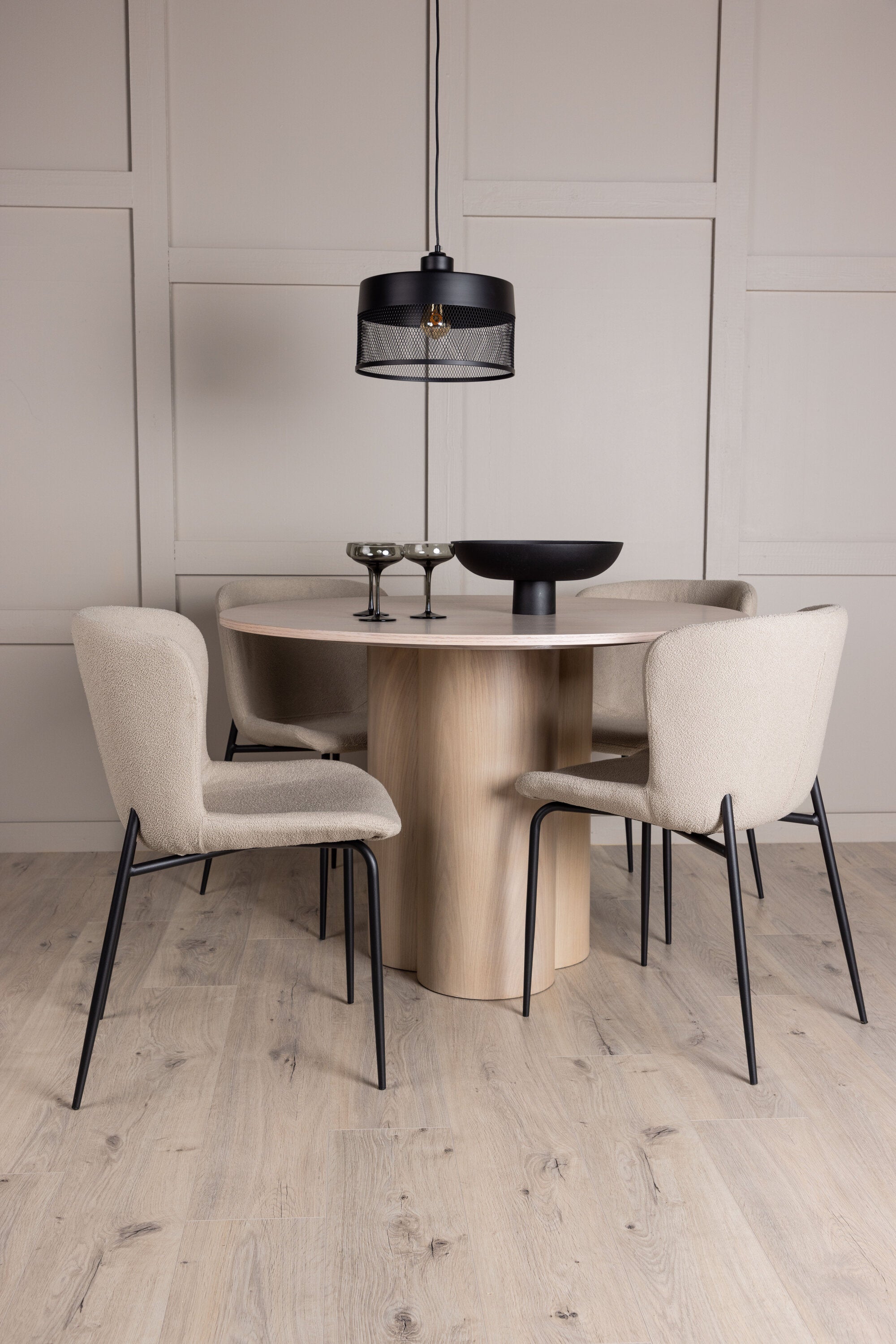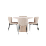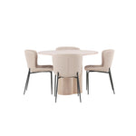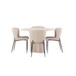Stylové, lákavé a luxusní! Tato skupina potravin zaujme svým skandinávským designem a moderními formami. Jídelní stůl ze série Olivia má konzistentní celkový design z bílé omítnuté MDF desky s tenkou, kulatou horní deskou a třemi válcovými nohami, které jsou shromážděny pod středem stolu. Zde společně se 4 jídelními židlemi ze série Modesto. Židle je celá oblečená v béžové chlupaté látce bouclé se stylovou úzkou nohou židle v černém kovu. Mírně zaoblená záda a sedák poskytuje extra pohodlí a rozšiřuje příjemné jídlo kolem jídelního stolu!