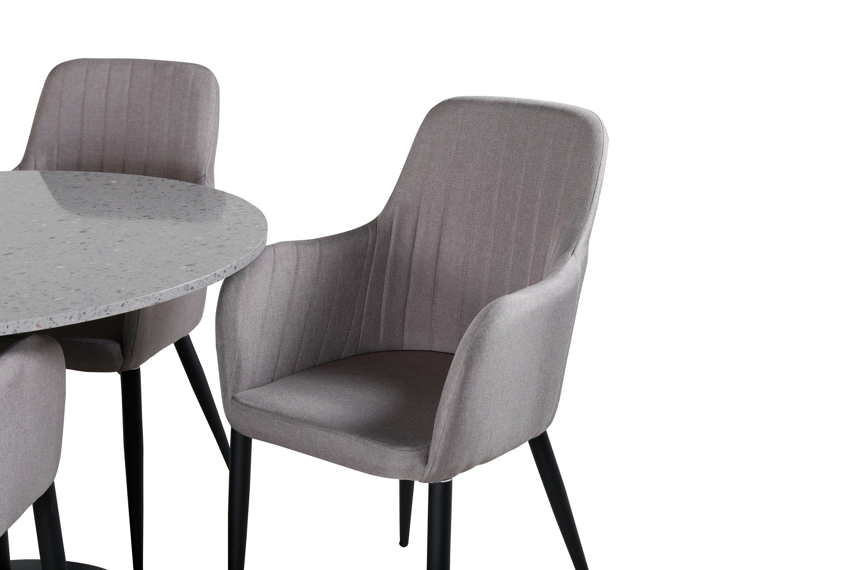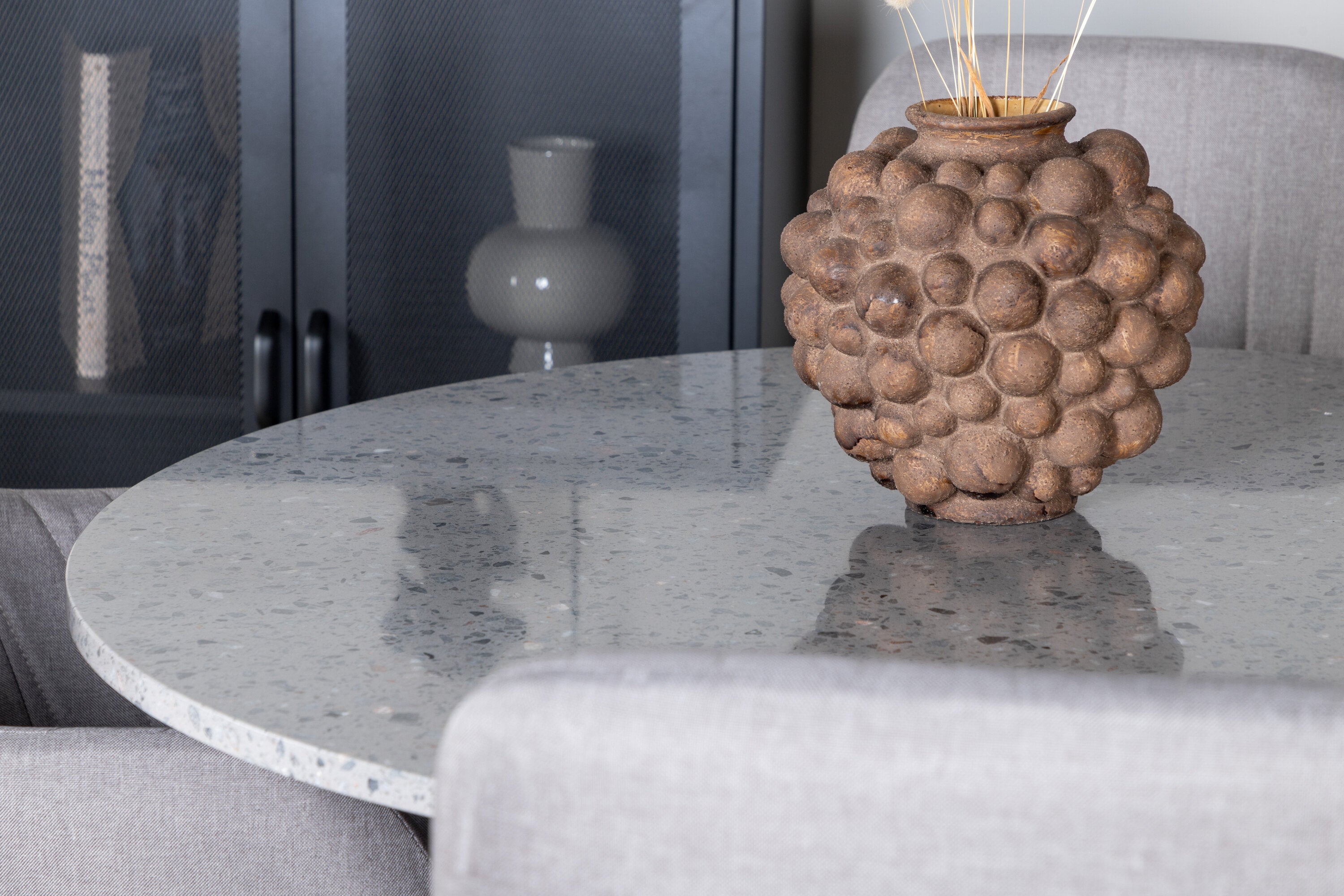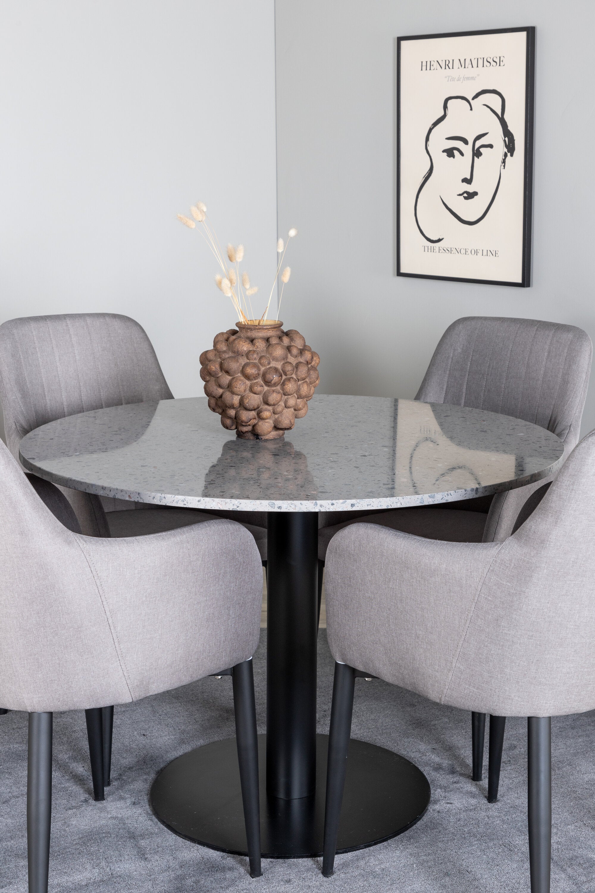Robustní design se zde snoubí s úhlednými tvary. Razzia je náš kulatý jídelní stůl z krásného terazza s šedým povrchem a rámem z černého kovu. Kulatá deska stolu působí v místnosti útulným a příjemným dojmem – zde nikdo nekončí na okraji! Zde v dokonalé kombinaci s jídelními židlemi ze série Comfort. Židle má celopotahový design v šedé polyesterové látce a dekorační stehy na vnitřní straně opěradla a područek, které se mění v pěkný detail. Nohy jsou z kovu s černou práškovou barvou. Posaďte se pohodlně a zvou!