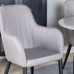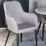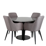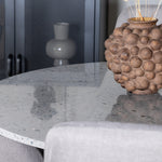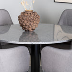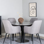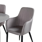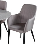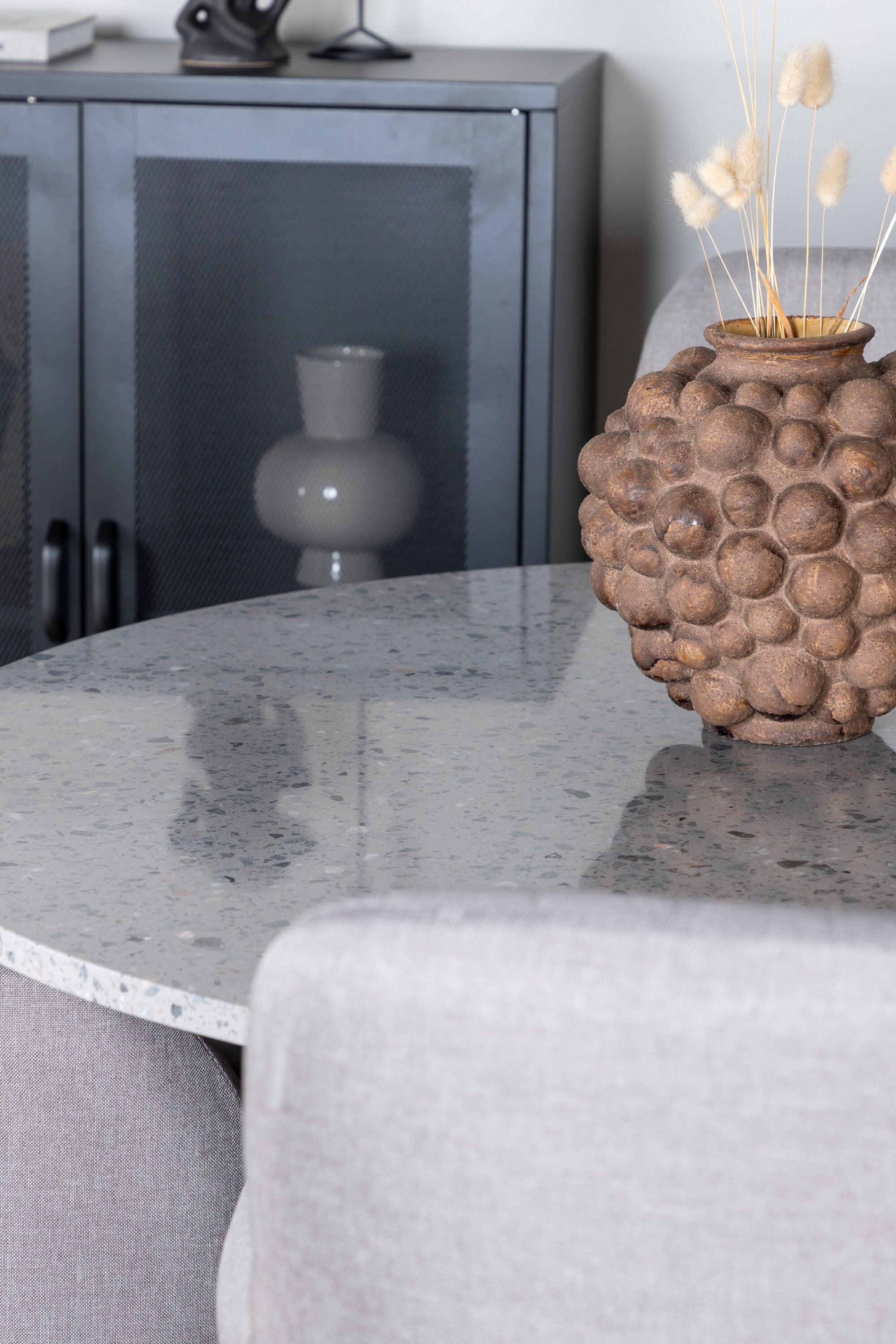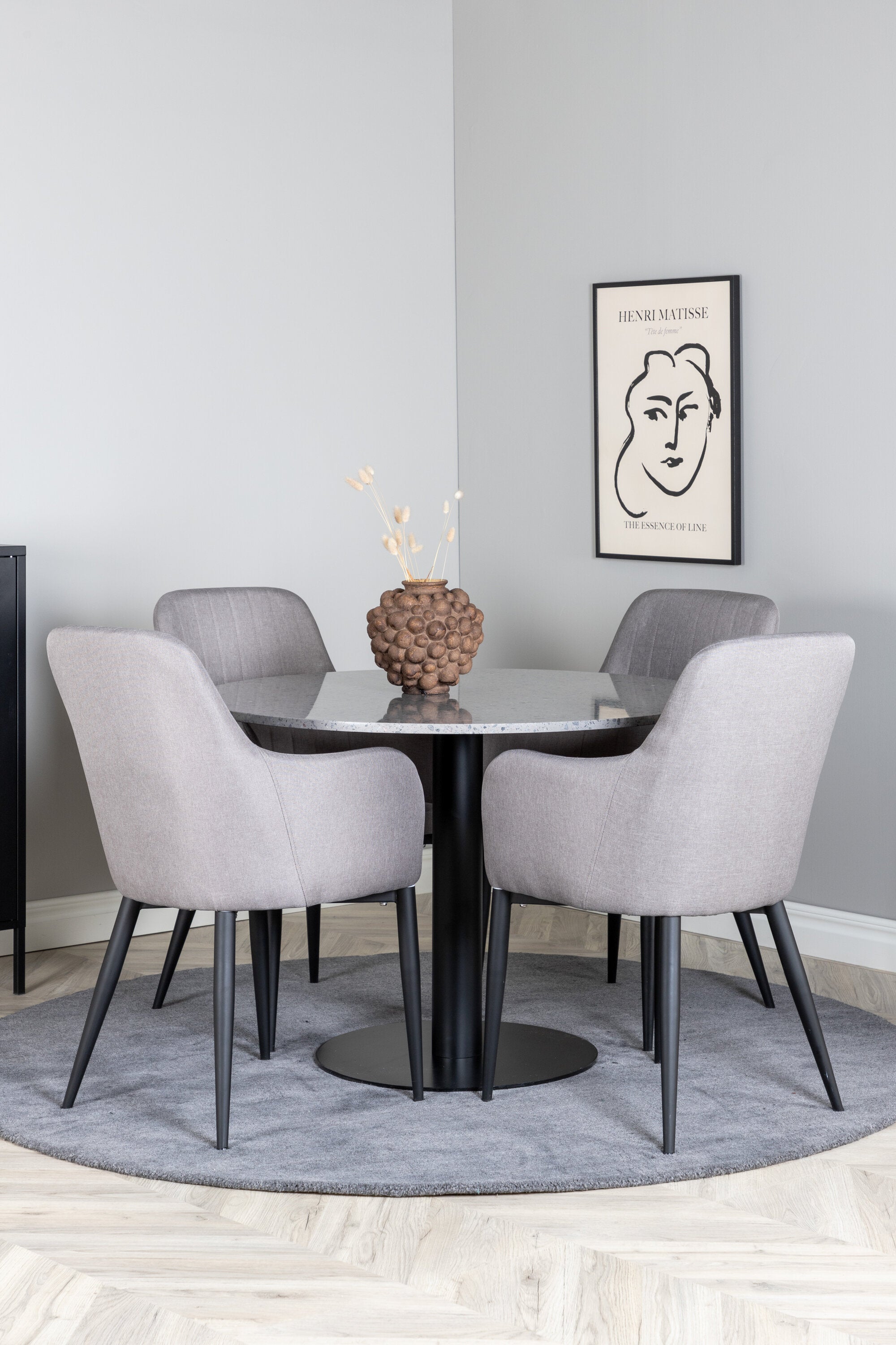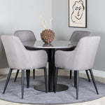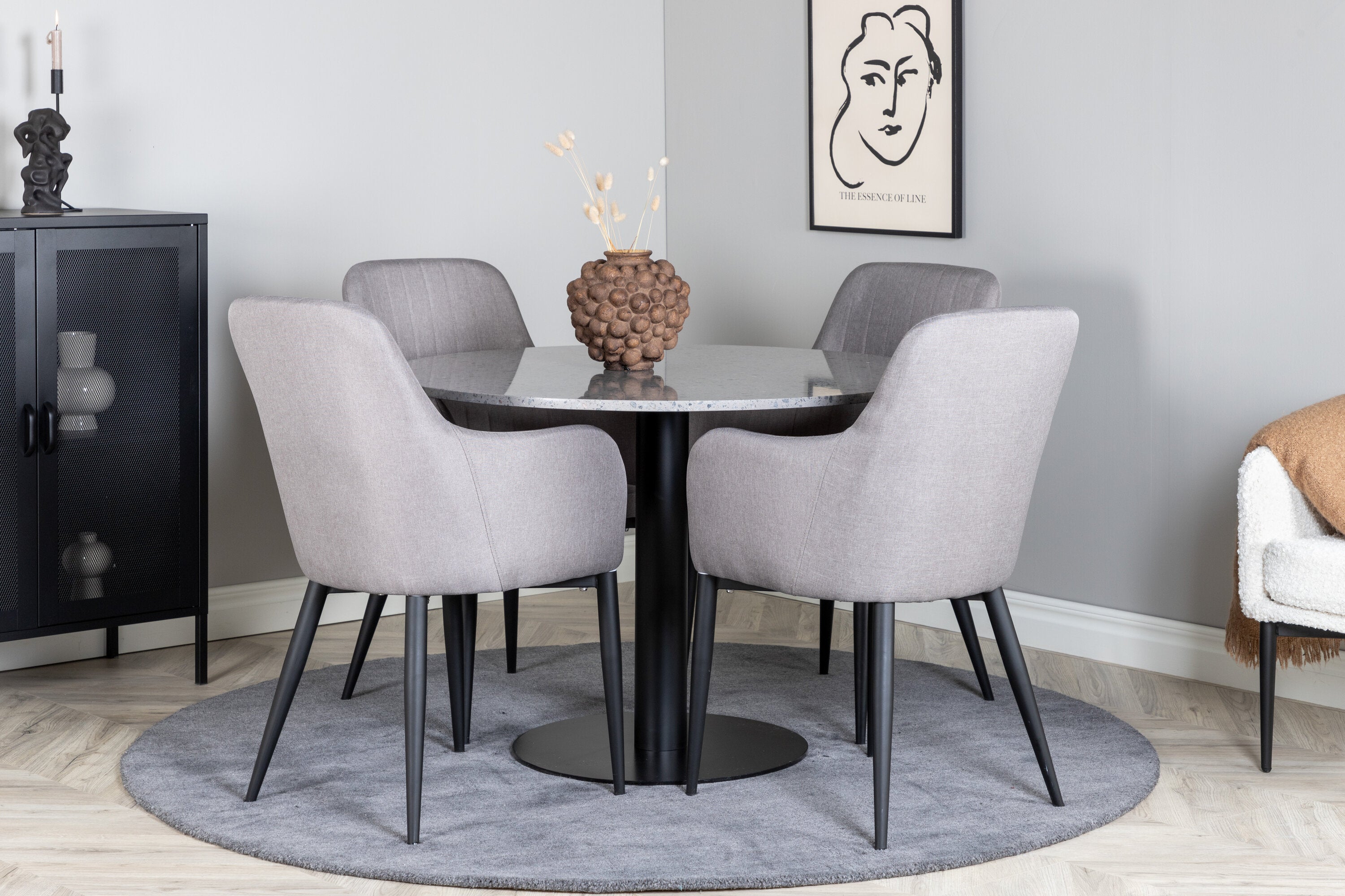 Robustní design se zde snoubí s úhlednými tvary. Razzia je náš kulatý jídelní stůl z krásného terazza s šedým povrchem a rámem z černého kovu. Kulatá deska stolu působí v místnosti útulným a příjemným dojmem – zde nikdo nekončí na okraji! Zde v dokonalé kombinaci s jídelními židlemi ze série Comfort. Židle má celopotahový design v šedé polyesterové látce a dekorační stehy na vnitřní straně opěradla a područek, které se mění v pěkný detail. Nohy jsou z kovu s černou práškovou barvou. Posaďte se pohodlně a zvou!